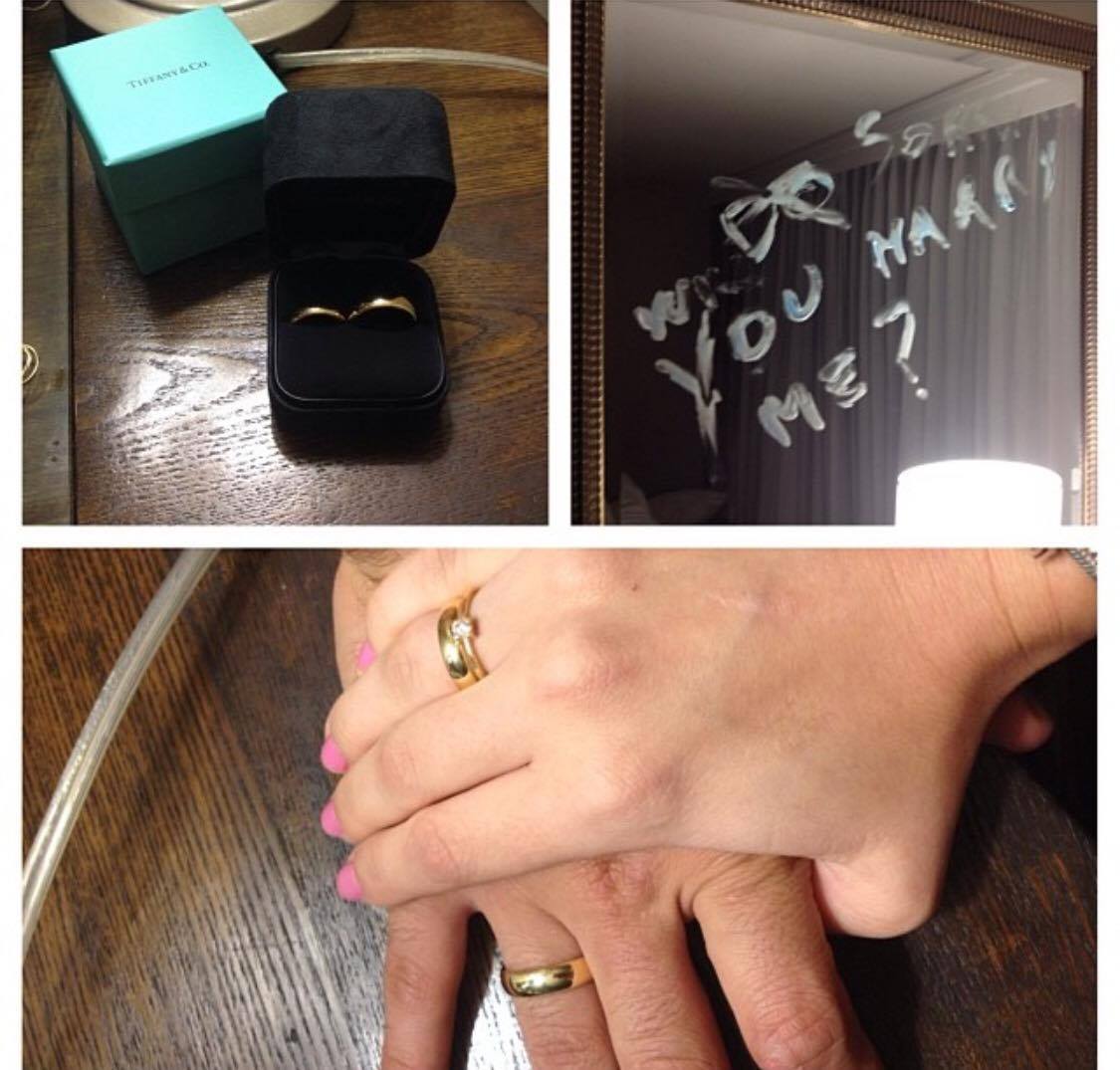 No fim do ano fomos passar o réveillon em Miami e no dia 01/01/2014 ele me pediu em casamento. Eu tava no banho, acabada de andar o dia inteiro. Saí do chuveiro e eu ouvia uma barulho que eu achava que vinha do ralo então fiquei uns bons minutos tentando decifrar da onde vinha… Quando finalmente abri a porta ele tava la ajoelhado (sabe-se lá ha quanto tempo) e o barulho era o celular dele que ele colocou um barulho pra eu achar que ele tava roncando hahaha… Enfim, ele tava ajoelhado segurando a caixinha azul e no espelho estava escrito “will you marry me?” com pasta de dente. Nos casamos dia 13/12/2014!”