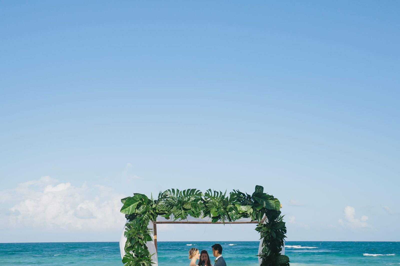 Dia 28 de maio nos casamos no hotel onde estávamos todos hospedados – Ahau. A cerimônia foi pé na areia e começou às 17h30, logo antes do pôr do sol. Apesar de ser judia, optamos por uma cerimonia não religiosa, bem pessoal e simbólica. Nossa melhor escolha foi pedir para os convidados não usarem o celular durante a cerimônia para que todos estivessem super presentes e atentos no momento curtindo a música, a troca de palavras, o sol poente e o mar azul maravilhoso. Logo após a cerimônia, servimos drinks, muitos cocos para hidratar e petiscos enquanto uma banda local tocava ao vivo. Após o “cocktail hour”, todos se sentaram para jantar e nossos pais se levantaram para dar um discurso e logo convidamos todos para virar um shot de tequila juntos e partir para a pista.