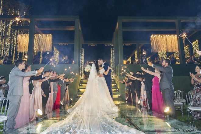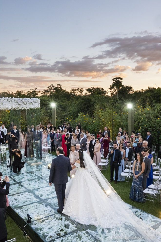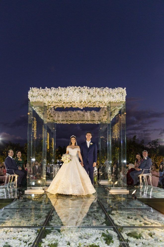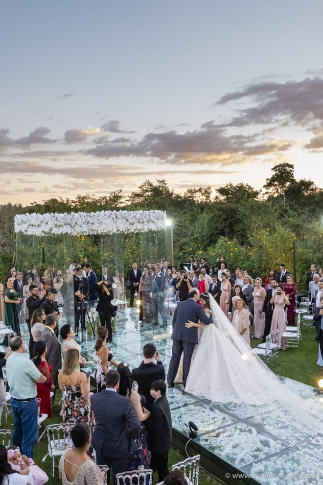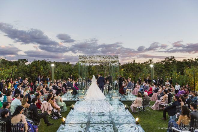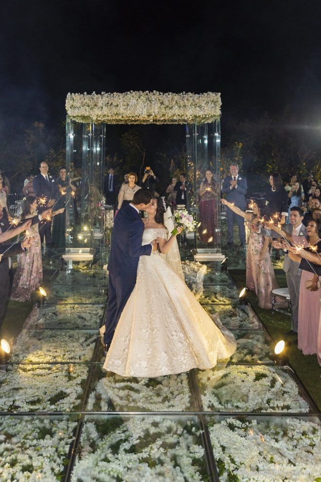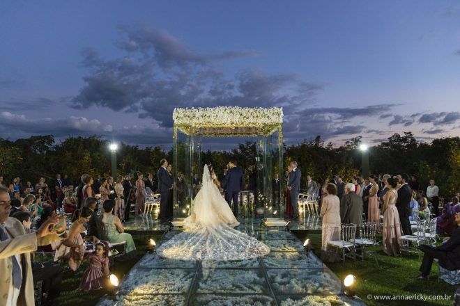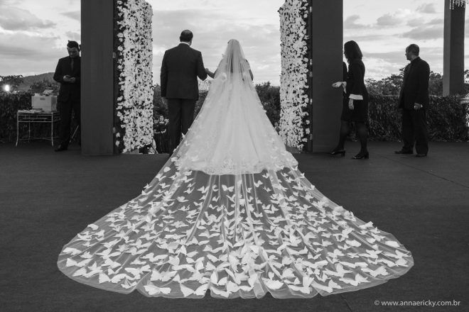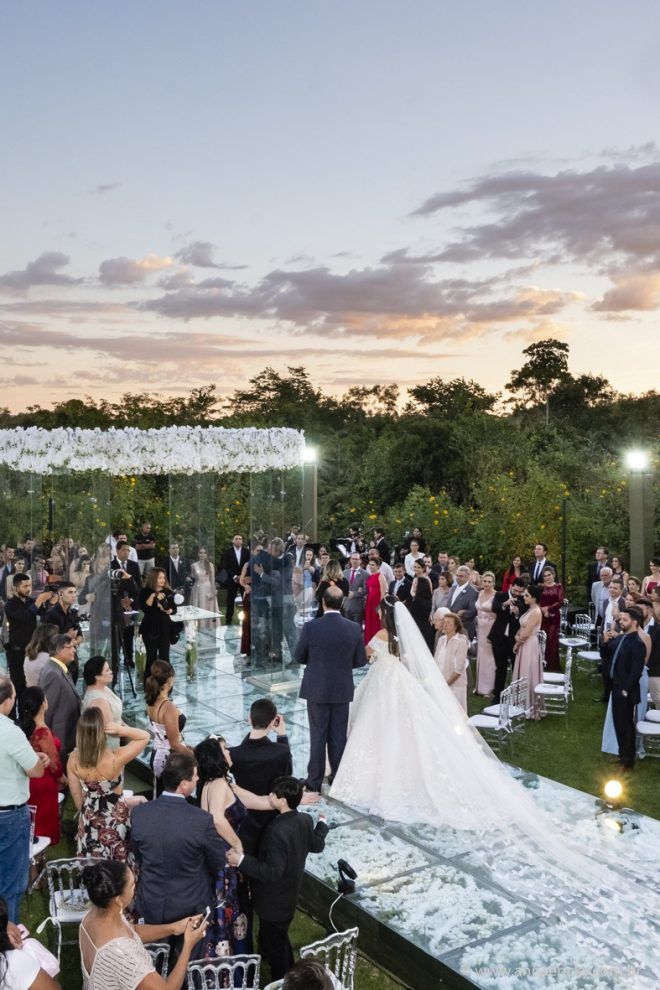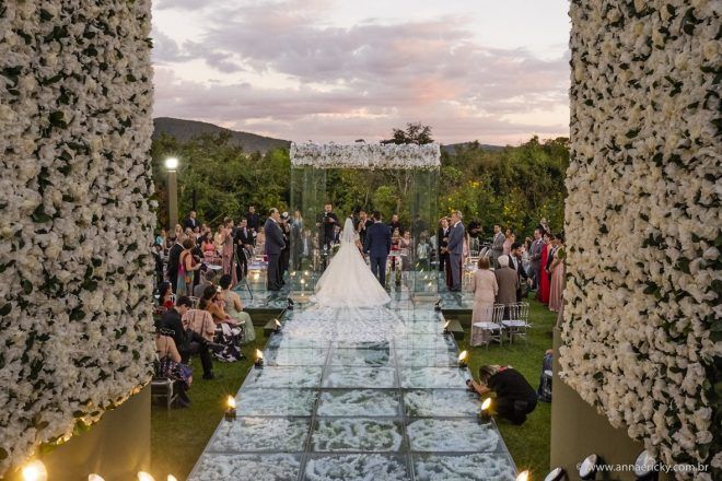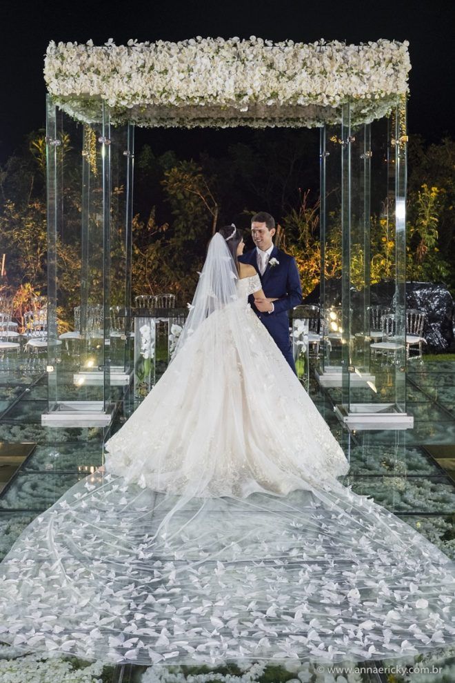 Que alegria poder receber tantos casamentos lindos aqui no blog. Como não amar?! O de hoje está tããão lindo, com noivos super conectados e um cenário impecável. Fiquei encantada com o vestido da noiva e o véu com borboletas. Me digam o que vocês acharam! A passarela transparente, com flores, ficou simplesmente demais. Mas não só a passarela, como a mesa dos convidados também. Que ideia genial! Era literalmente um jardim todo iluminado e mágico. O post está cheio de inspirações, uma mais linda que a outra.