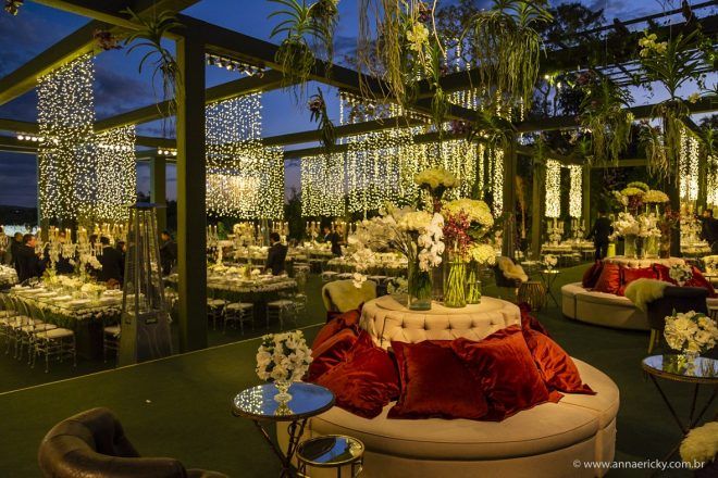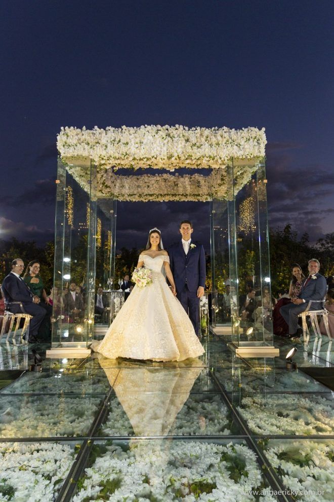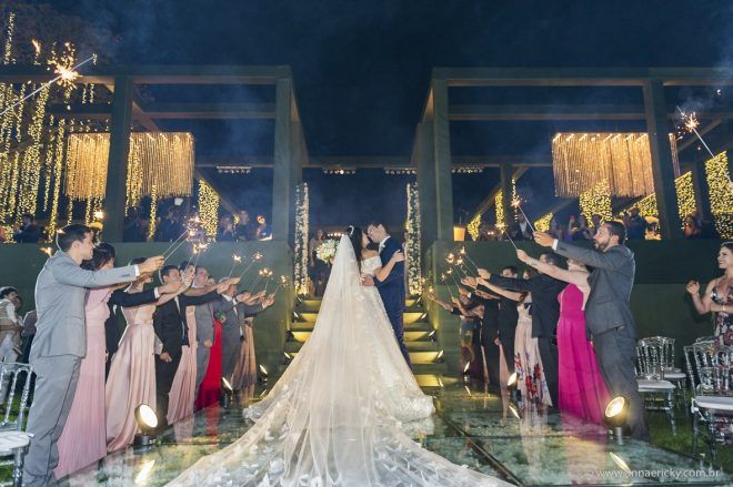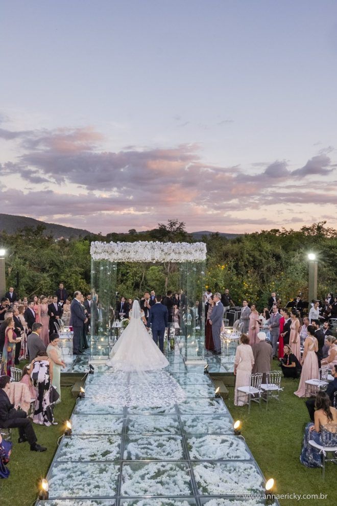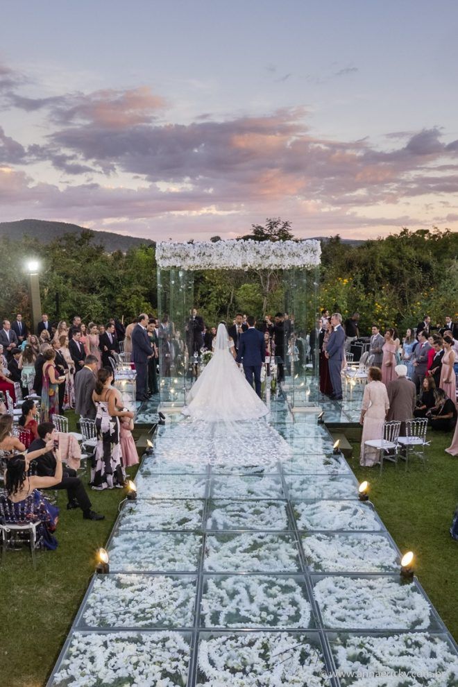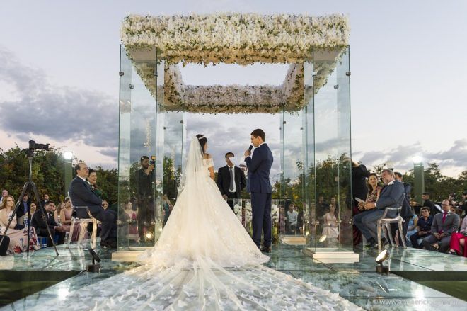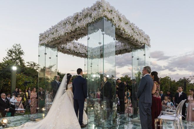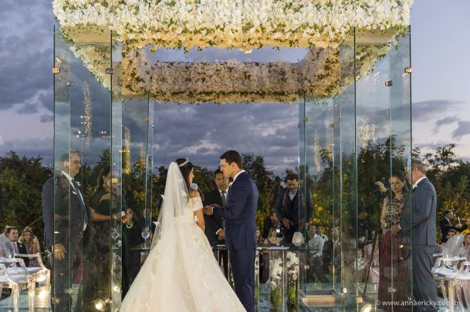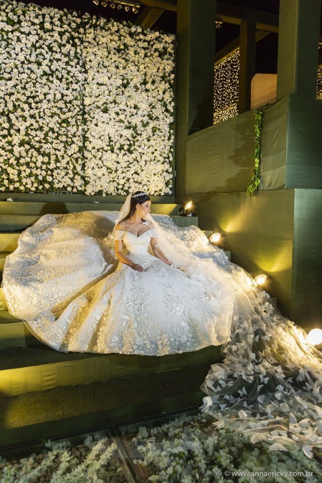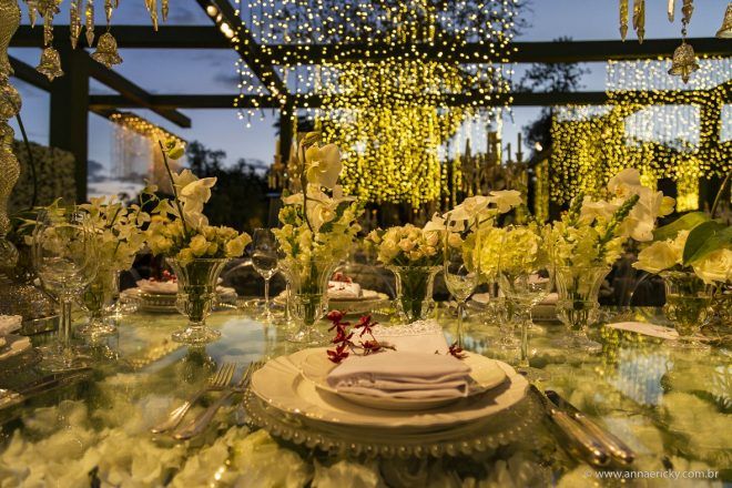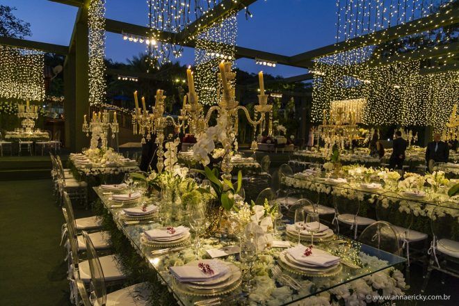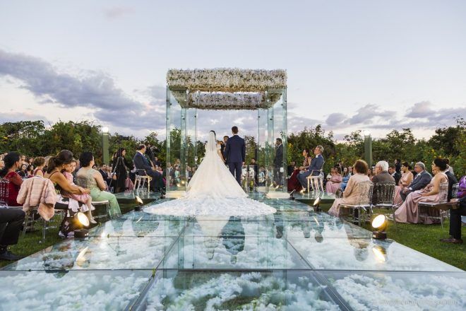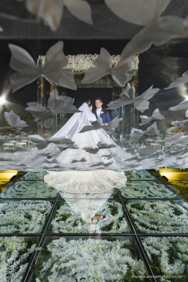 Que alegria poder receber tantos casamentos lindos aqui no blog. Como não amar?! O de hoje está tããão lindo, com noivos super conectados e um cenário impecável. Fiquei encantada com o vestido da noiva e o véu com borboletas. Me digam o que vocês acharam! A passarela transparente, com flores, ficou simplesmente demais. Mas não só a passarela, como a mesa dos convidados também. Que ideia genial! Era literalmente um jardim todo iluminado e mágico. O post está cheio de inspirações, uma mais linda que a outra.