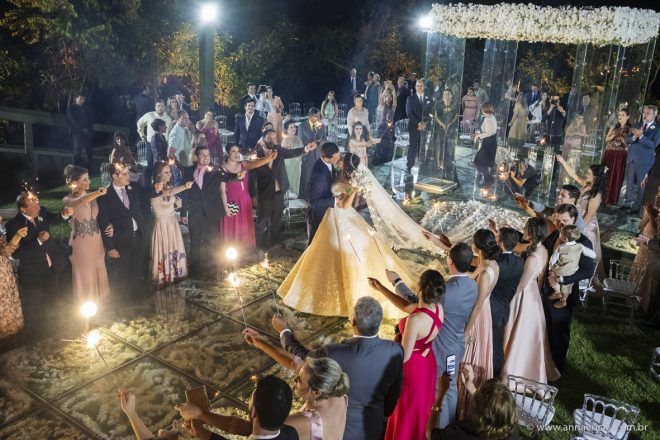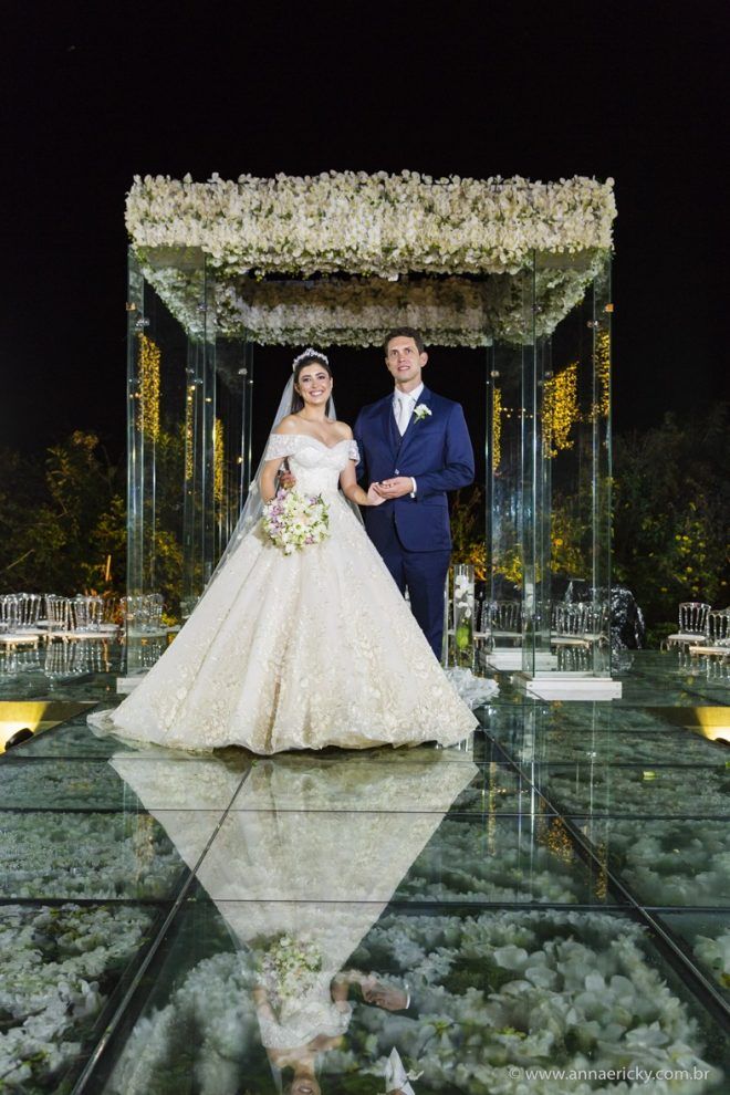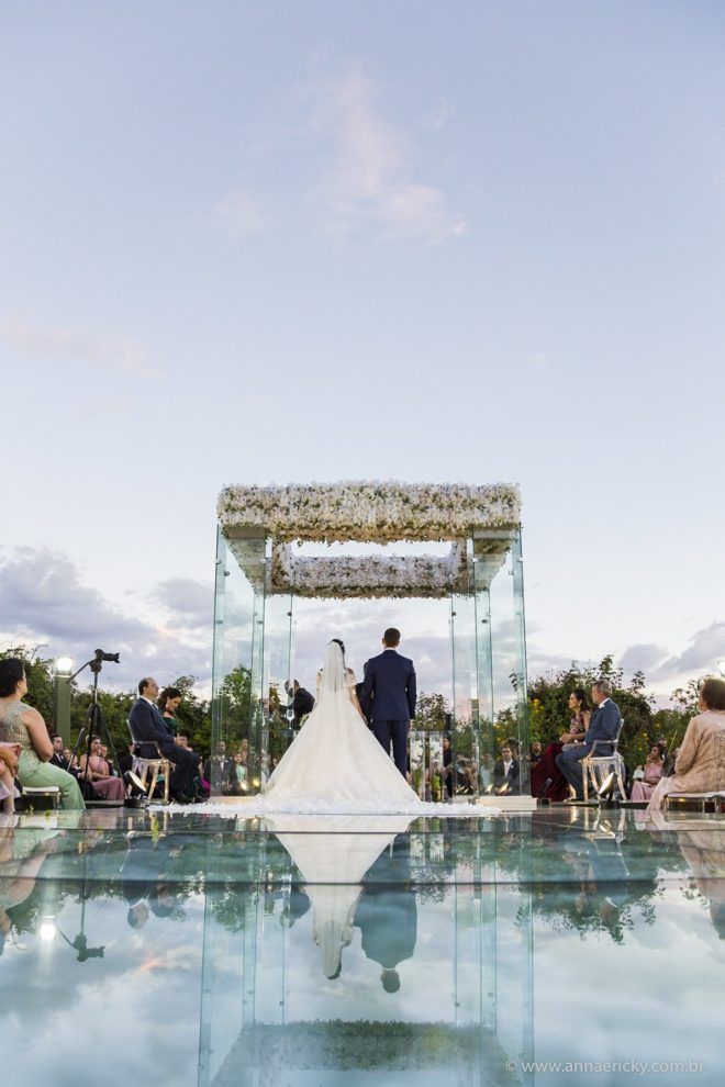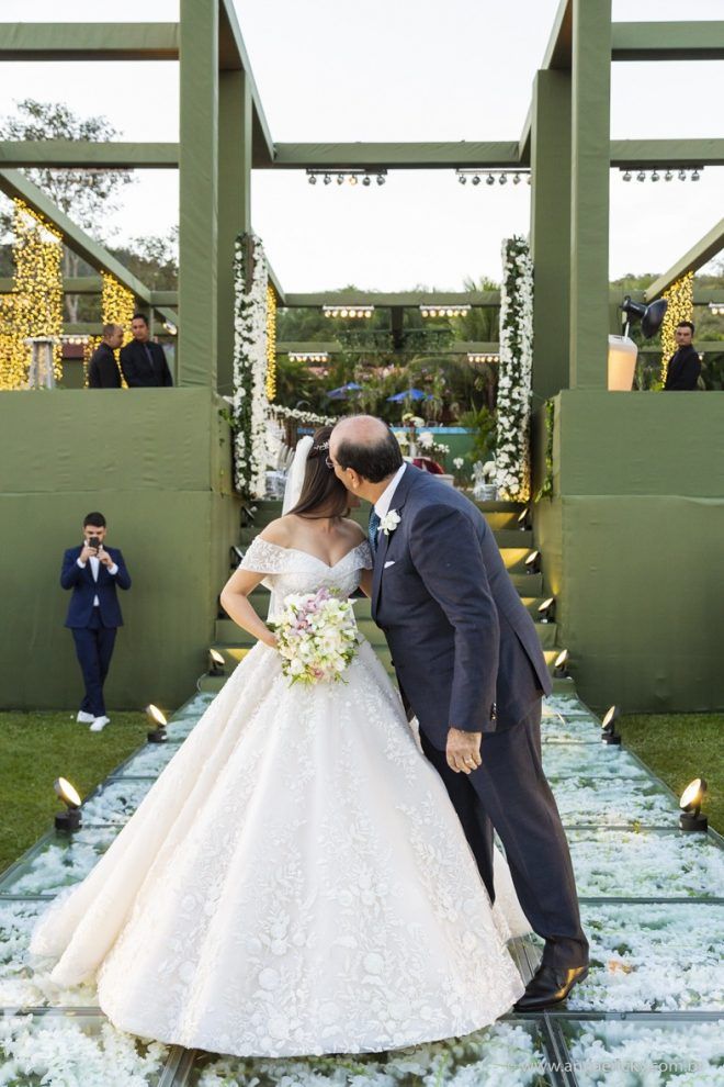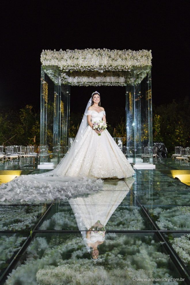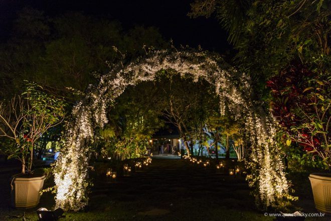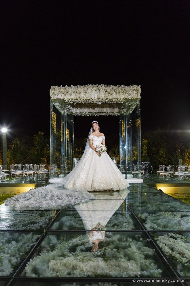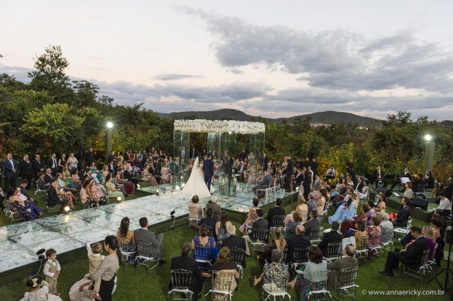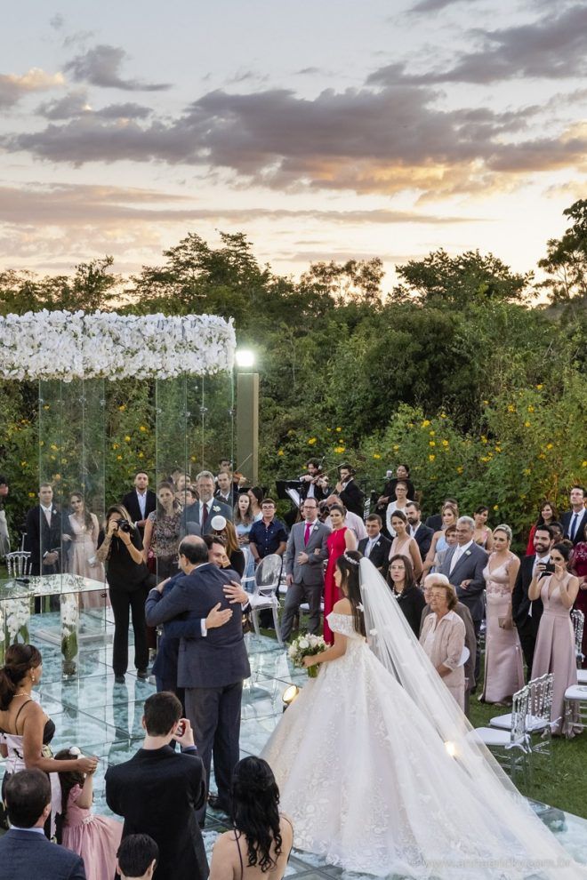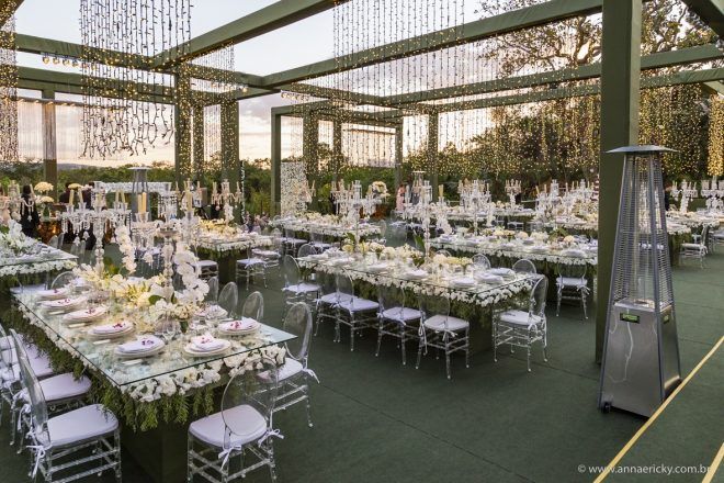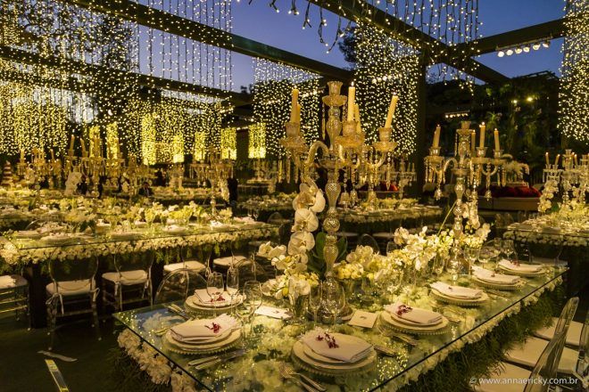 Que alegria poder receber tantos casamentos lindos aqui no blog. Como não amar?! O de hoje está tããão lindo, com noivos super conectados e um cenário impecável. Fiquei encantada com o vestido da noiva e o véu com borboletas. Me digam o que vocês acharam! A passarela transparente, com flores, ficou simplesmente demais. Mas não só a passarela, como a mesa dos convidados também. Que ideia genial! Era literalmente um jardim todo iluminado e mágico. O post está cheio de inspirações, uma mais linda que a outra.