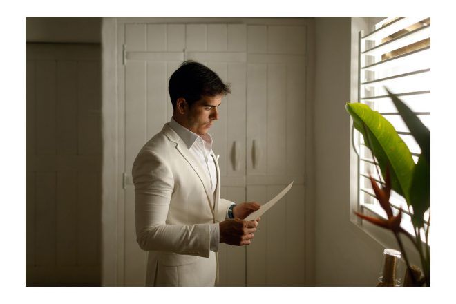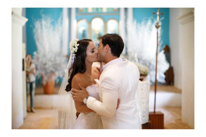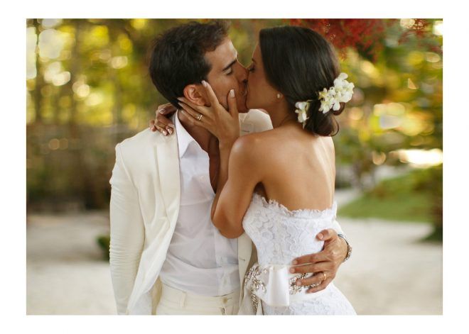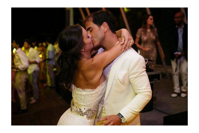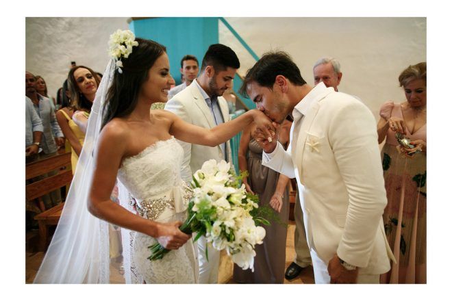 A noiva estava linda, com um vestido bem leve e delicado. Já o noivo optou pelo branco, que fica ótimo em casamentos durante o dia, e usou uma estrela do mar ao invés da flor de lapela. Vejam que ideia legal!