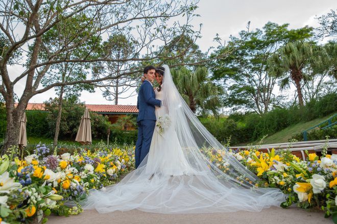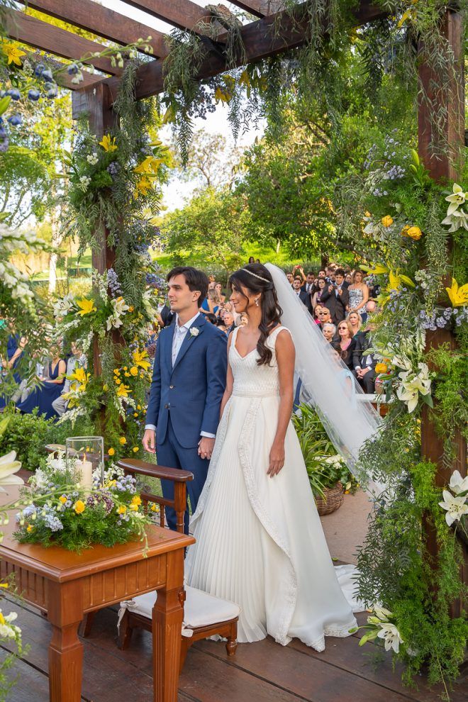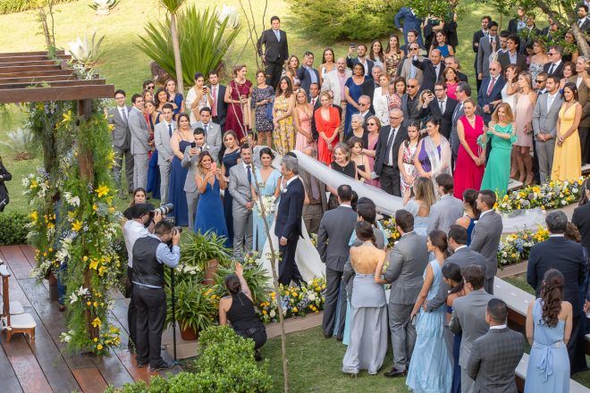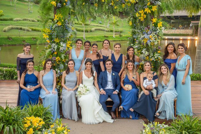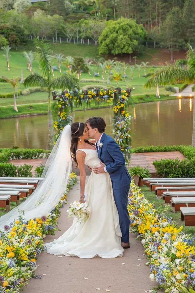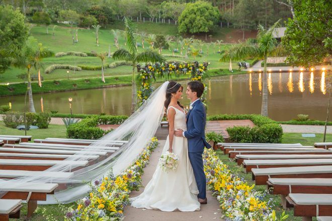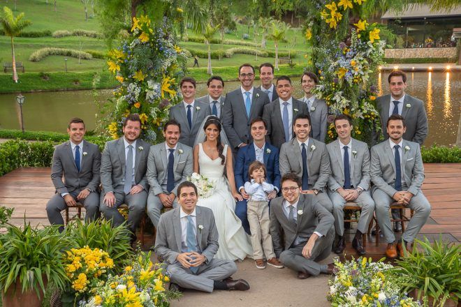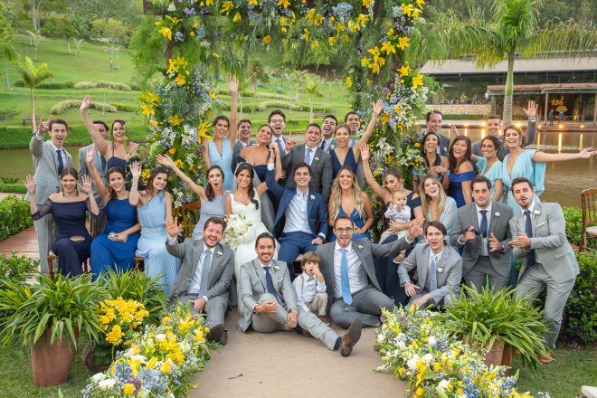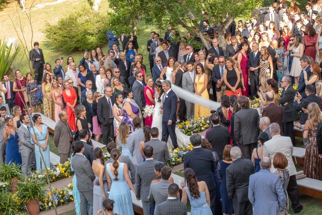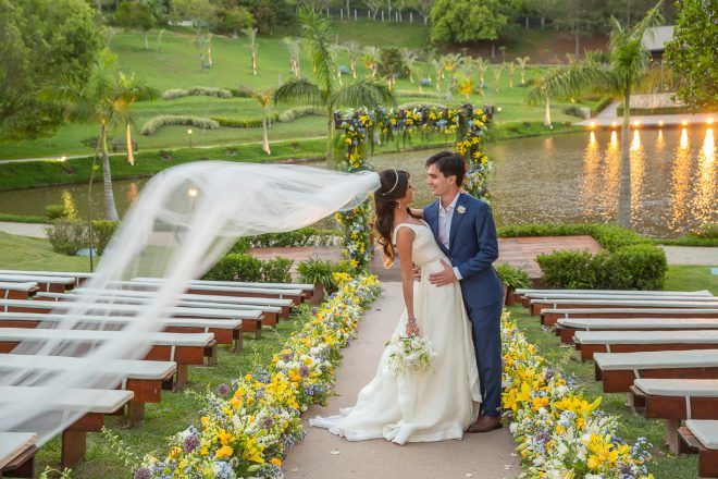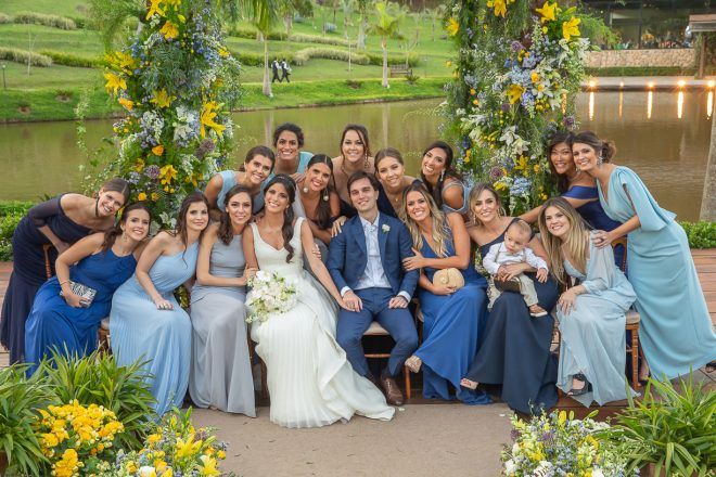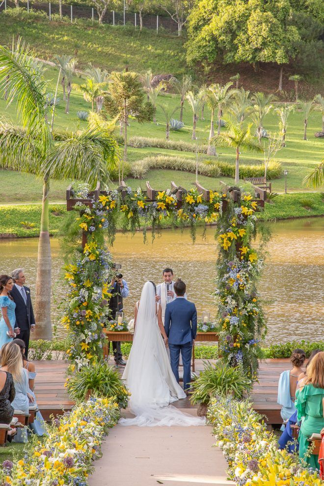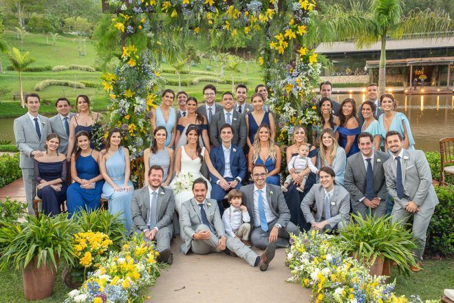 Tivemos uma cerimônia perfeita em um cenário dos sonhos. Flores amarelas trazendo alegria, misturadas ao azul e branco que traziam um pouco de romantismo ao ambiente. A banda e o DJ garantiram o agito da festa por quase 12 horas…