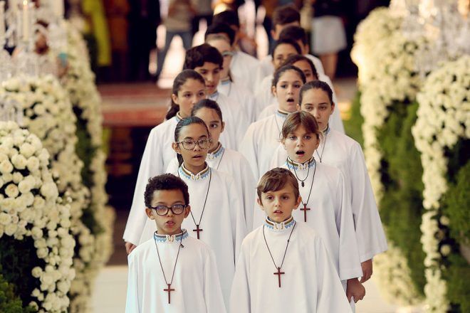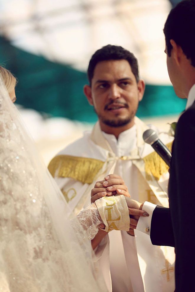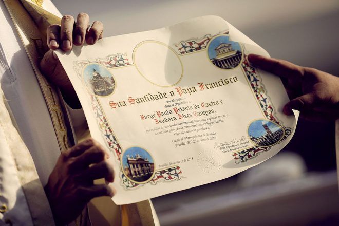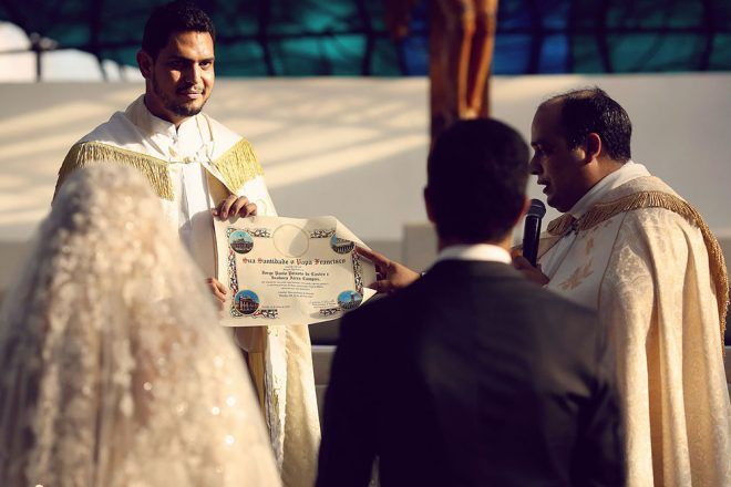 “Recebemos a benção do Papa Francisco que será apresentada em nosso matrimônio pelo Padre Omar Raposo, do Rio de Janeiro e pároco da arquidiocese da Igreja de São José. Ele é amigo pessoal meu, e jantamos sempre que vem Brasília e aplaudo seu engajamento social e filantrópico. O noivo joga futebol com ele semanalmente, e o tem também como amigo estimado.” – Isadora