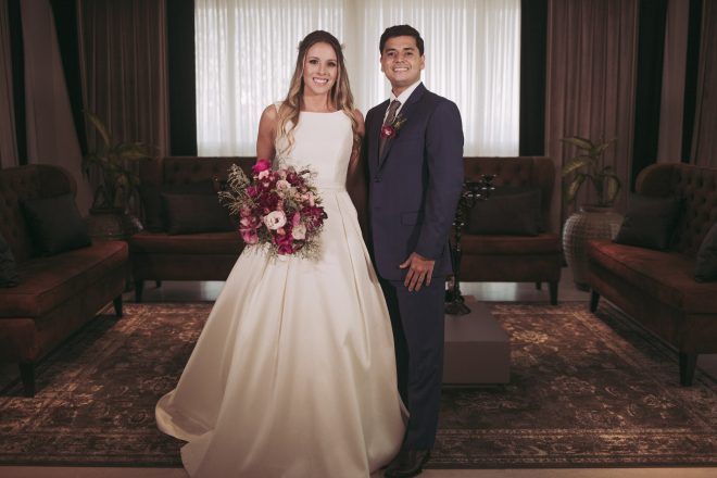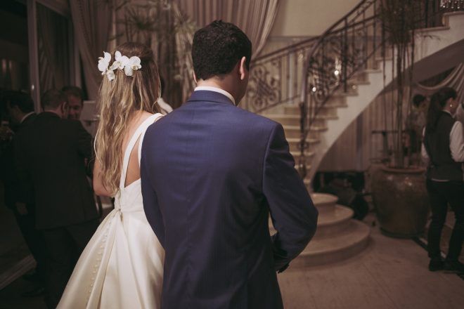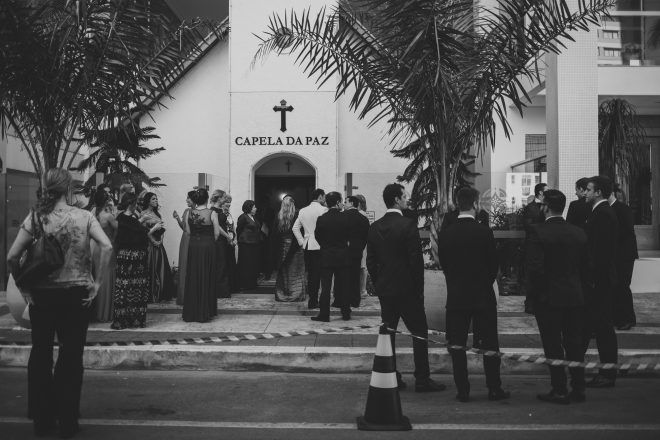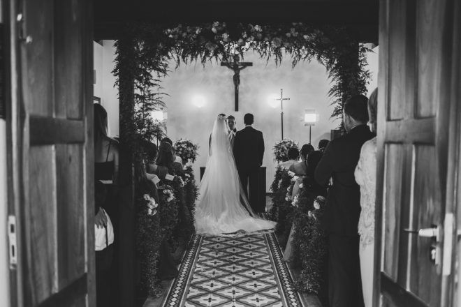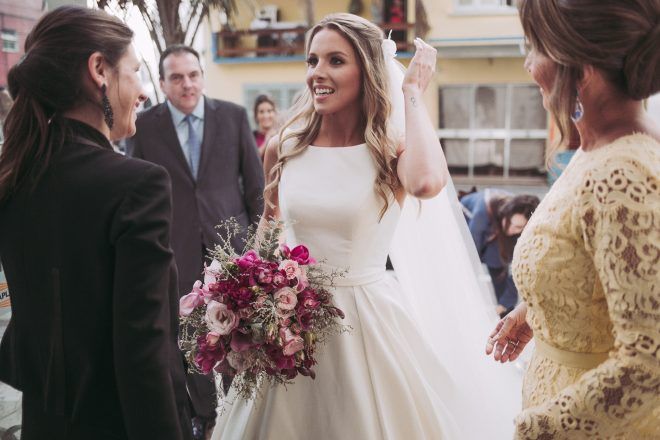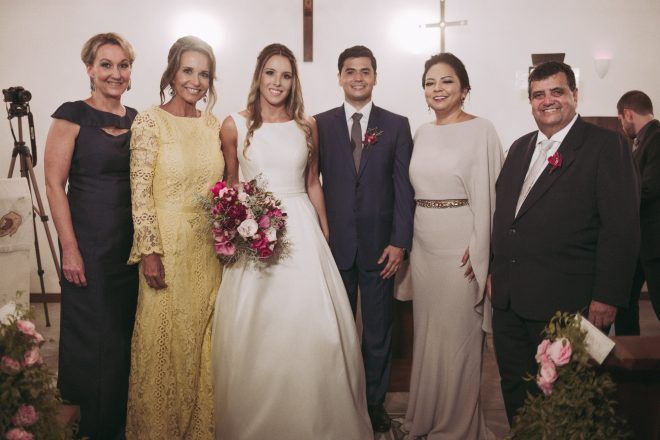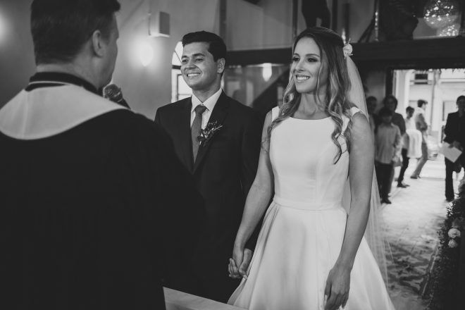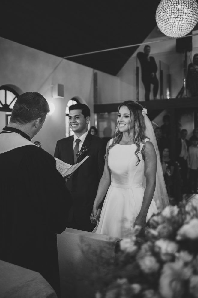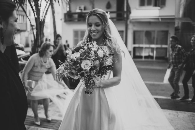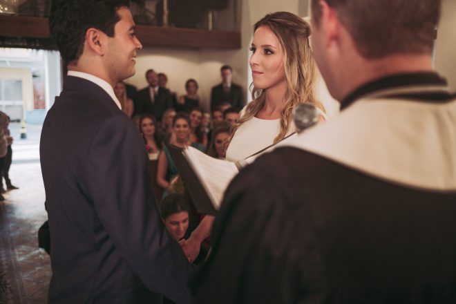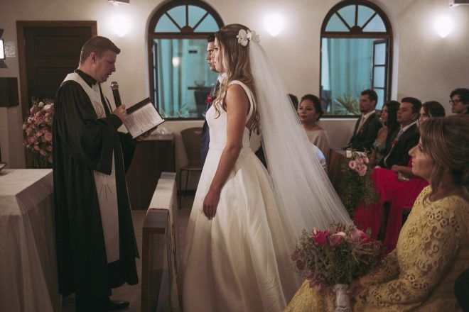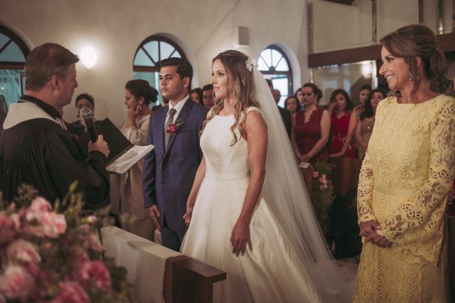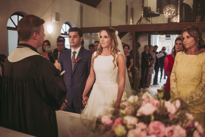 Como eu queria algo mais intimista, optei por fazer a cerimônia religiosa em uma capela que é na mesma rua do edifício que foi feita a festa. Foram convidados somente os familiares mais próximos, pois a capacidade máxima era de 40 pessoas. Foi muito emocionante. A cerimônia civil foi realizada no edifício, pelo mesmo pastor que realizou a religiosa. Quando chegamos na festa, todos convidados já estavam lá nos esperando, e descemos uma escadaria que chegava no salão de festas, diretamente para a cerimônia civil. Depois começou a festa.” – Julia
