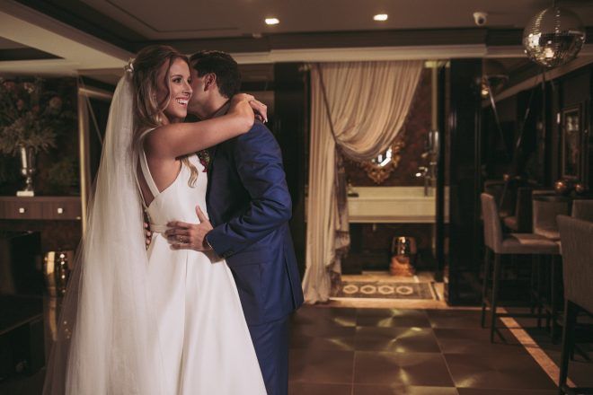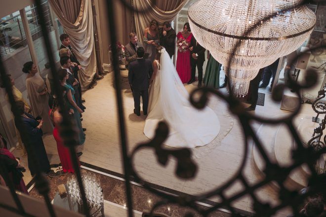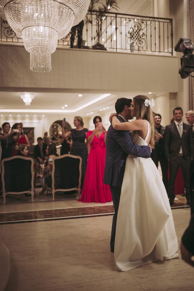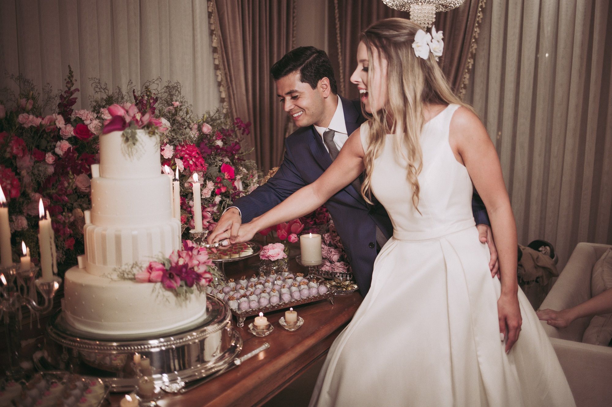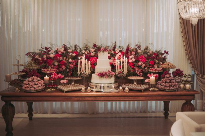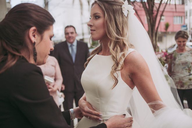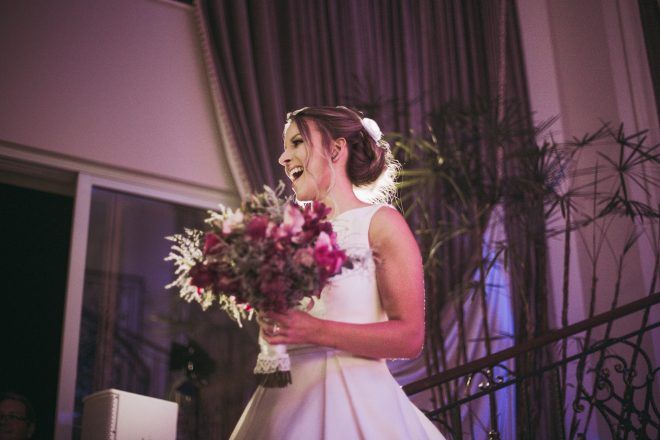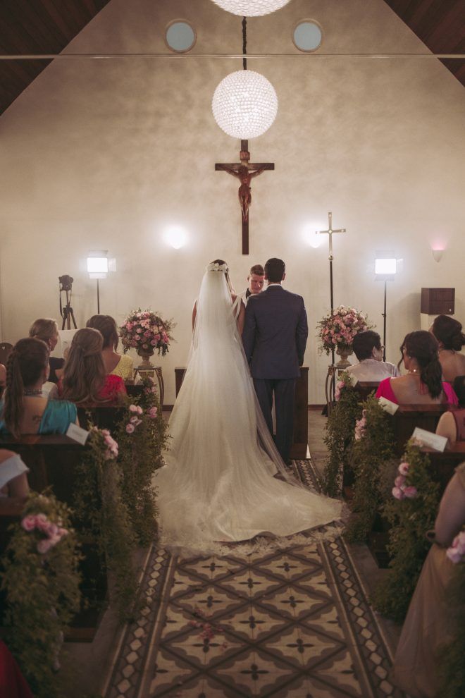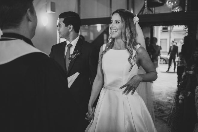 Como eu queria algo mais intimista, optei por fazer a cerimônia religiosa em uma capela que é na mesma rua do edifício que foi feita a festa. Foram convidados somente os familiares mais próximos, pois a capacidade máxima era de 40 pessoas. Foi muito emocionante. A cerimônia civil foi realizada no edifício, pelo mesmo pastor que realizou a religiosa. Quando chegamos na festa, todos convidados já estavam lá nos esperando, e descemos uma escadaria que chegava no salão de festas, diretamente para a cerimônia civil. Depois começou a festa.” – Julia