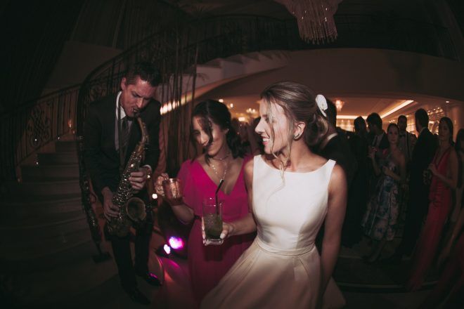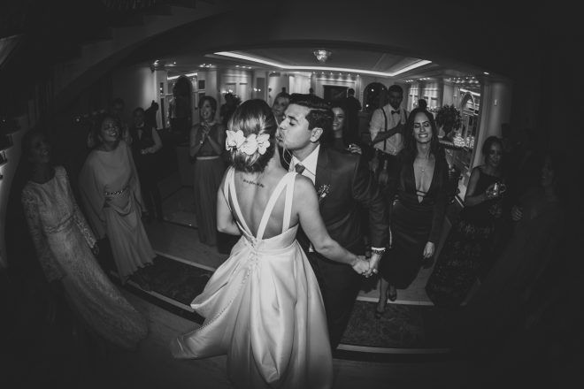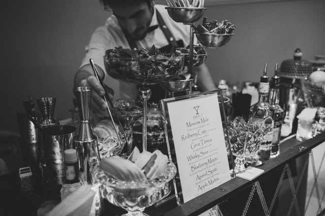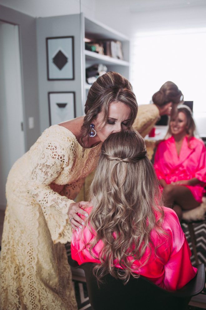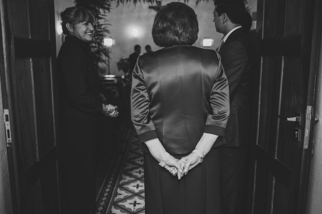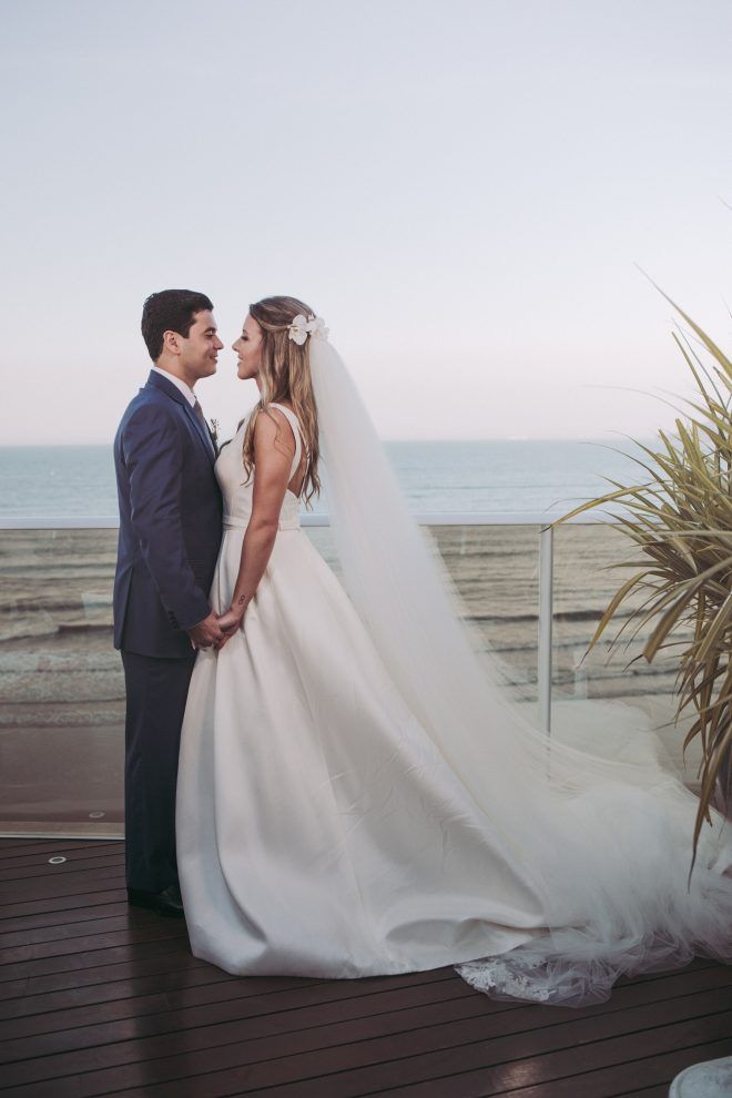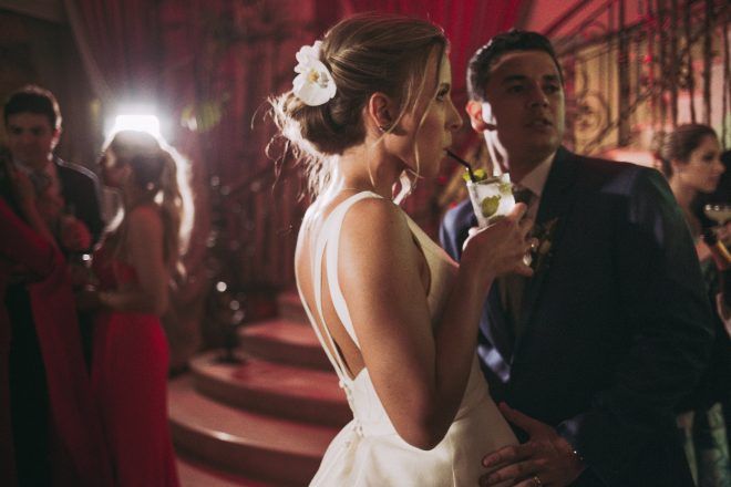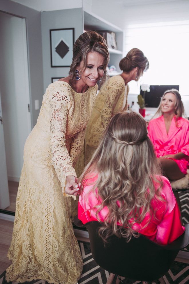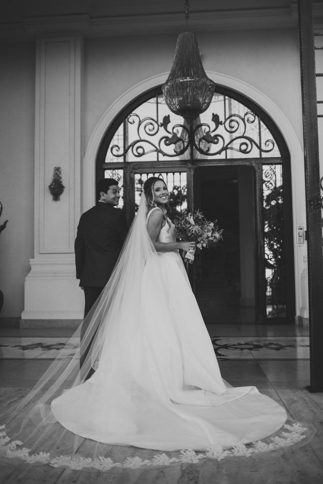 Como eu queria algo mais intimista, optei por fazer a cerimônia religiosa em uma capela que é na mesma rua do edifício que foi feita a festa. Foram convidados somente os familiares mais próximos, pois a capacidade máxima era de 40 pessoas. Foi muito emocionante. A cerimônia civil foi realizada no edifício, pelo mesmo pastor que realizou a religiosa. Quando chegamos na festa, todos convidados já estavam lá nos esperando, e descemos uma escadaria que chegava no salão de festas, diretamente para a cerimônia civil. Depois começou a festa.” – Julia