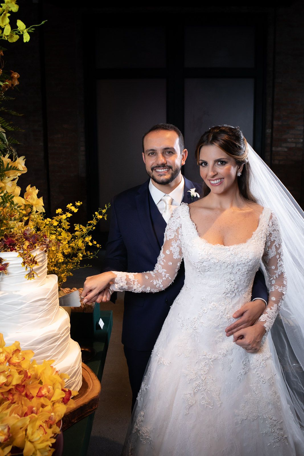 A mesa do bolo também ficou linda. Amo ver decorações em amarelo. Mas, vocês vão perceber que a cor da cerimônia foi diferente. É uma opção também, principalmente se na igreja vai ter outro casamento no dia – que não depende apenas de você.