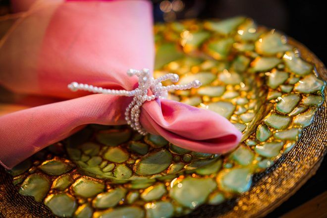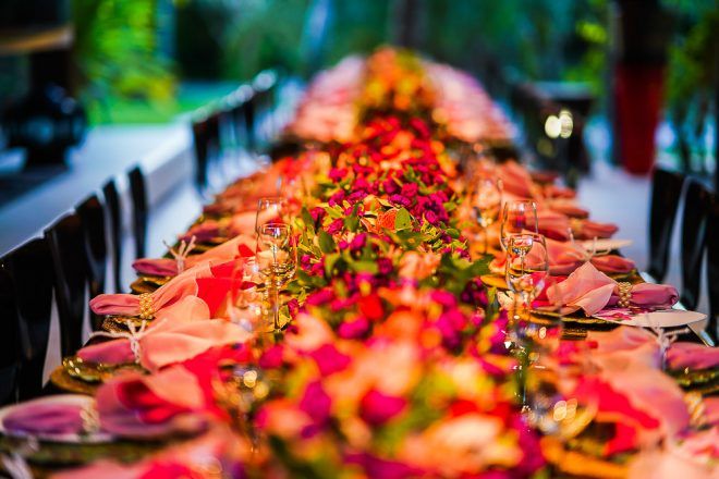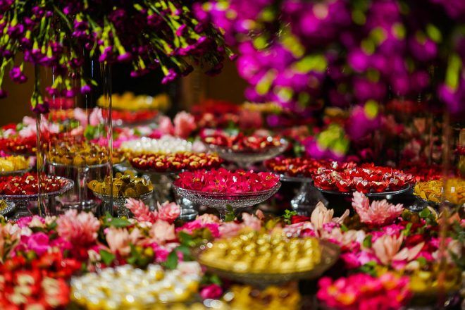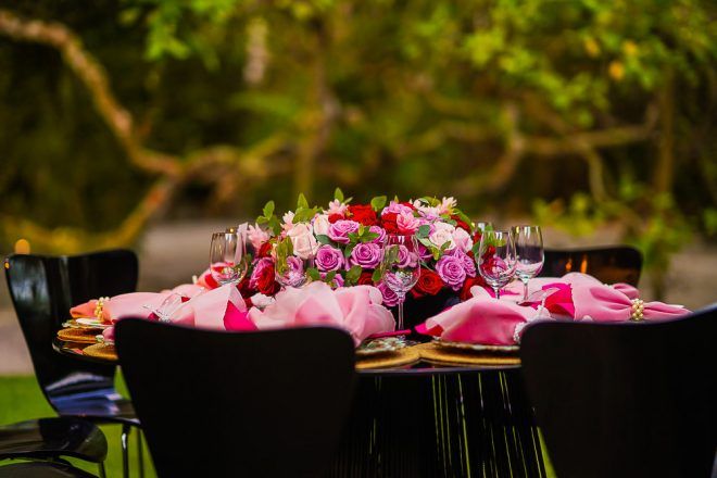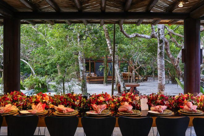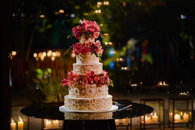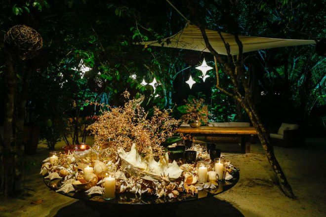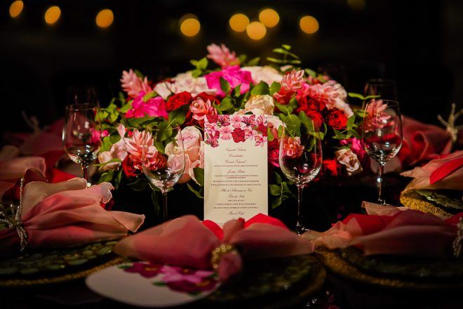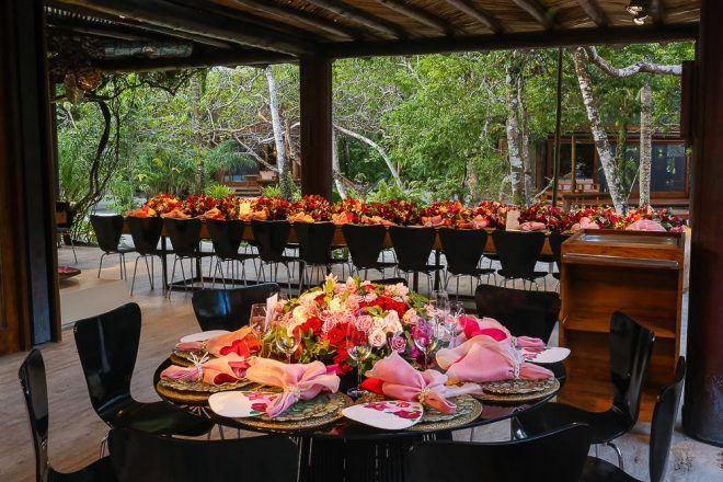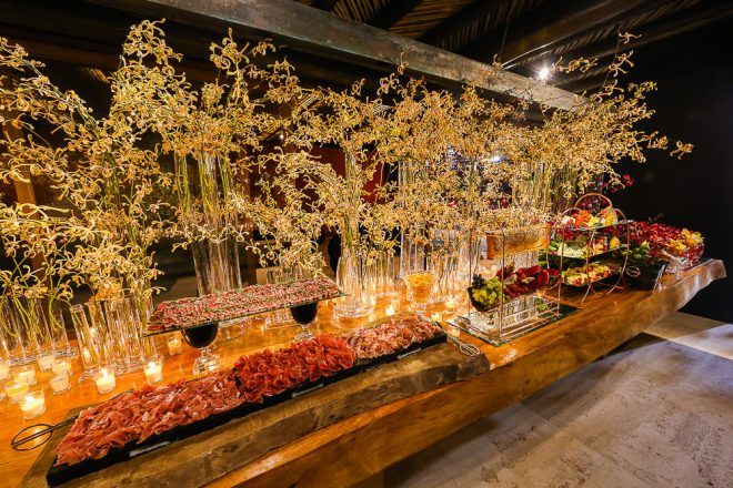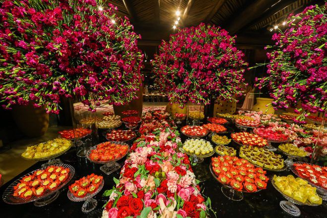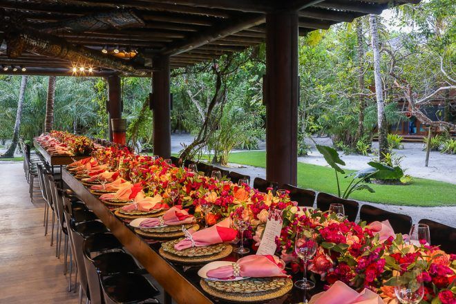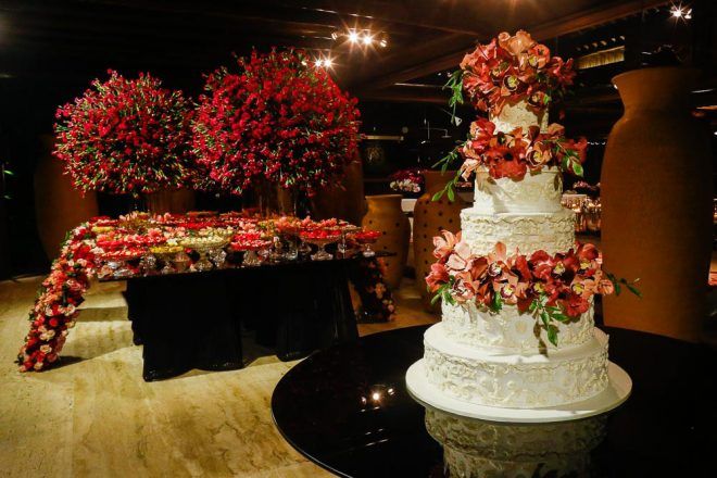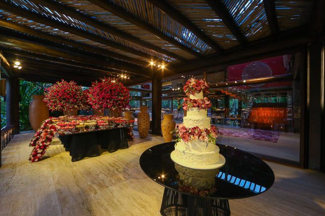 A responsável pela decoração bem romântica com vários tons de rosa foi a mineira verde que te quero verde. O Buffet foi comandado pelo club do chefe .Os drinks foi um show à parte elaborado pela equipe do Help Bar. O bolo foi desenvolvido pelo the king cake e viajou até Trancoso. Foi inspirado na identidade visual dos convites criado pela hiltomimpressos, com cymbindius e hibiscos de açúcar. Os doces foram feitos pela petite fleur parisserie e os famosos brigadeiros do Stefan Behar Sucré.