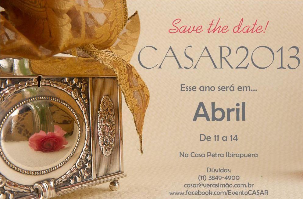 O CASAR 2013 esta chegando!! Que alegria…Não sei se todos vocês sabem, mas desde o CASAR do ano passado assumi a direção do evento, e tenho o maior orgulho disso! Um evento acima de tudo ético e que preza muito pelo seu público e expositor! Idealizado e até hoje tocado pelo nome de maior respeito no mercado de casamento, Vera Simão!