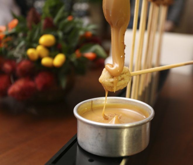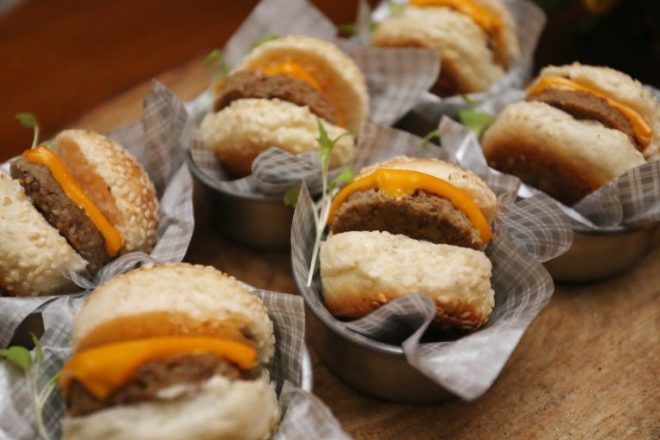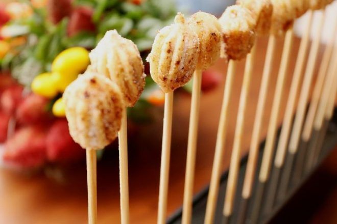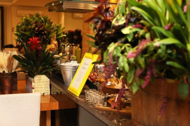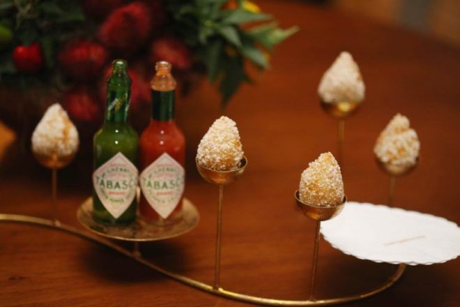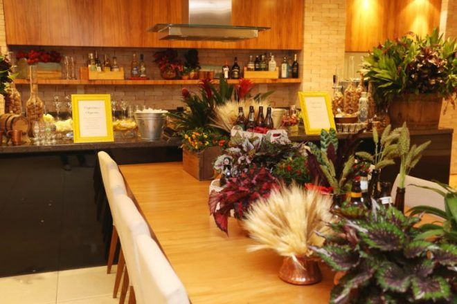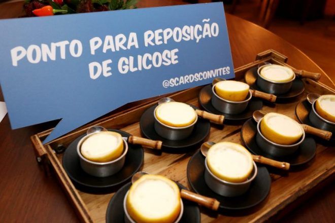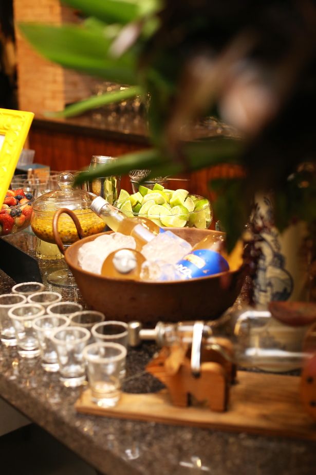 A ideia de fazer o chá com clima de bar é incrível porque deixa o ambiente super descontraído e, vamos combinar, não tem como não amar! Vocês podem apostar em comidas de boteco e muita cerveja e caipirinha. Vocês vão ver nas fotos as ideias de comidinhas deliciosas. Por exemplo: queijo coalho em formato de coração (eram flambados na hora), empadinhas, espetinhos de linguiça, hamburguinhos e muito mais. Para a sobremesa teve muito churros e uma mousse de caipirinha de limão servida na casca de limão siciliano. Ideia genial!