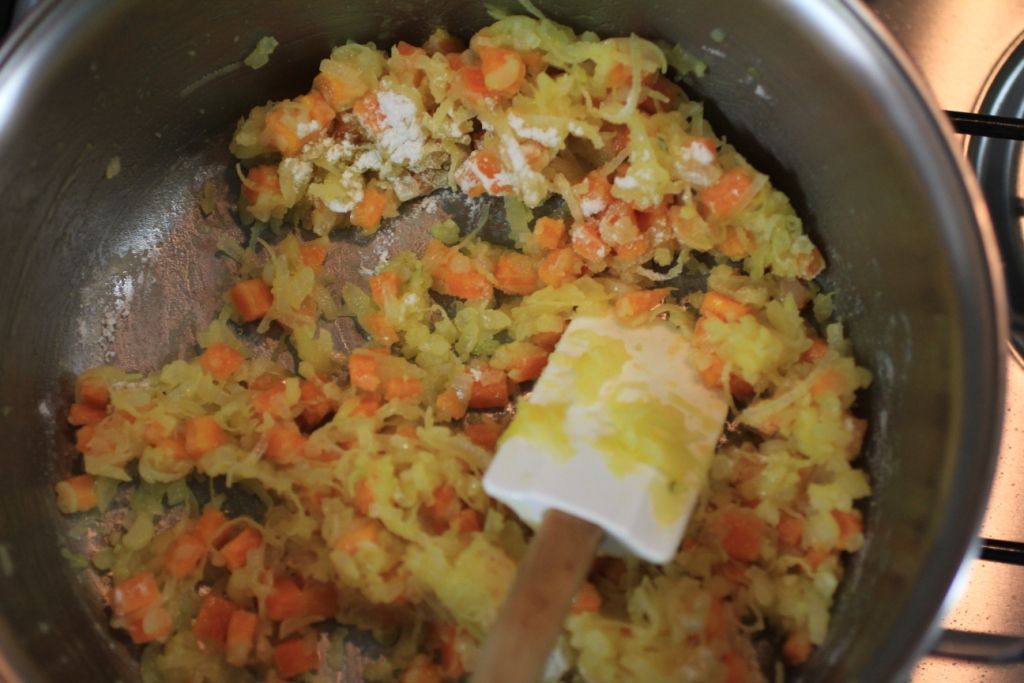 – Acrescente a farinha, misture e cozinhe por mais 1 minuto.