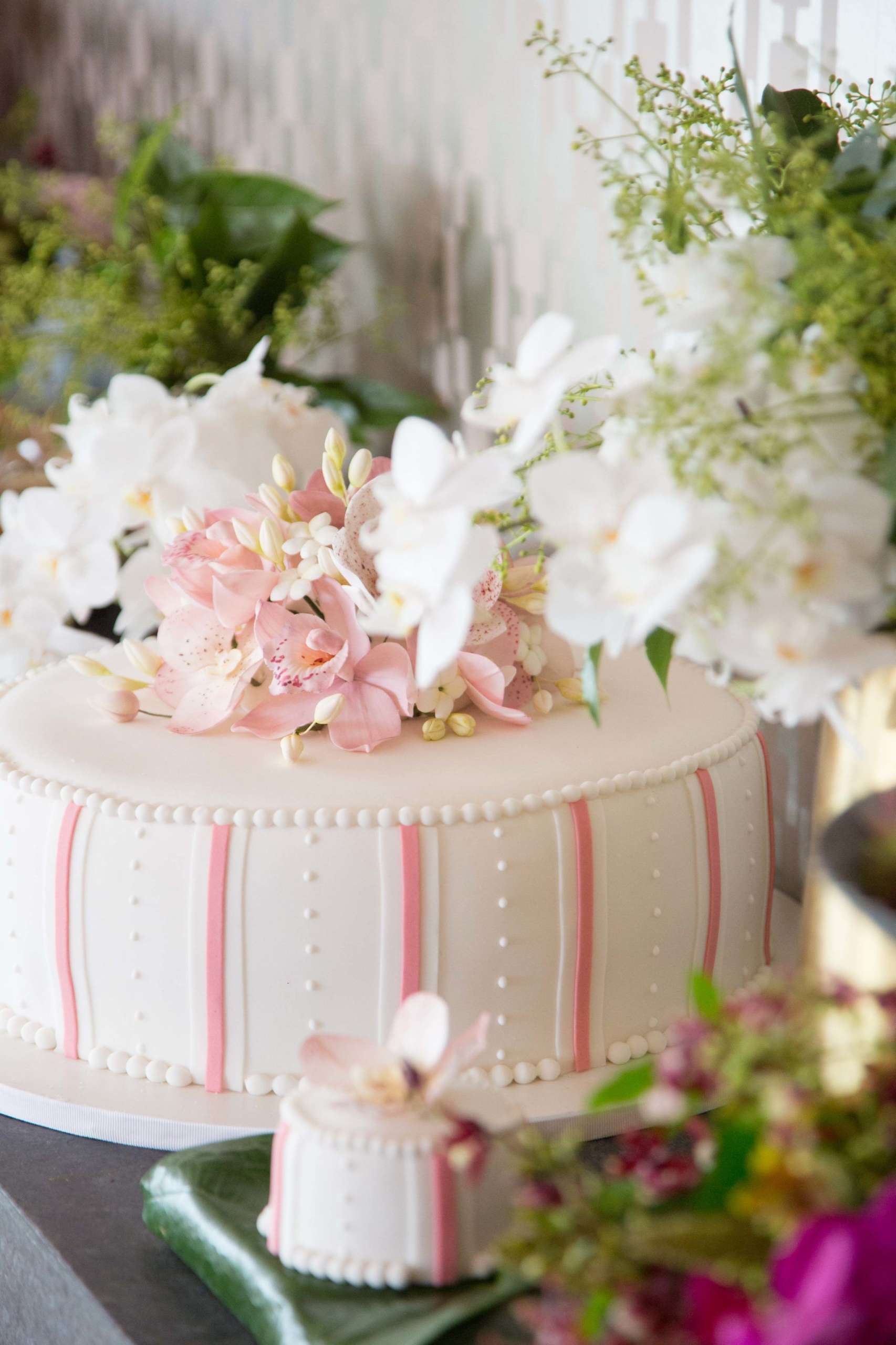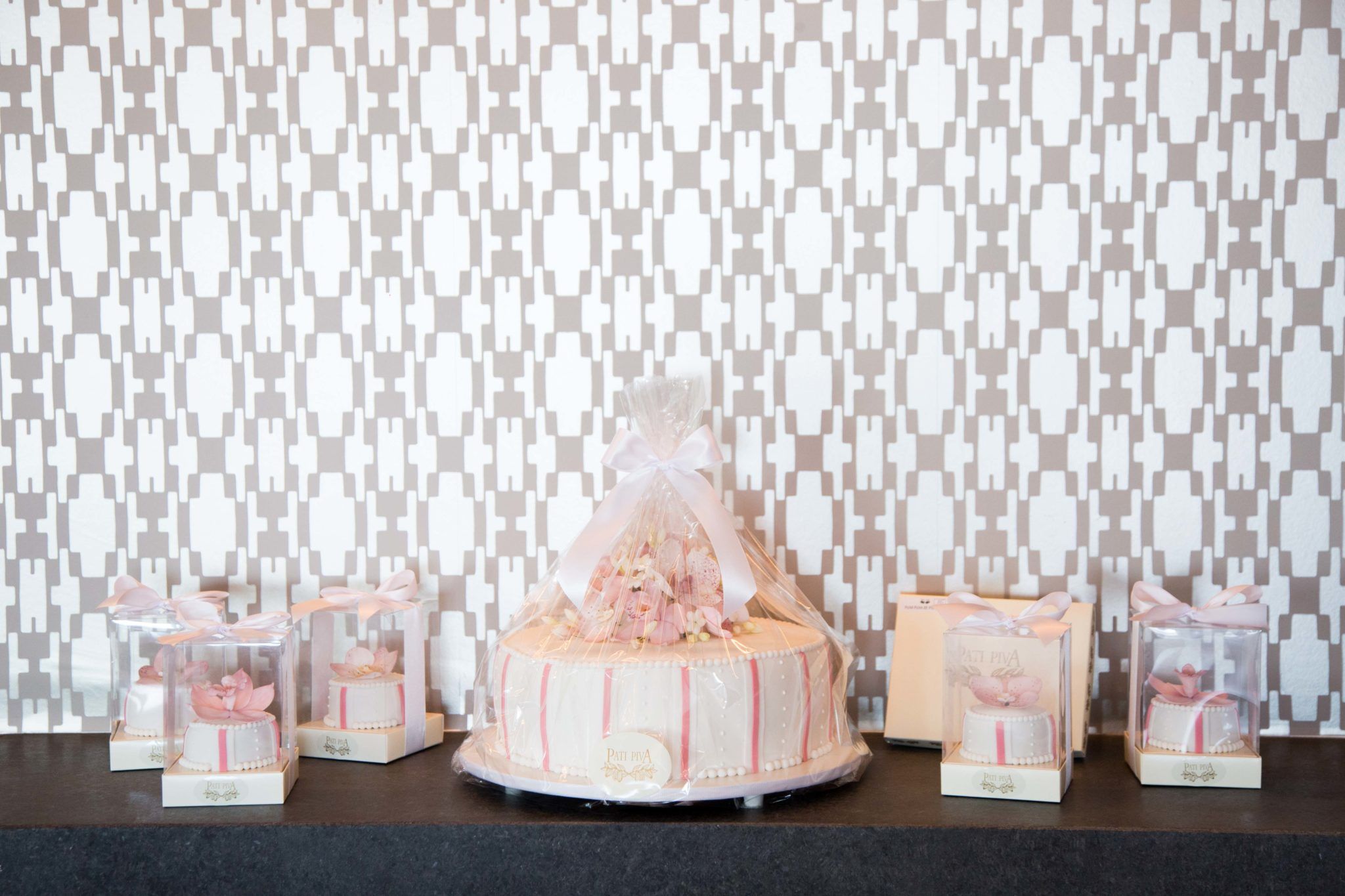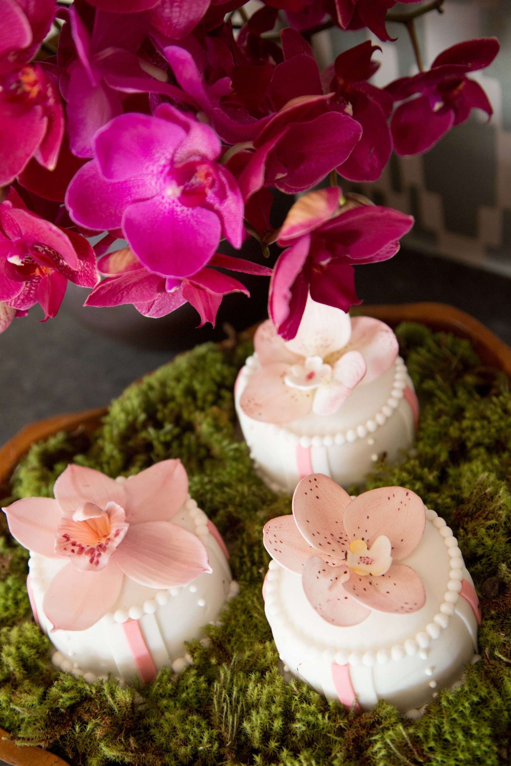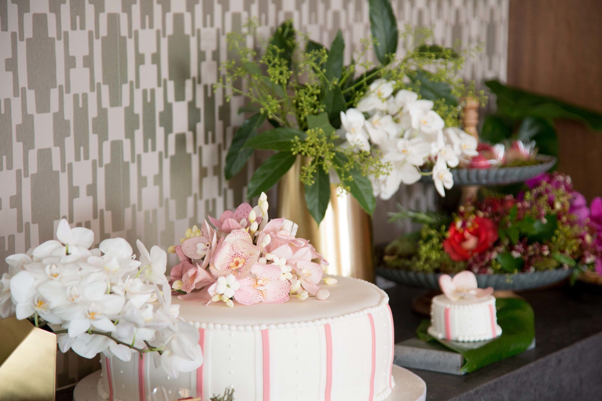 O bolo sabor praliné de amêndoas conseguiu unir o clássico à tendência das flores de açúcar no topo e foi acompanhado da surpresa ofertada para os convidados: o mini bolo com as mesmas características no sabor brownie.