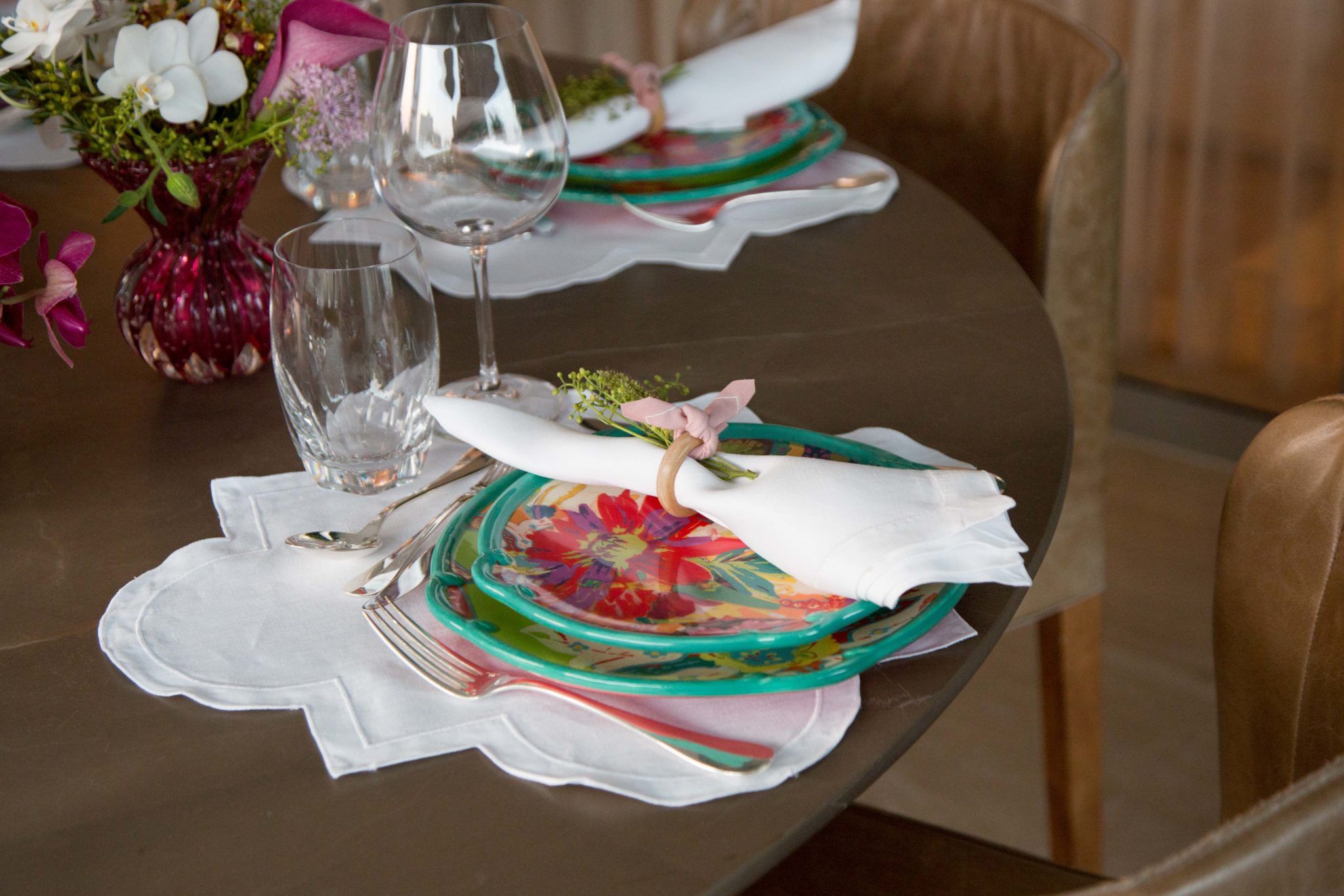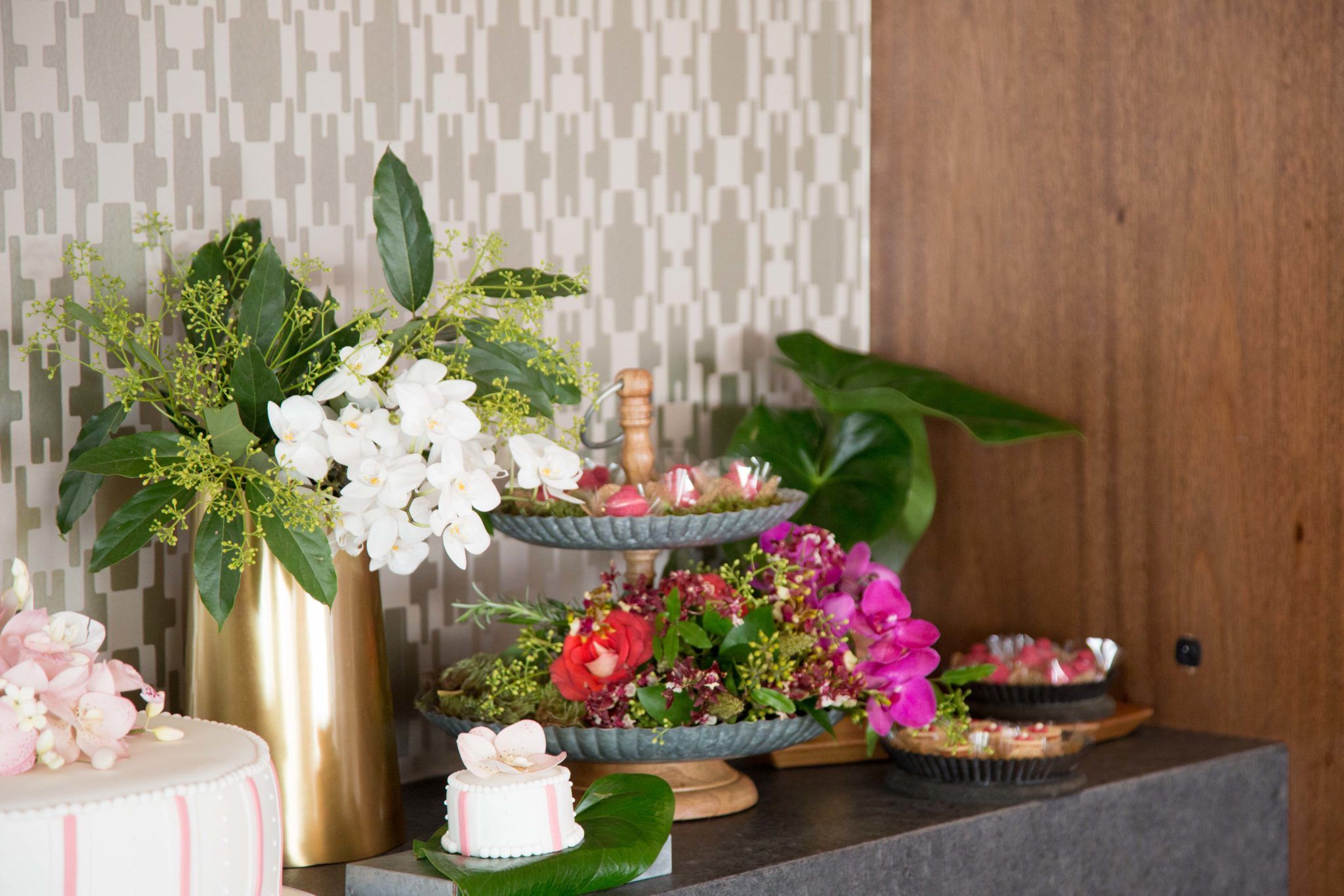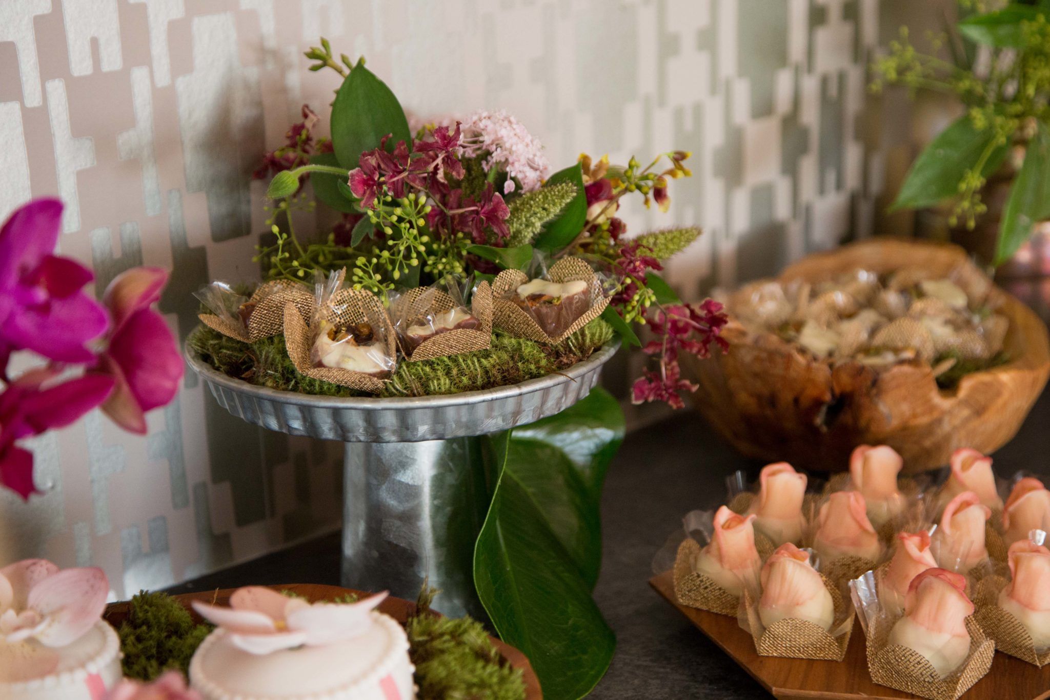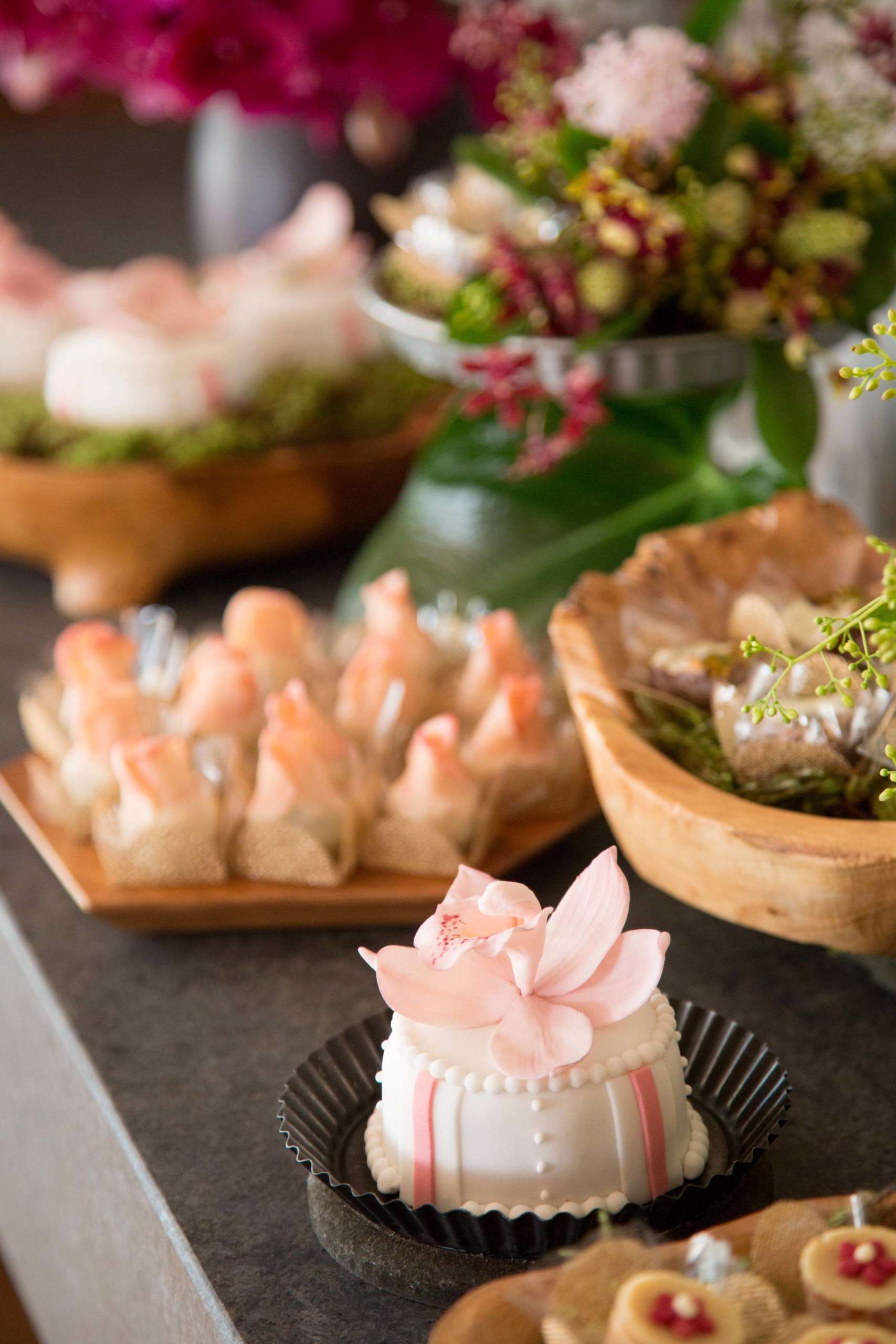 Algumas peças já faziam parte do acervo pessoal e outras foram selecionadas na locadora Ella Arts, como os pratos de doces. Aliás, os doces da Pati Piva foram puxa-puxa de pistache, o recém-lançado bolinho de rolo, além do brigadeiro de framboesa e botão de rosa marsalla nos tons.
