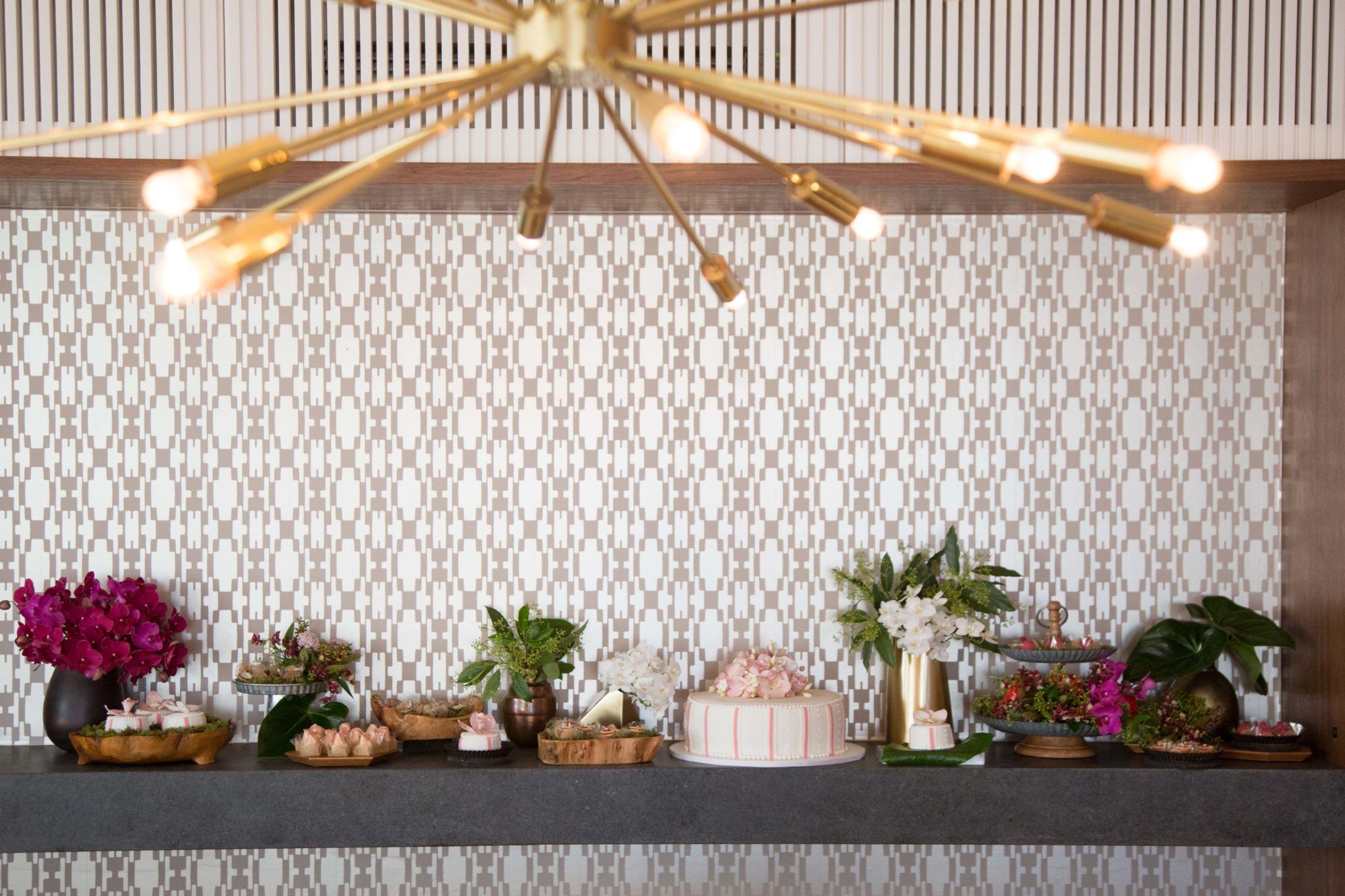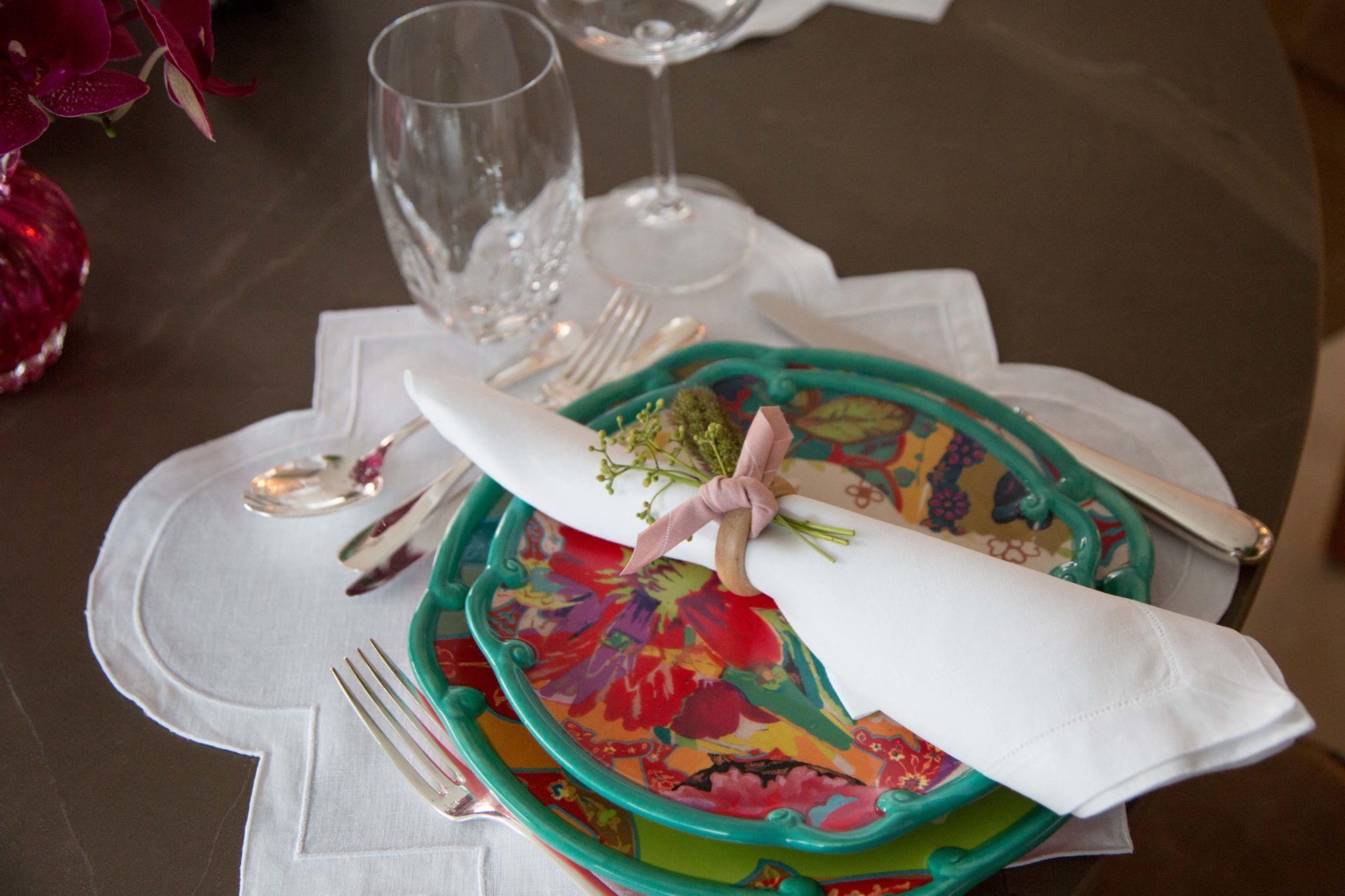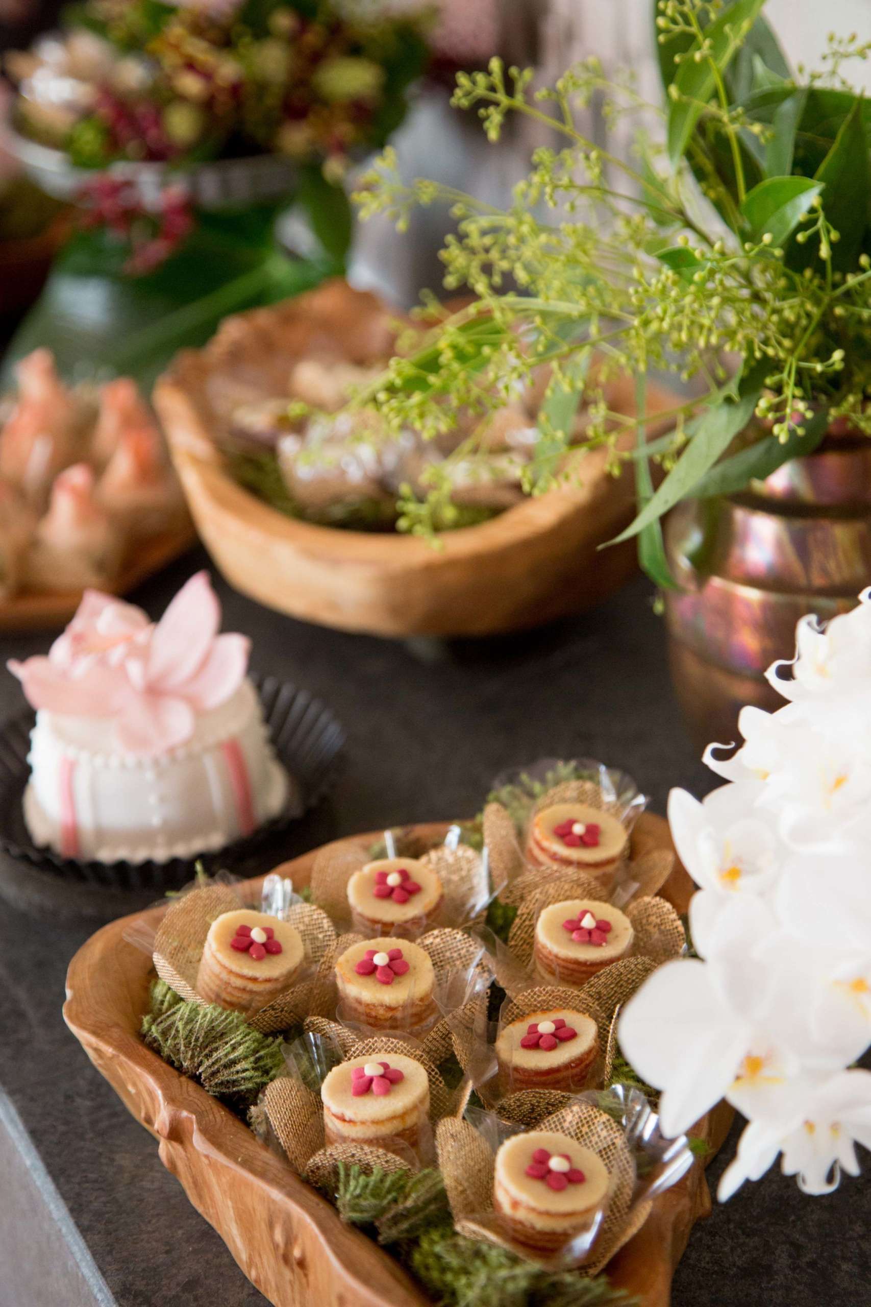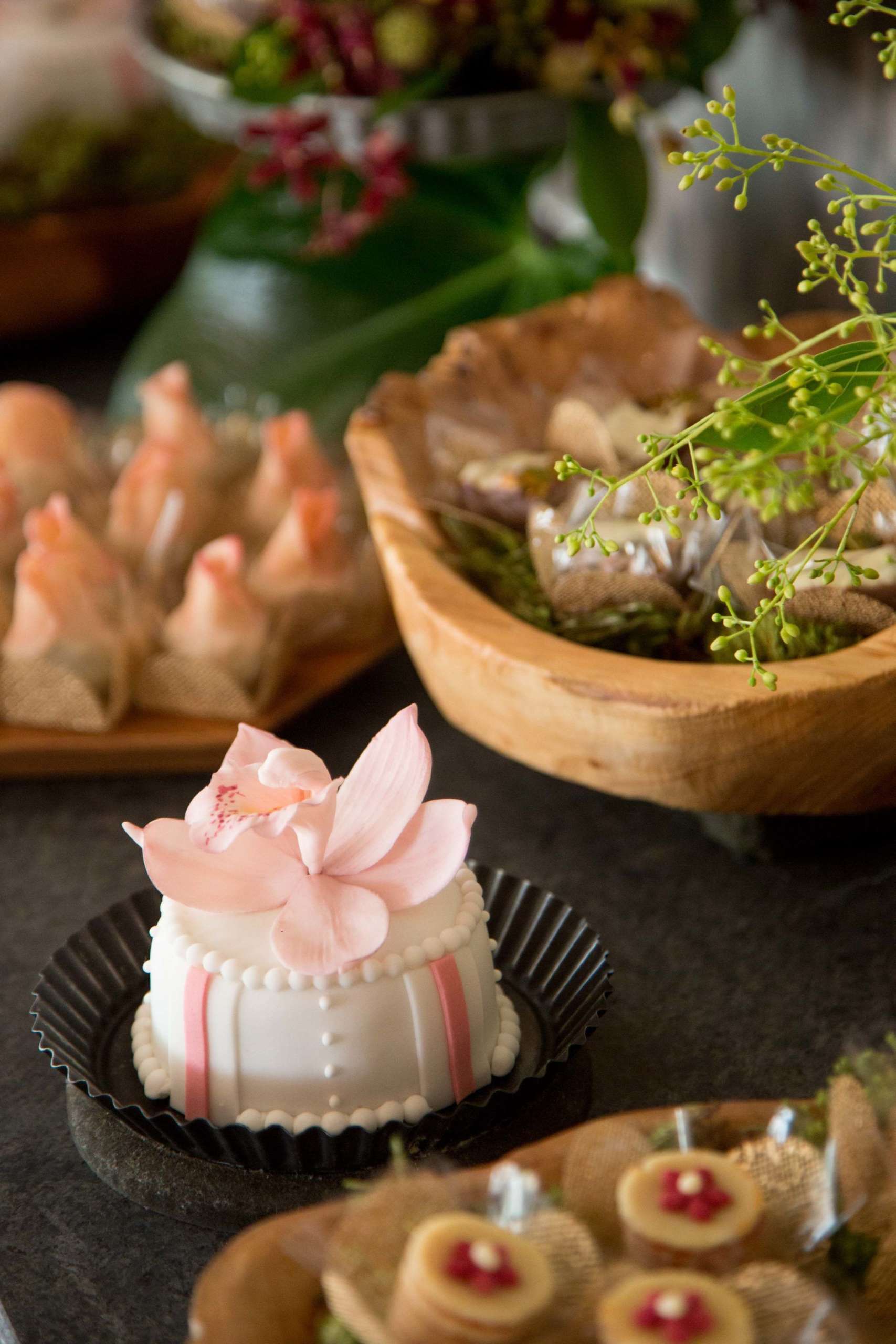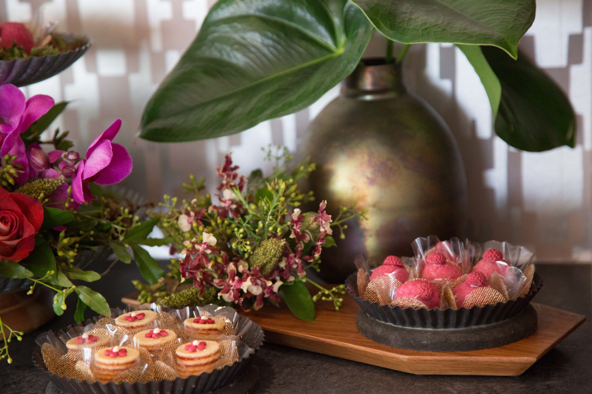 Algumas peças já faziam parte do acervo pessoal e outras foram selecionadas na locadora Ella Arts, como os pratos de doces. Aliás, os doces da Pati Piva foram puxa-puxa de pistache, o recém-lançado bolinho de rolo, além do brigadeiro de framboesa e botão de rosa marsalla nos tons.