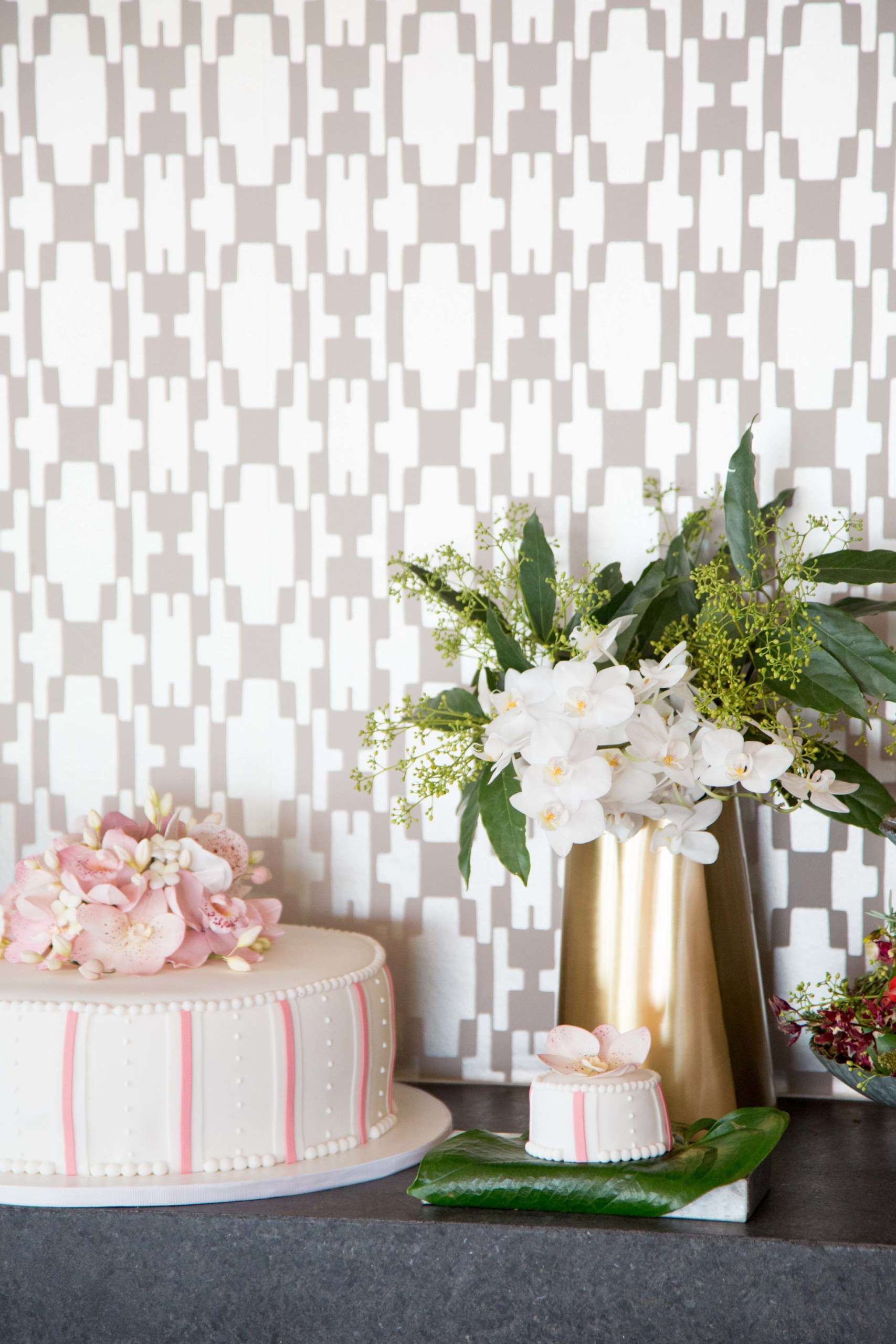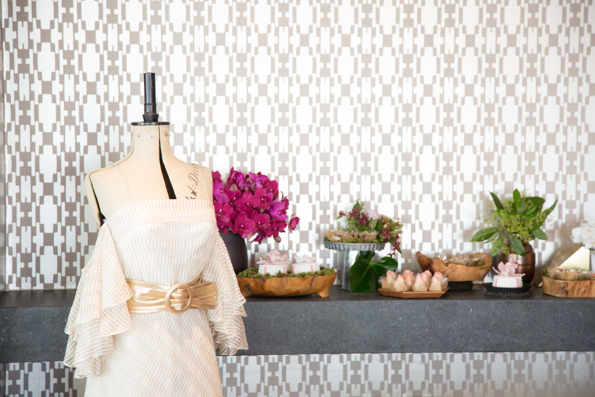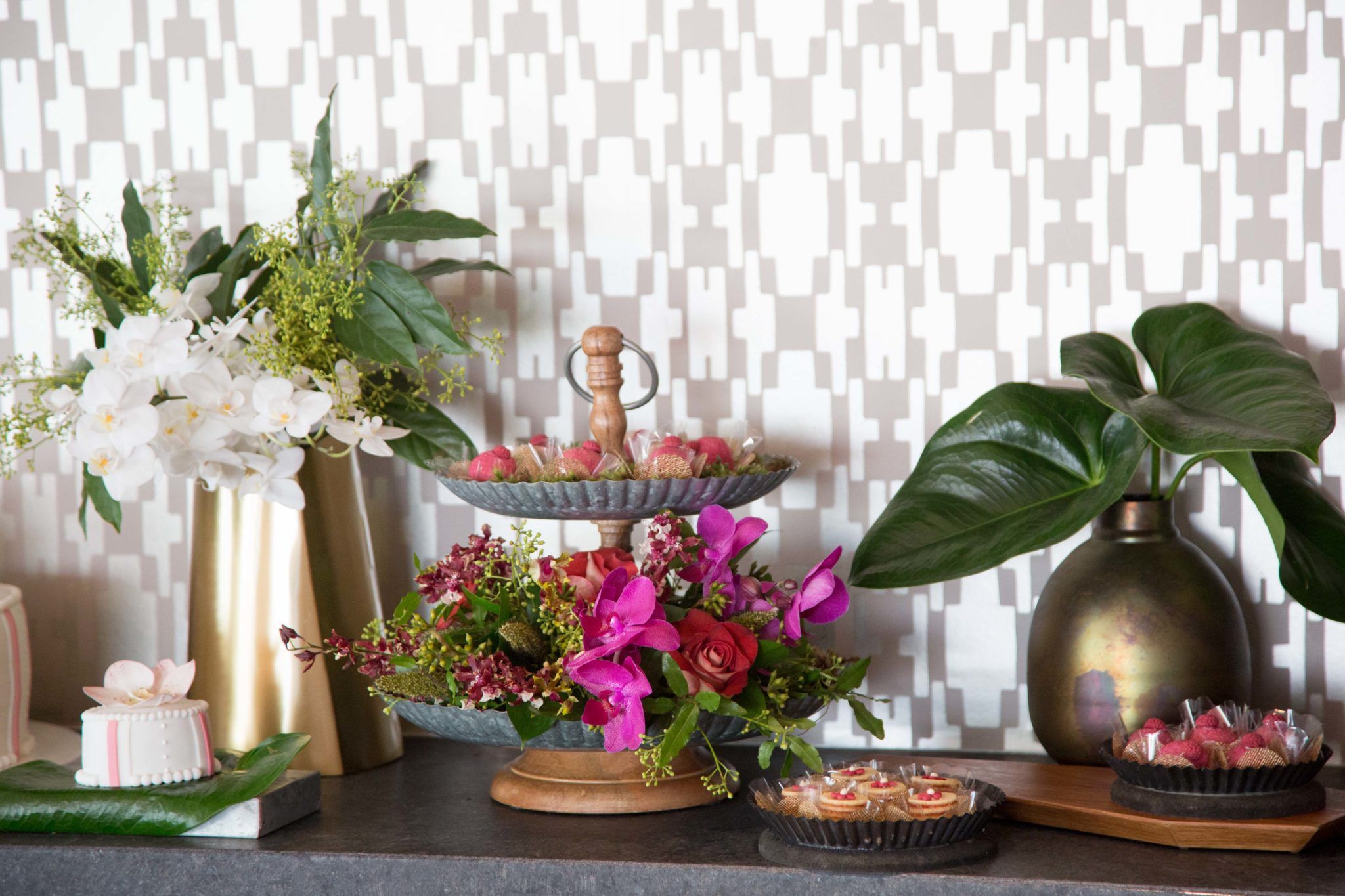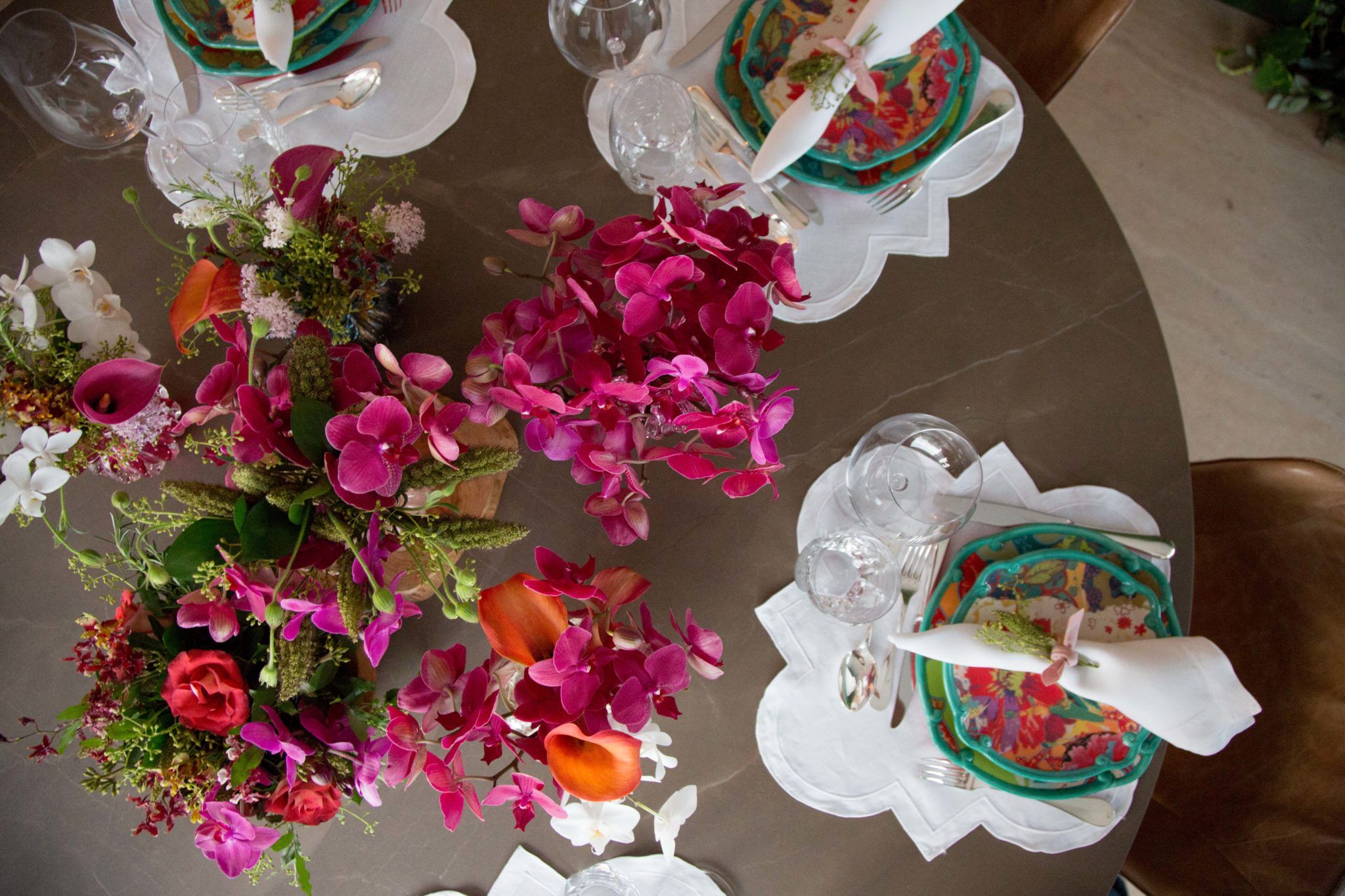 Algumas peças já faziam parte do acervo pessoal e outras foram selecionadas na locadora Ella Arts, como os pratos de doces. Aliás, os doces da Pati Piva foram puxa-puxa de pistache, o recém-lançado bolinho de rolo, além do brigadeiro de framboesa e botão de rosa marsalla nos tons.