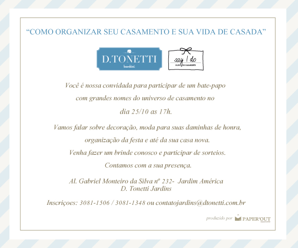 Hoje tenho um convite super bacana!!! Vamos nos encontrar dia 25 de outubro – quinta feira – na nova loja da D.Tonetti (que esta maravilhosa!!!). O evento começa as 17:00 e a primeira palestra é as 17:30 (e é a minha!!! Então, cheguem no horário hein?).