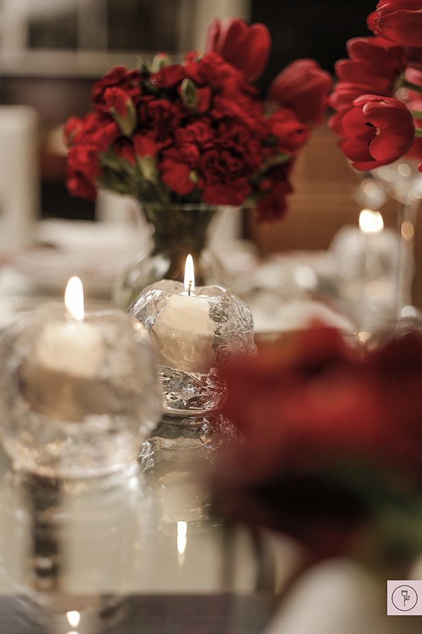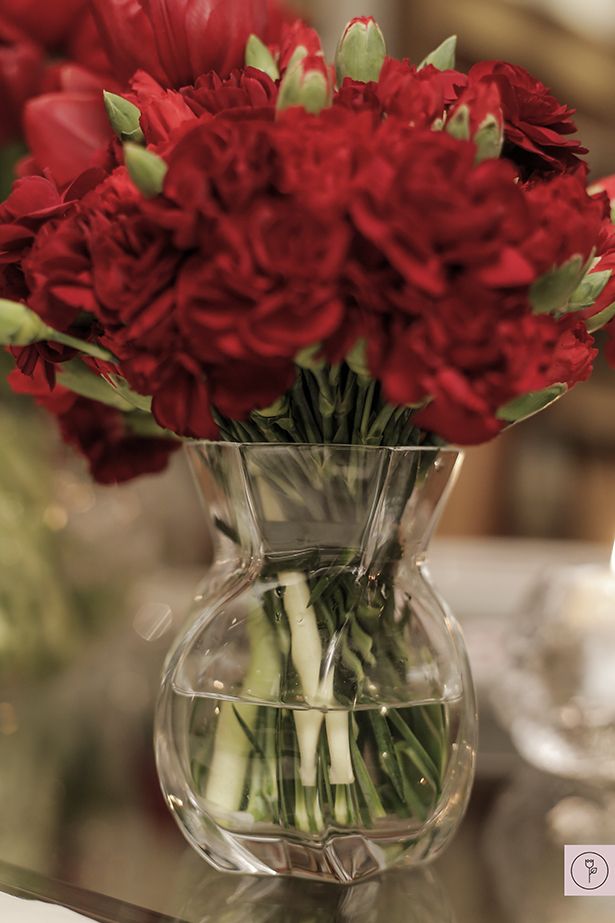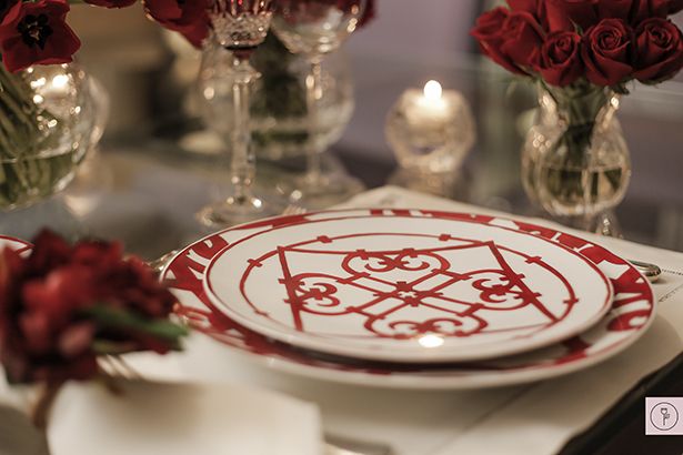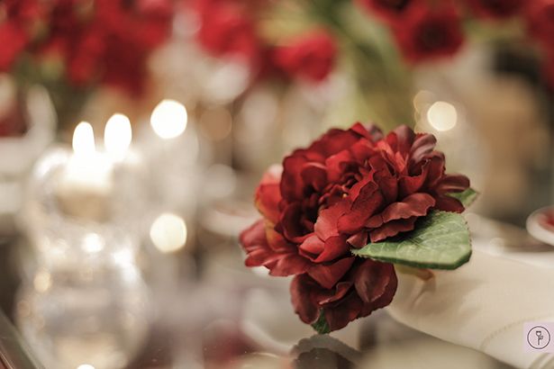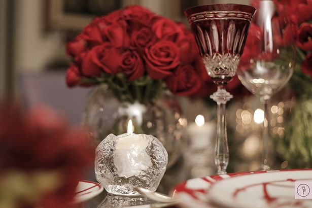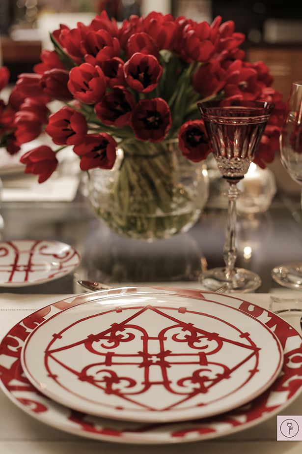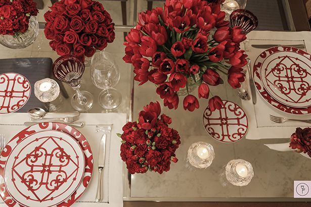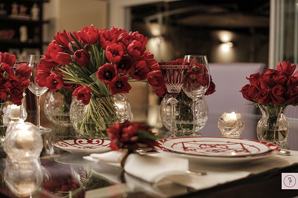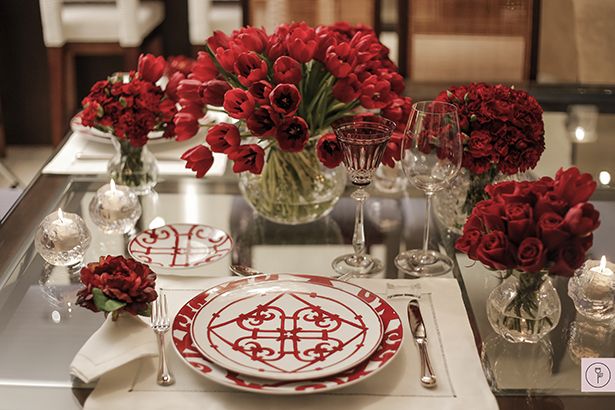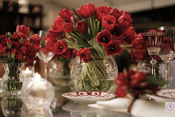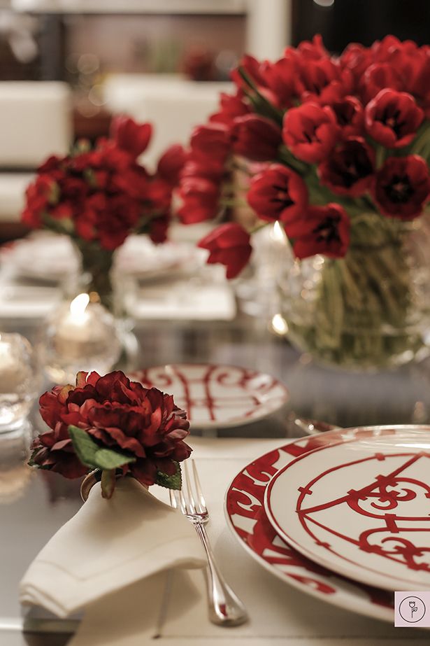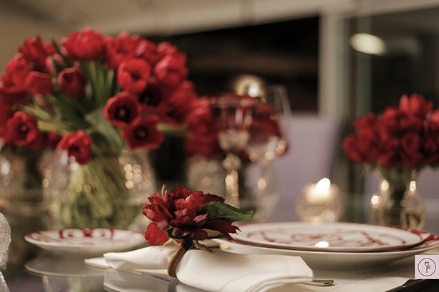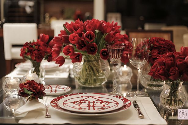 A Vamos Receber preparou essa mesa simplesmente LINDA e perfeita para um jantar romântico. As flores vermelhas (tulipas, cravos e rosas) foram organizadas em tamanhos diferentes e de uma forma que deu muita harmonia para a mesa. E, já que a cor predominante é o vermelho, vocês podem colocar também nas louças que fica ótimo. Vejam só que bacana!