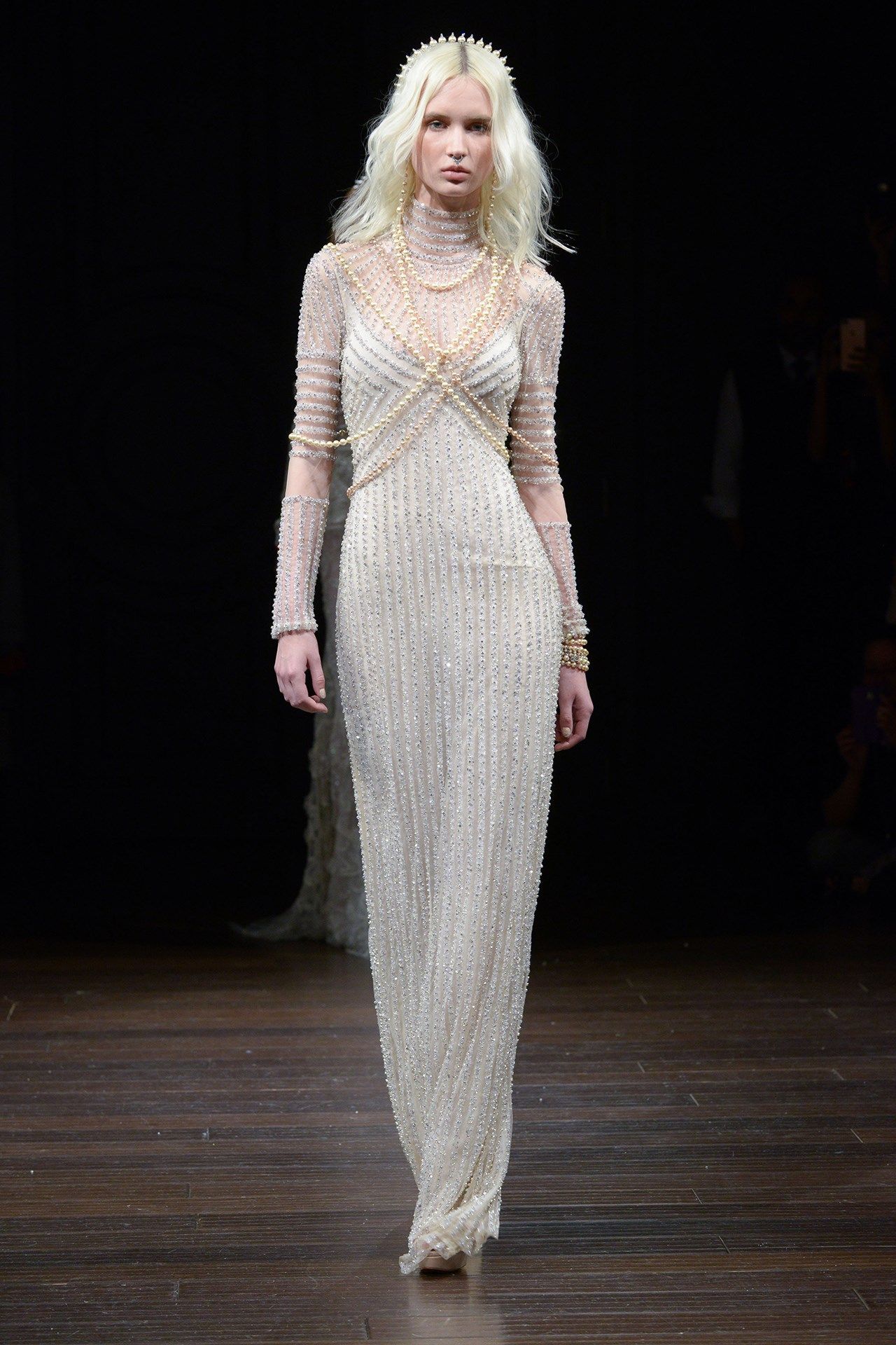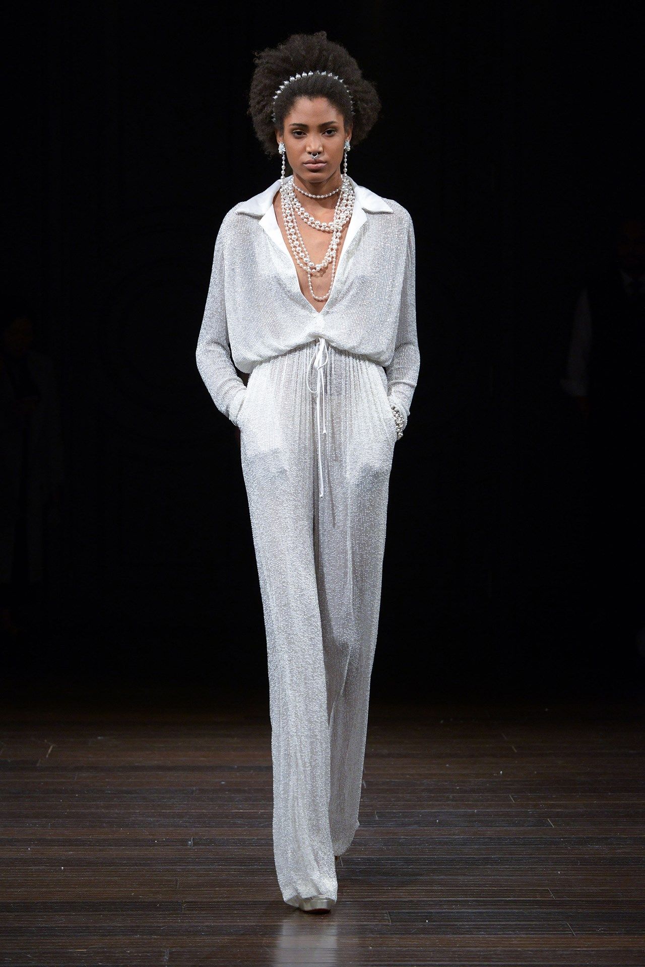 Já Naeem Khan se destacou pelos colares de pérolas sobrepostos ao vestidos, e trouxe um mix de cortes, de macacão sequinho a saias volumosas.