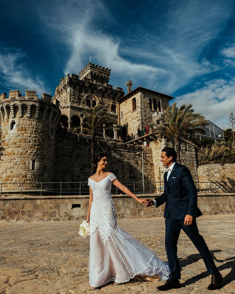 Meu vestido é da Rosa Clará, para Casa Amarela, pensado exclusivamente para o meu casamento e desenvolvido com trabalho handmade no atelier deles em Barcelona. Mas escolhi não ficar com o vestido, e ele foi devolvido para que a marca pudesse reutilizar todo o tecido. Meus sapatos foram da Aquazzura e a grinalda que usei foi do Miguel Alcade.