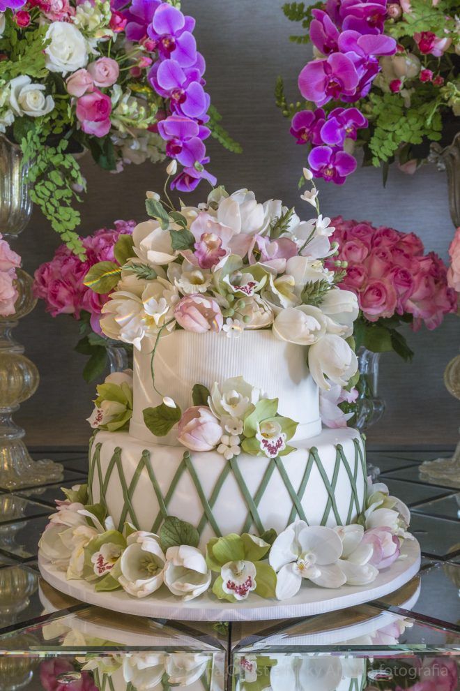 Desde o início já sabia que a decoração seria toda bem branca, com espelhos e luzinhas. Sou mais clássica e perfeccionista, então queria muitas flores, mas tudo em formas mais definidas, nada muito bagunçado… Por isso os arranjos do meu casamento eram bem branquinhos e redondinhos – e eu amei!! Os itens personalizados seguiam a mesma linha – tons de branco, prata e um pouco de bege também. Sempre muito delicados. O projeto foi idealizado pela decoradora (Cristiane Pileggi), que superou completamente as minhas expectativas… Não faria nada diferente! Nosso bolo foi bem fácil de escolher já que eu fui na melhor pessoa para fazer isso (The King Cake). Os doces foram escolhidos após váaarias degustações com fornecedores diferentes (e não foi fácil, pois além de ter vários bons, muitos eram parecidos, de forma que ficava difícil decidir). Estava super equilibrado, sem excesso de chocolate.” – Renata