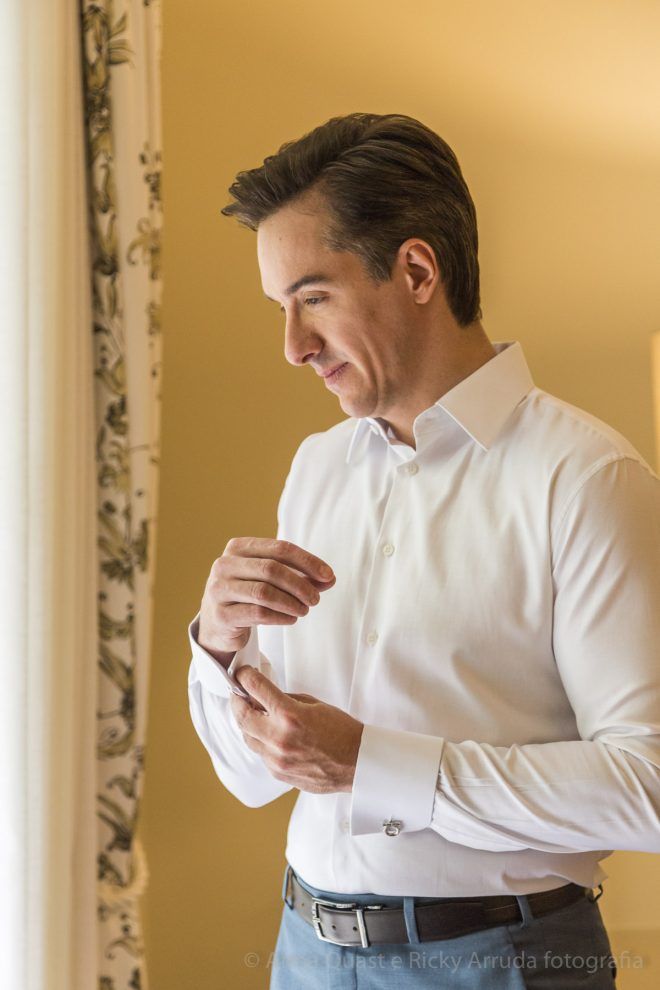 No judaísmo, os noivos não podem ser ver e nem se falar na semana do casamento. Então nos despedimos no sábado anterior ao casamento. Eu me arrumei na própria Casa Petra, o que foi incrível, pois pude acompanhar a montagem da festa e ver assim que ficou pronto. O Alexandre se arrumou no hotel Unique, onde passamos a noite de núpcias. Eu estava muito tranquila (nem sei como!), o Alexandre estava nervoso.