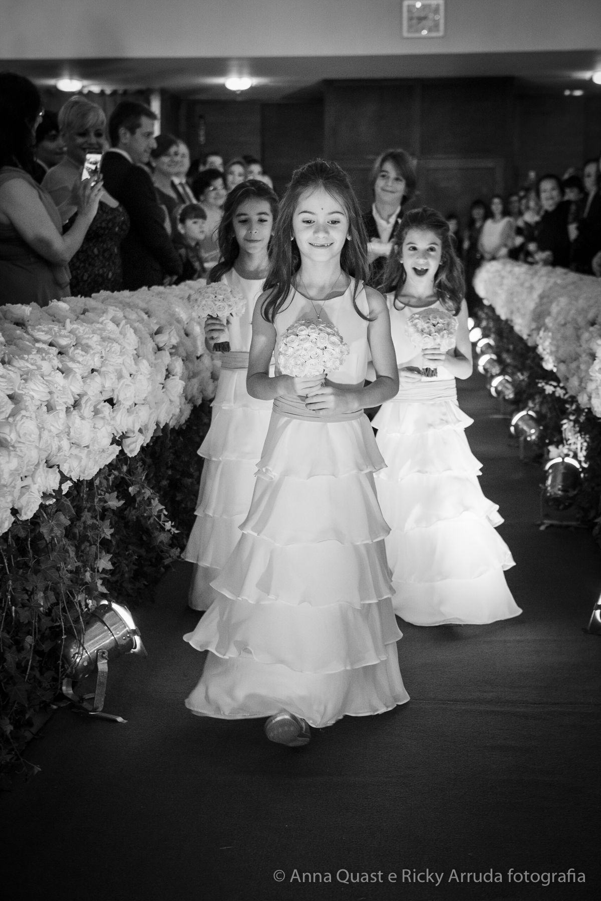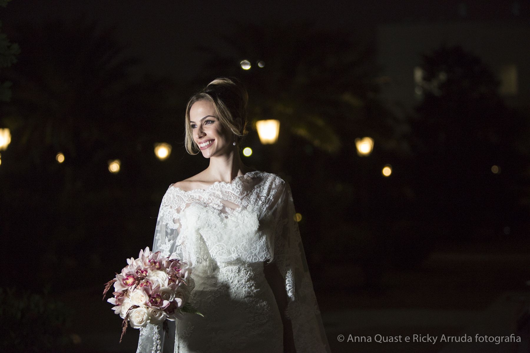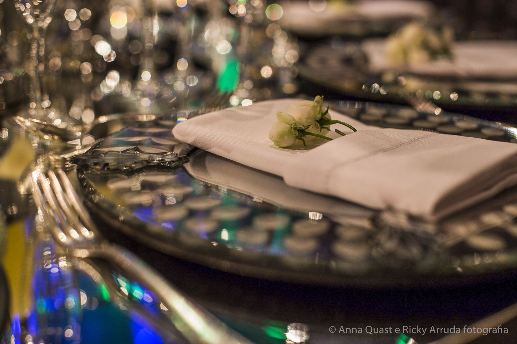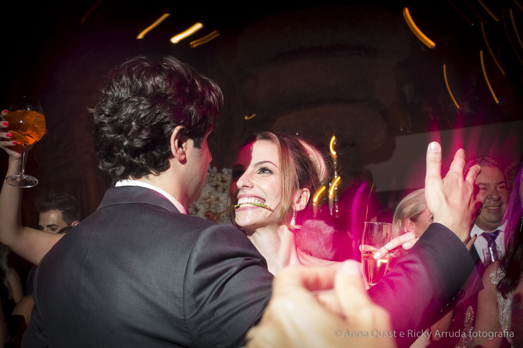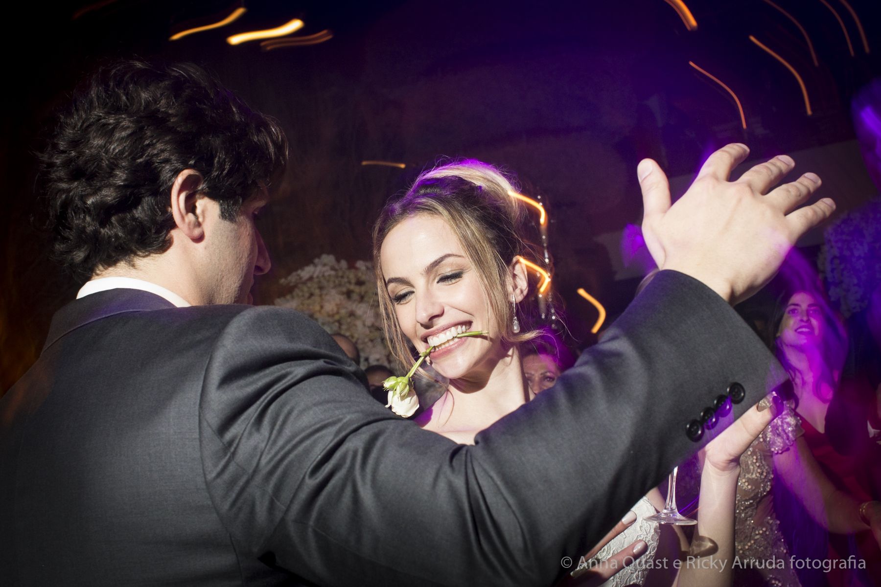 Aos poucos, a Ju foi se mostrando uma noiva mais delicada, princesa, que acabou até escolhendo trazer as flores da identidade da sua festa no seu vestido também, mas de maneira menos óbvia, bordadas a linha de seda e aplicadas uma a uma no vestido. Depois da cerimônia o saiote de tule foi removido e a cauda foi presa para a noiva ficar mais “leve” para a pista de dança. E a Ju dançou para valer, a noite inteira.