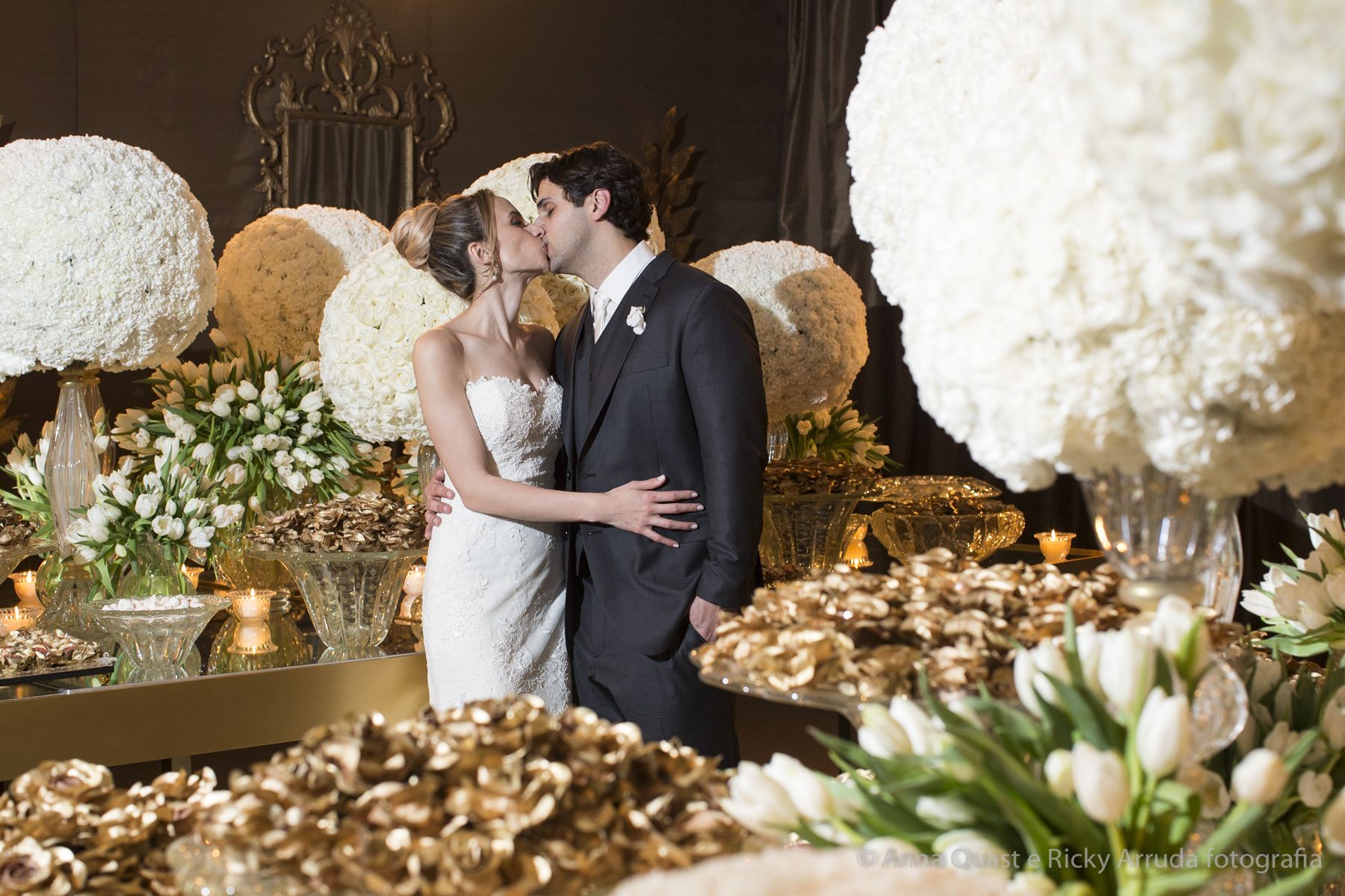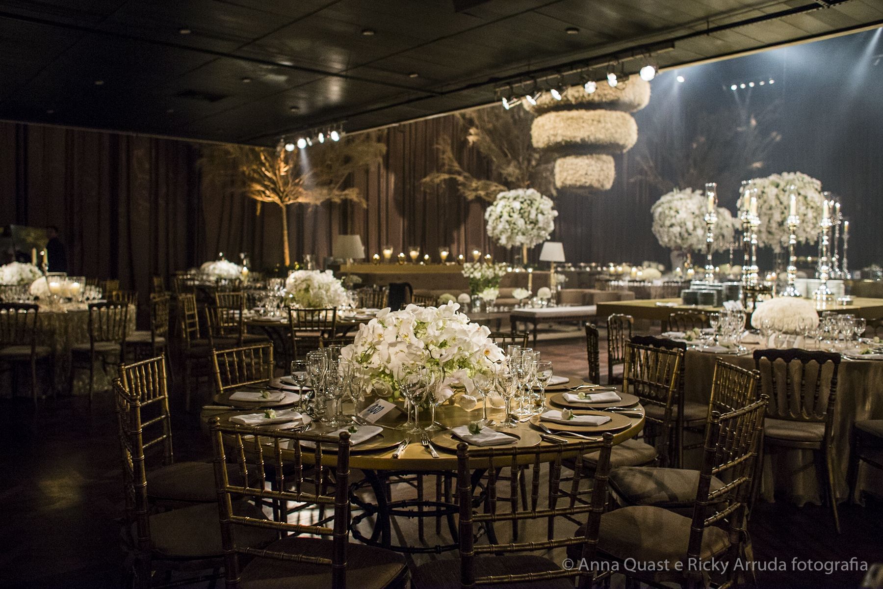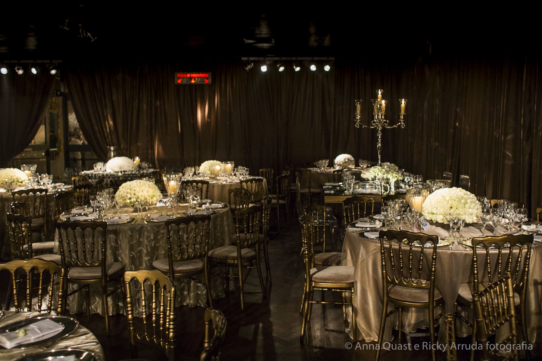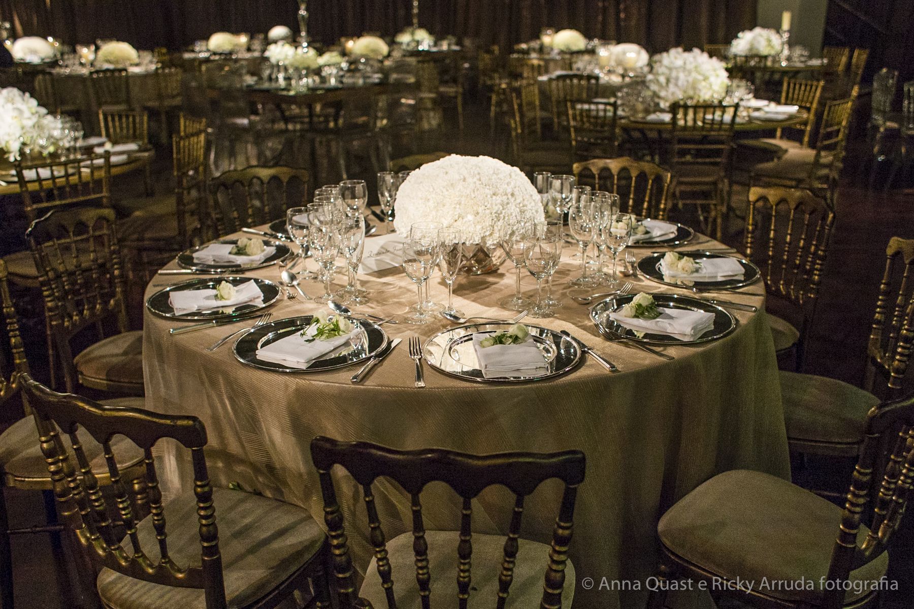 Aos poucos, a Ju foi se mostrando uma noiva mais delicada, princesa, que acabou até escolhendo trazer as flores da identidade da sua festa no seu vestido também, mas de maneira menos óbvia, bordadas a linha de seda e aplicadas uma a uma no vestido. Depois da cerimônia o saiote de tule foi removido e a cauda foi presa para a noiva ficar mais “leve” para a pista de dança. E a Ju dançou para valer, a noite inteira.