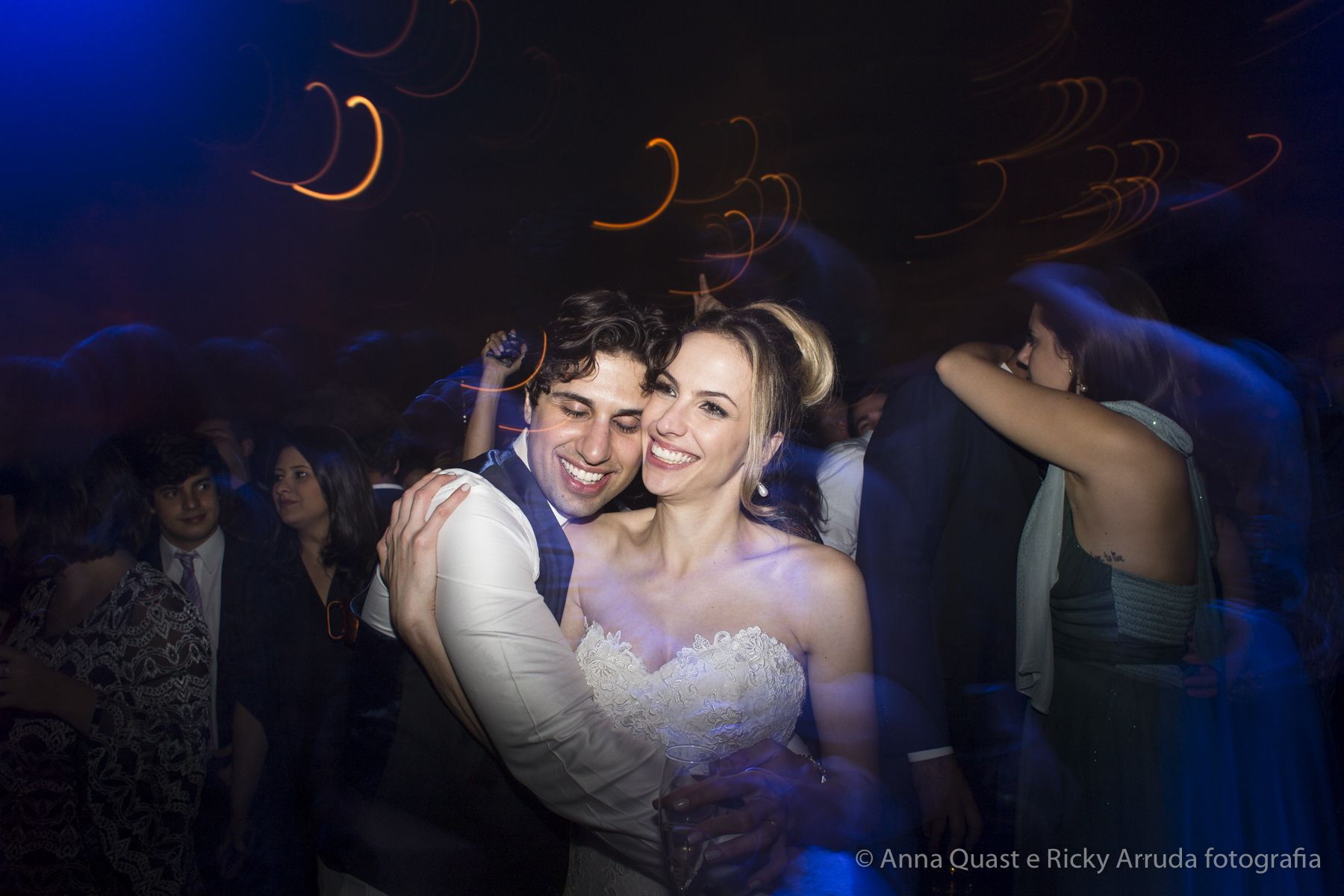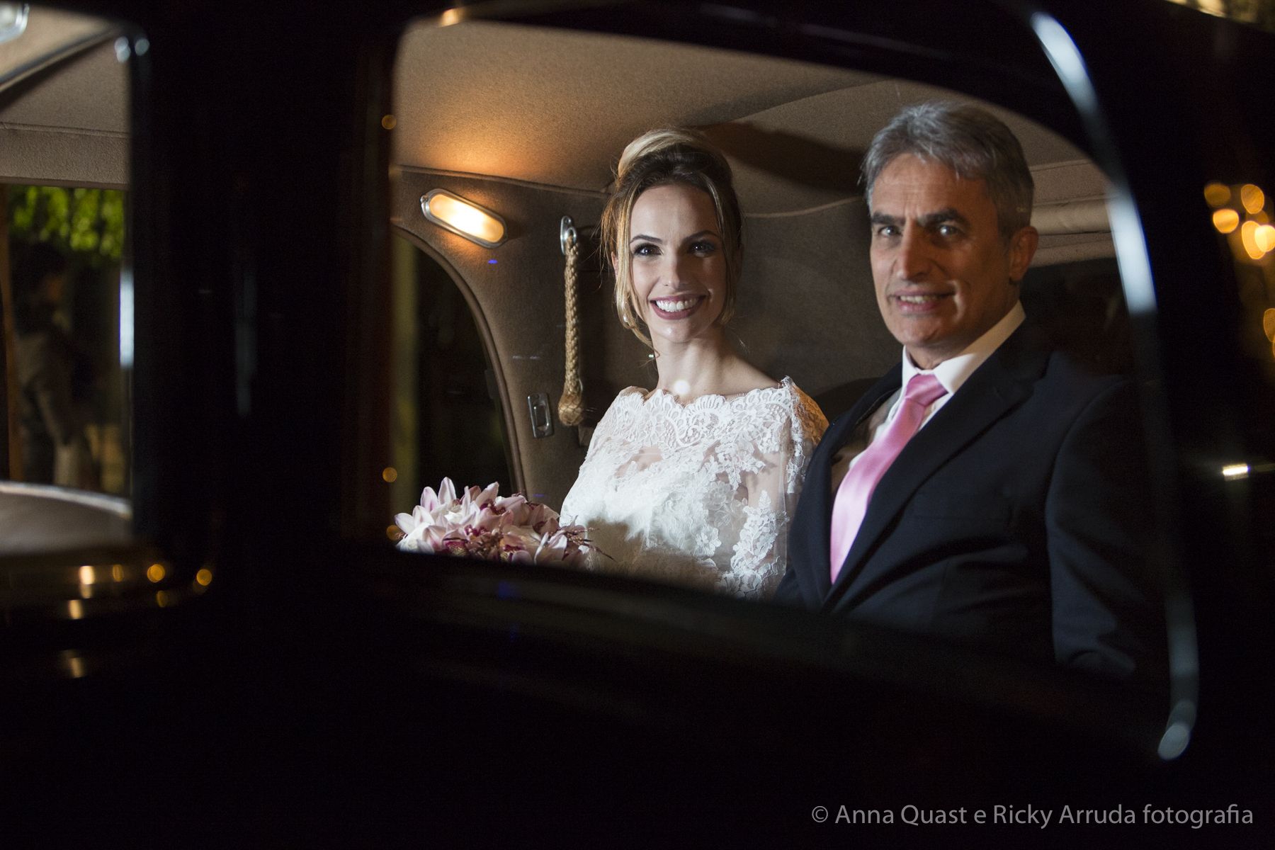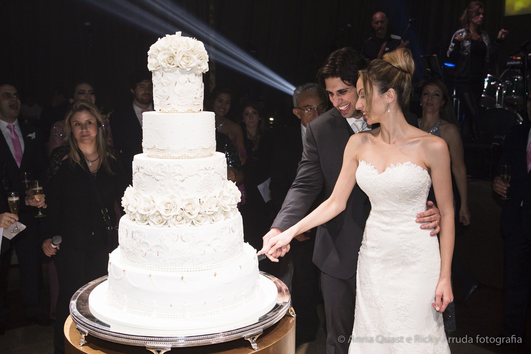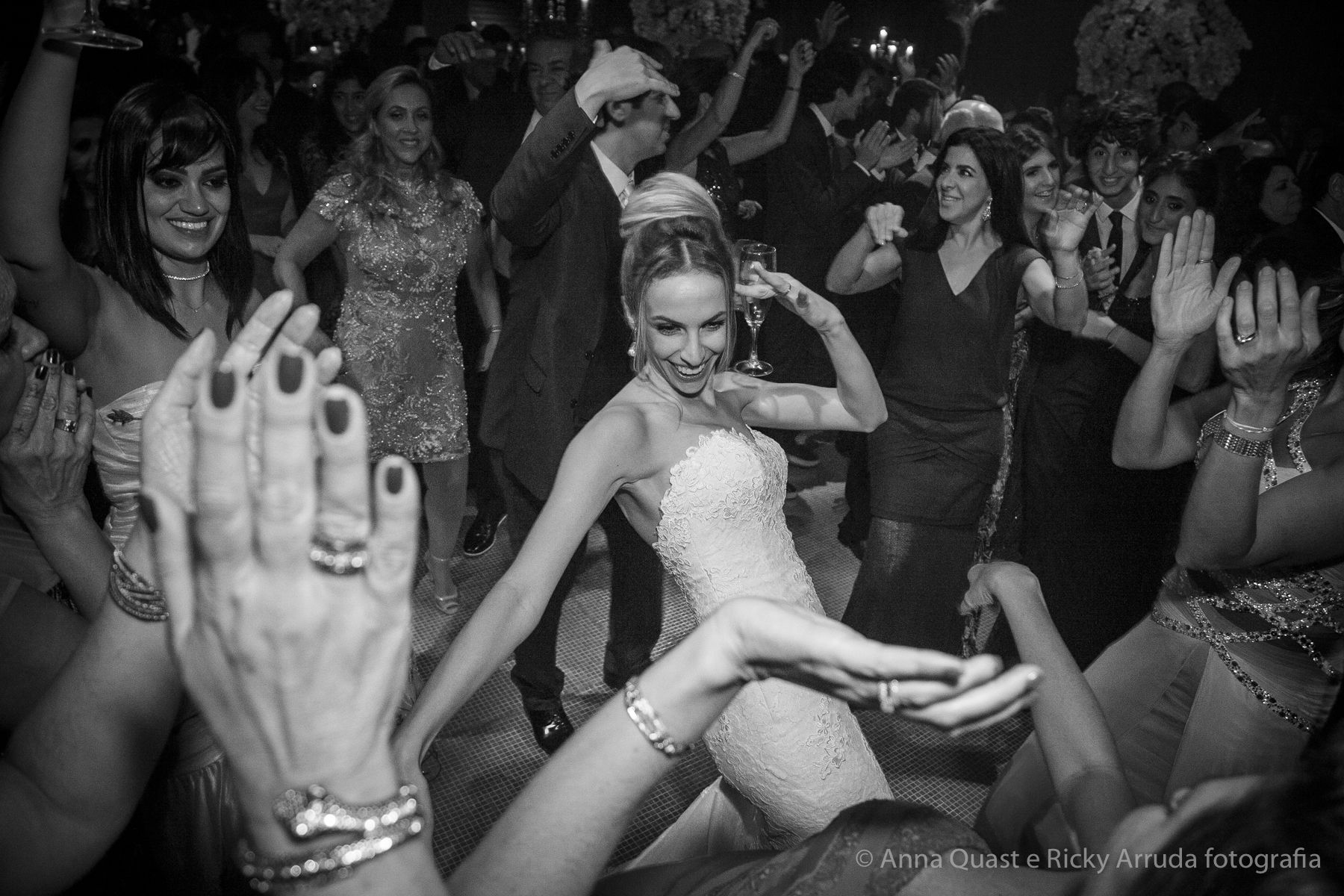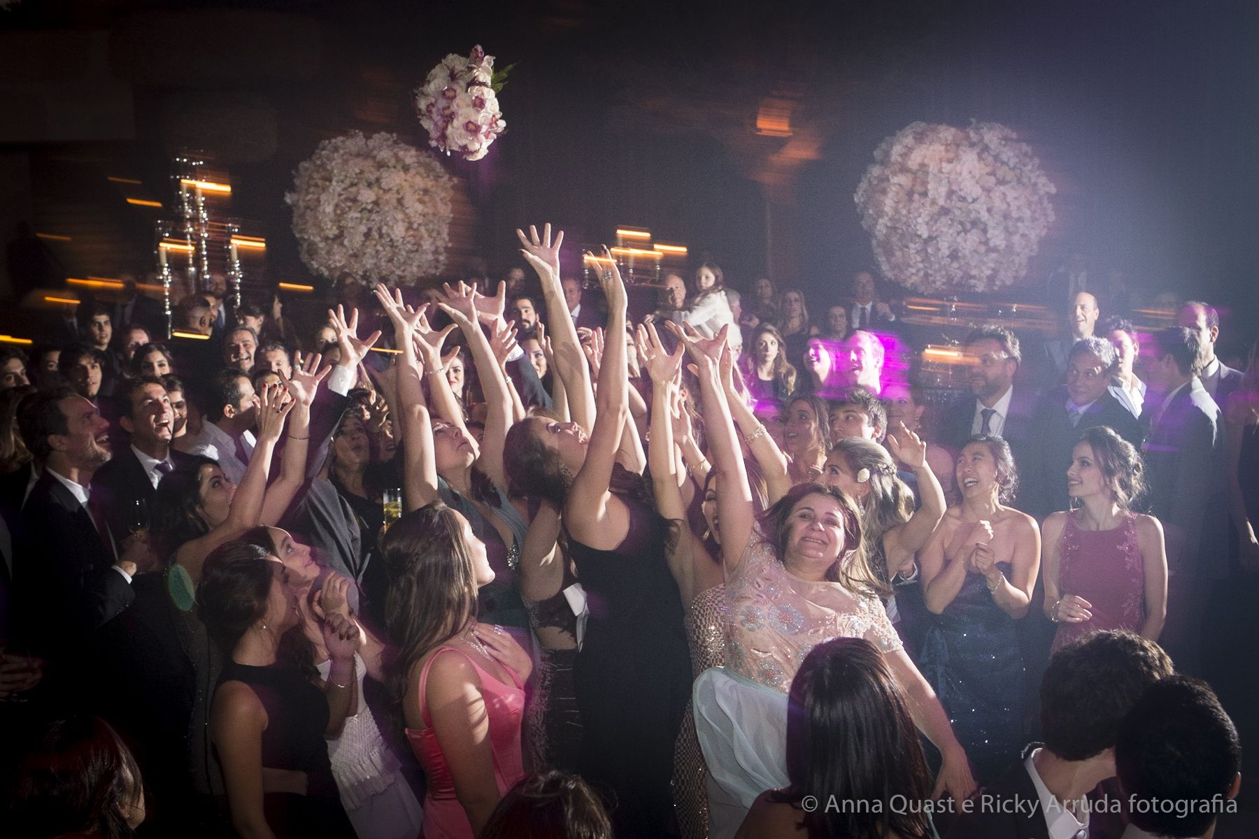 Aos poucos, a Ju foi se mostrando uma noiva mais delicada, princesa, que acabou até escolhendo trazer as flores da identidade da sua festa no seu vestido também, mas de maneira menos óbvia, bordadas a linha de seda e aplicadas uma a uma no vestido. Depois da cerimônia o saiote de tule foi removido e a cauda foi presa para a noiva ficar mais “leve” para a pista de dança. E a Ju dançou para valer, a noite inteira.