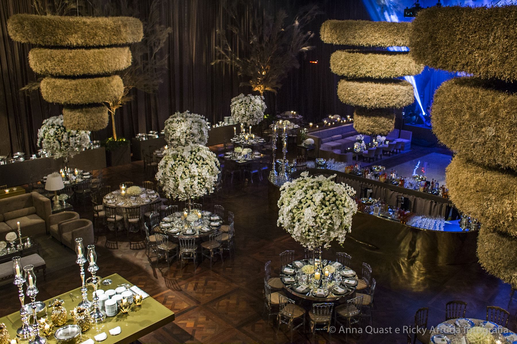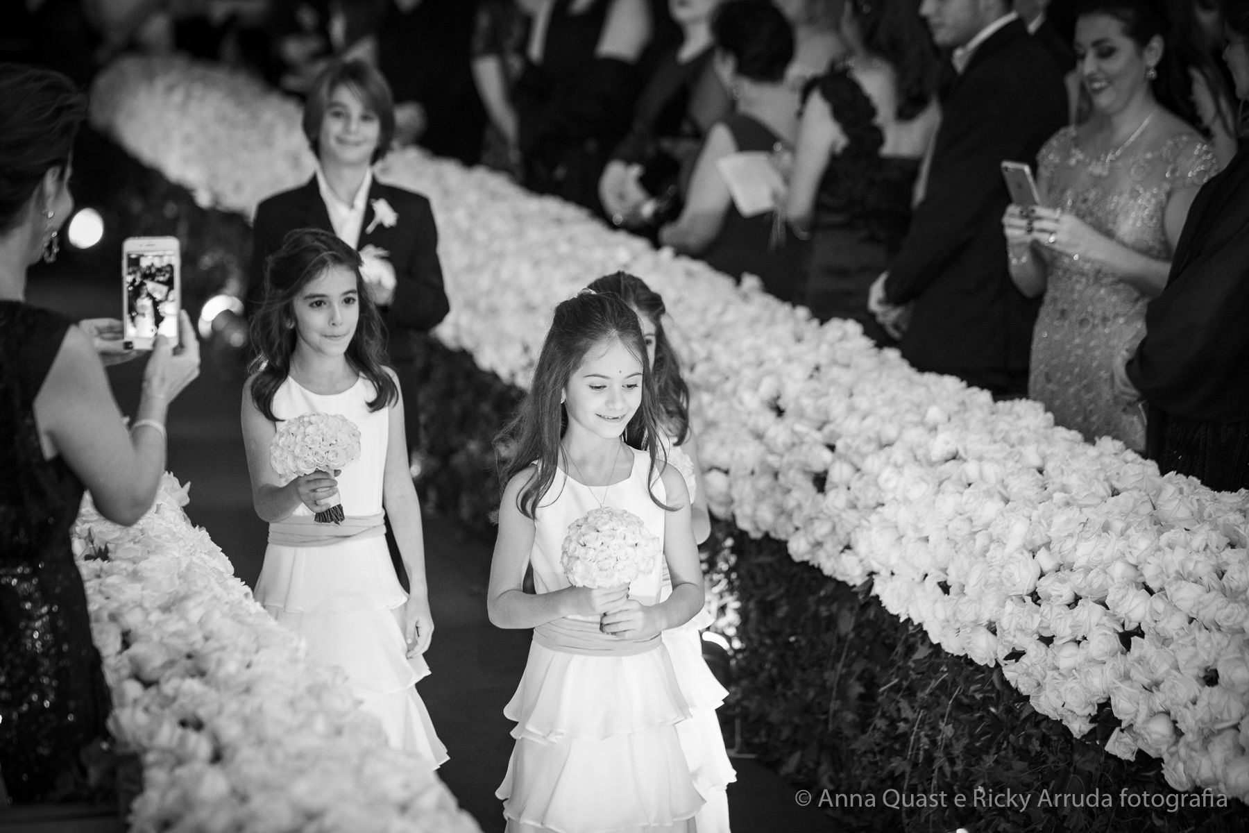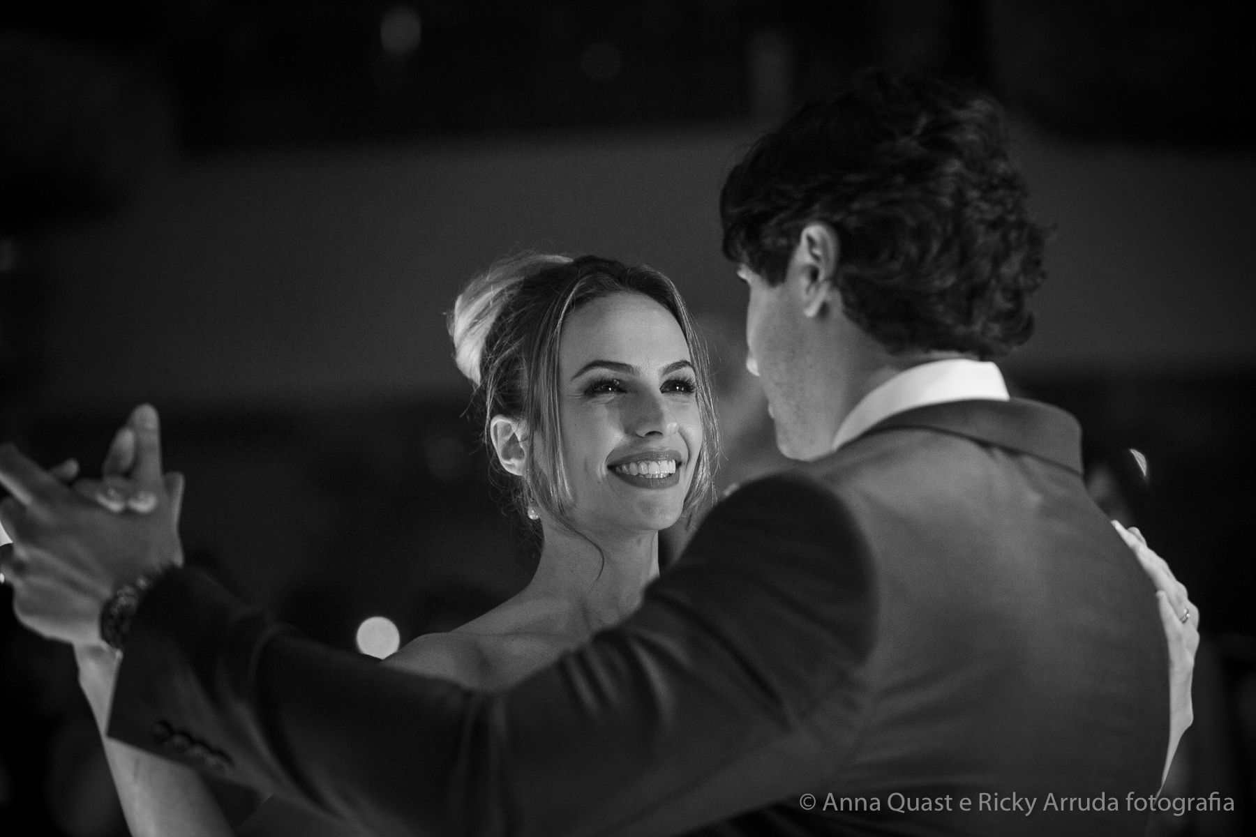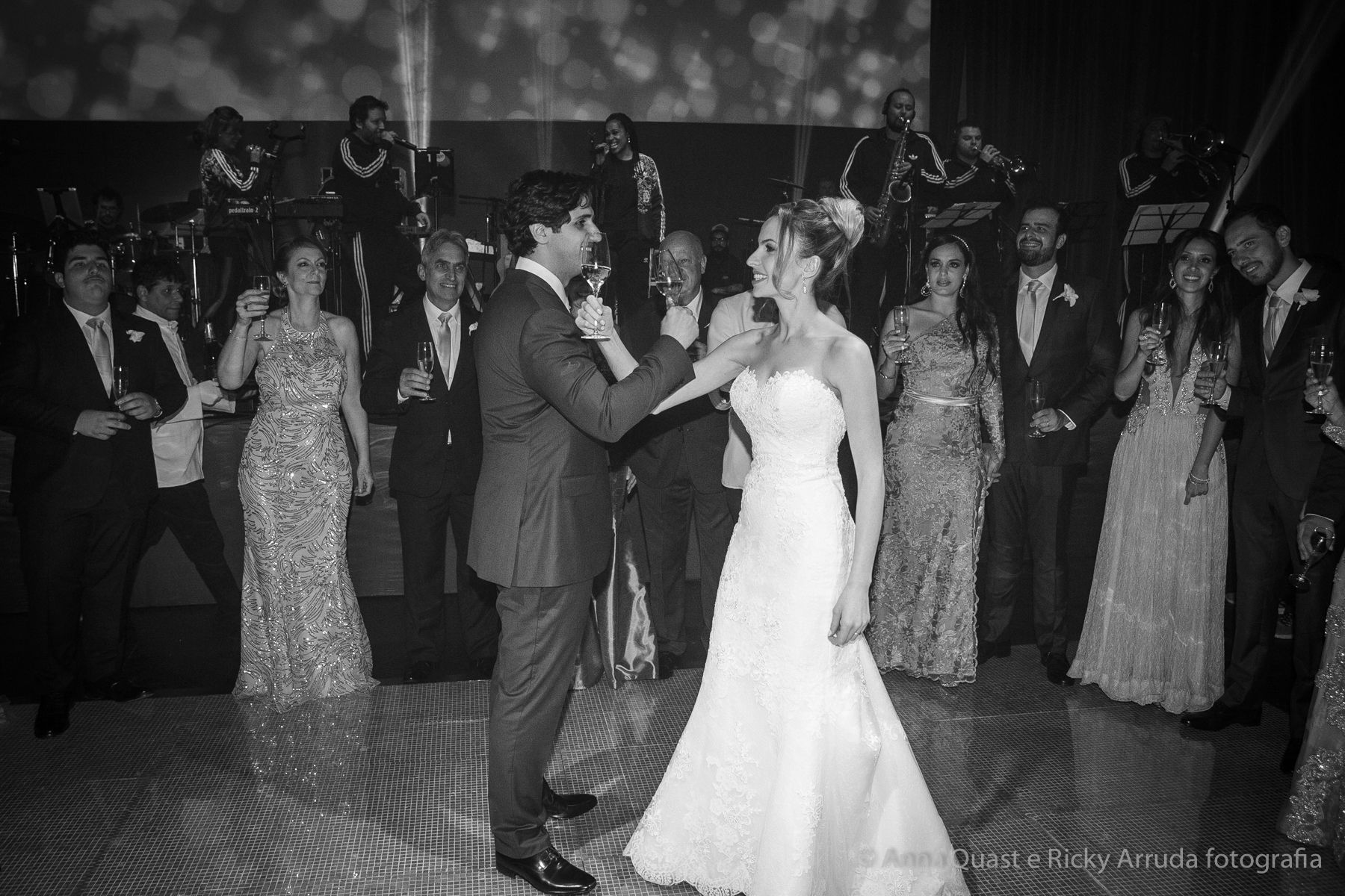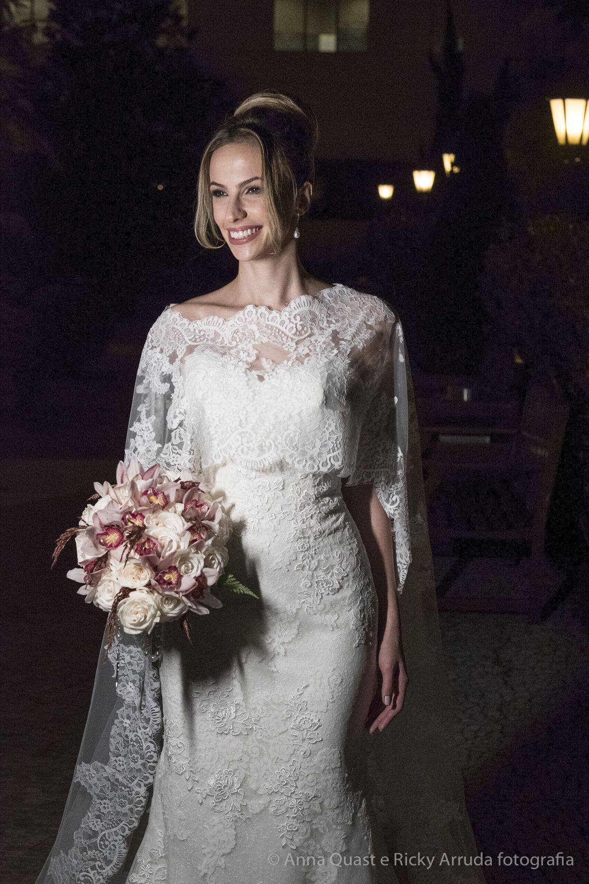 Aos poucos, a Ju foi se mostrando uma noiva mais delicada, princesa, que acabou até escolhendo trazer as flores da identidade da sua festa no seu vestido também, mas de maneira menos óbvia, bordadas a linha de seda e aplicadas uma a uma no vestido. Depois da cerimônia o saiote de tule foi removido e a cauda foi presa para a noiva ficar mais “leve” para a pista de dança. E a Ju dançou para valer, a noite inteira.