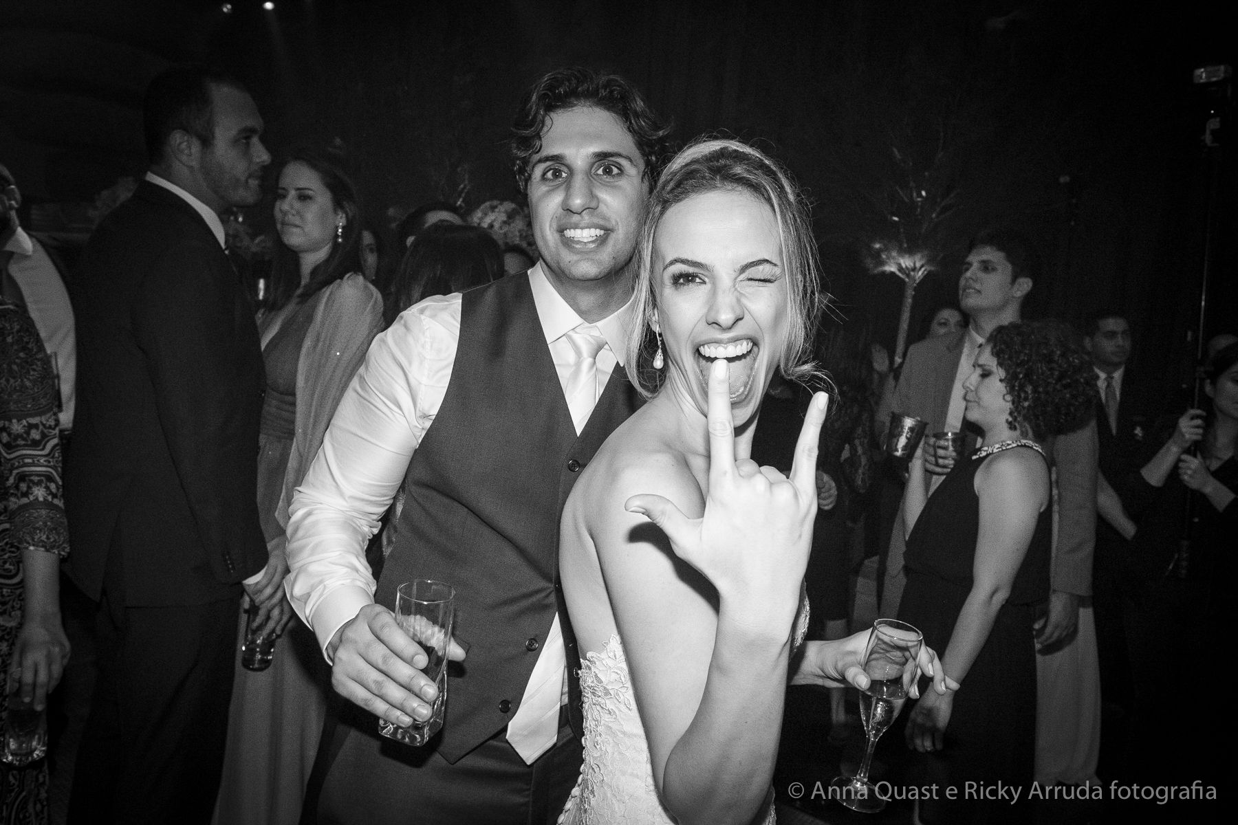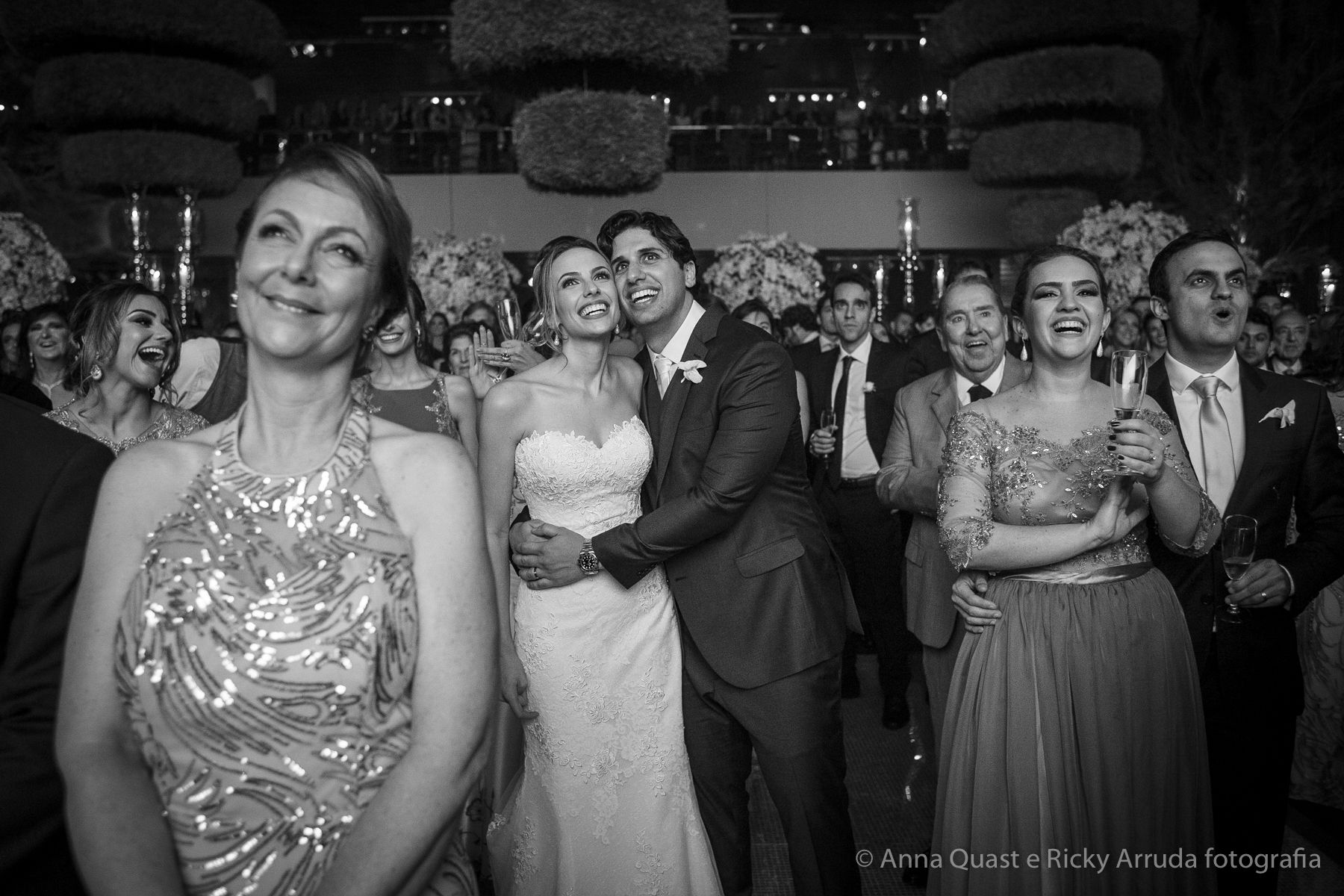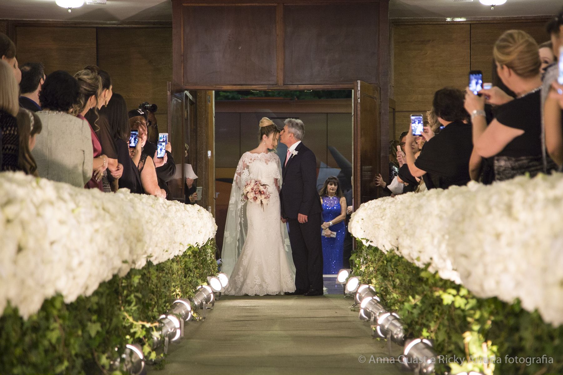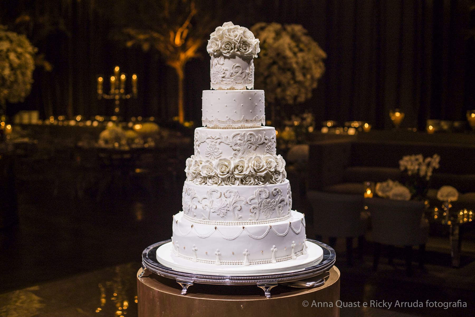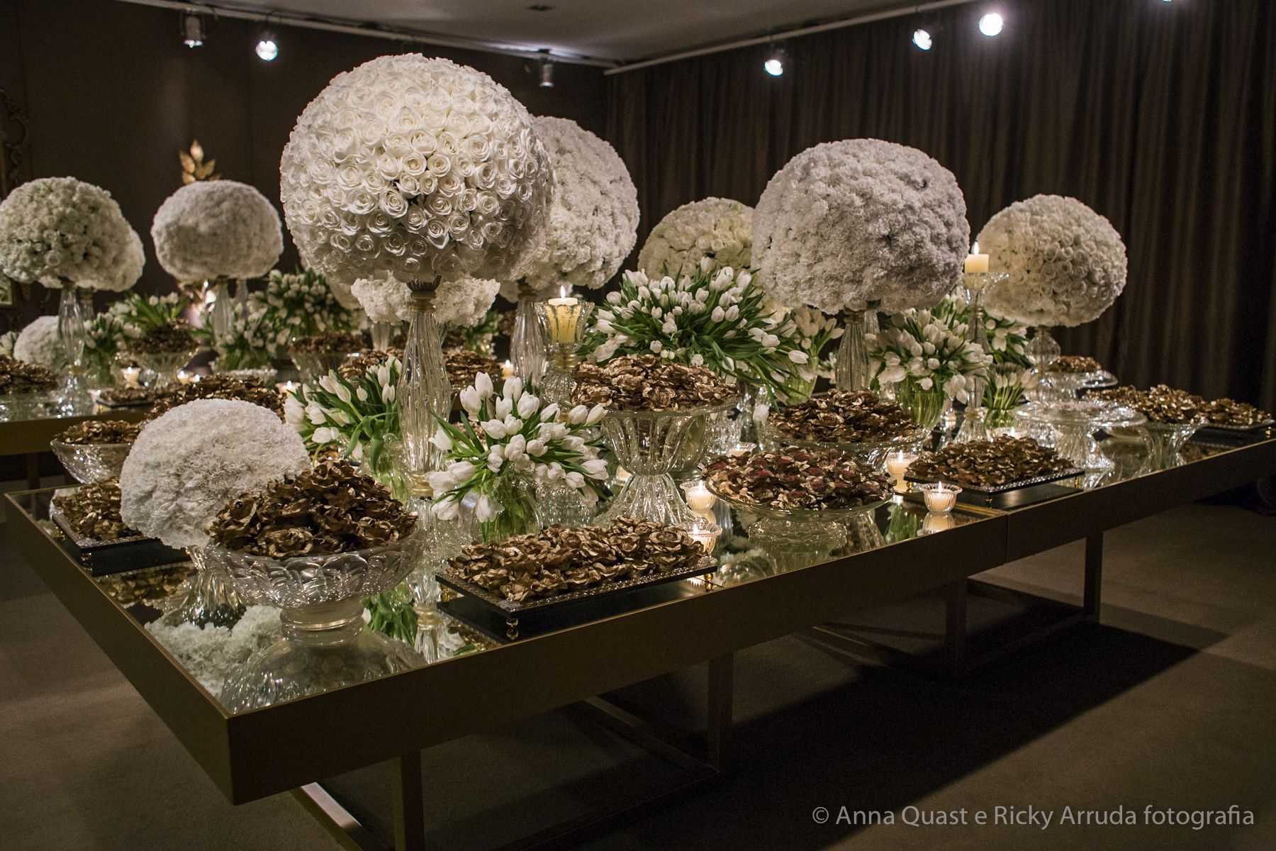 Aos poucos, a Ju foi se mostrando uma noiva mais delicada, princesa, que acabou até escolhendo trazer as flores da identidade da sua festa no seu vestido também, mas de maneira menos óbvia, bordadas a linha de seda e aplicadas uma a uma no vestido. Depois da cerimônia o saiote de tule foi removido e a cauda foi presa para a noiva ficar mais “leve” para a pista de dança. E a Ju dançou para valer, a noite inteira.