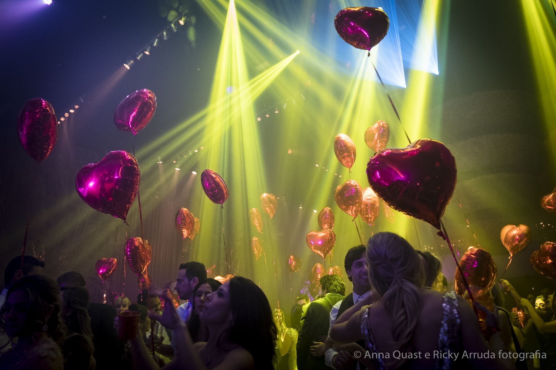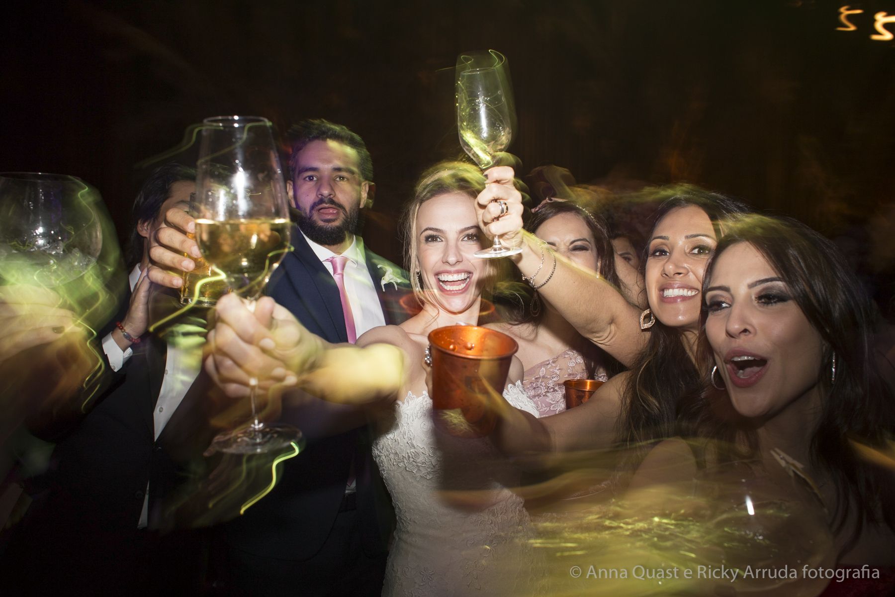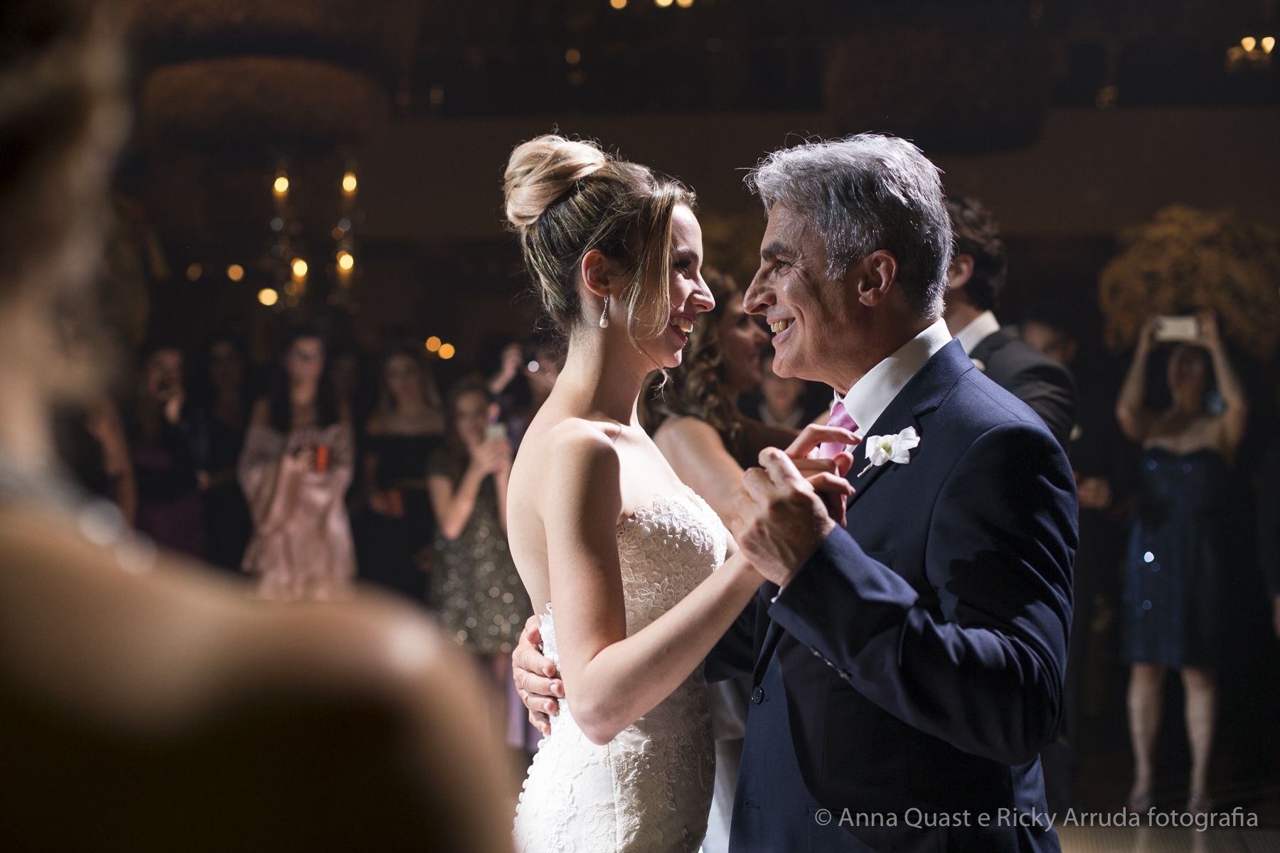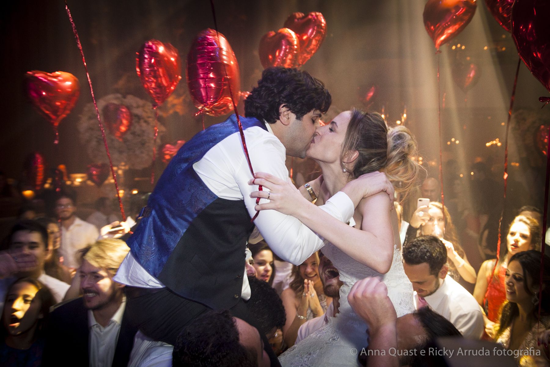 Aos poucos, a Ju foi se mostrando uma noiva mais delicada, princesa, que acabou até escolhendo trazer as flores da identidade da sua festa no seu vestido também, mas de maneira menos óbvia, bordadas a linha de seda e aplicadas uma a uma no vestido. Depois da cerimônia o saiote de tule foi removido e a cauda foi presa para a noiva ficar mais “leve” para a pista de dança. E a Ju dançou para valer, a noite inteira.