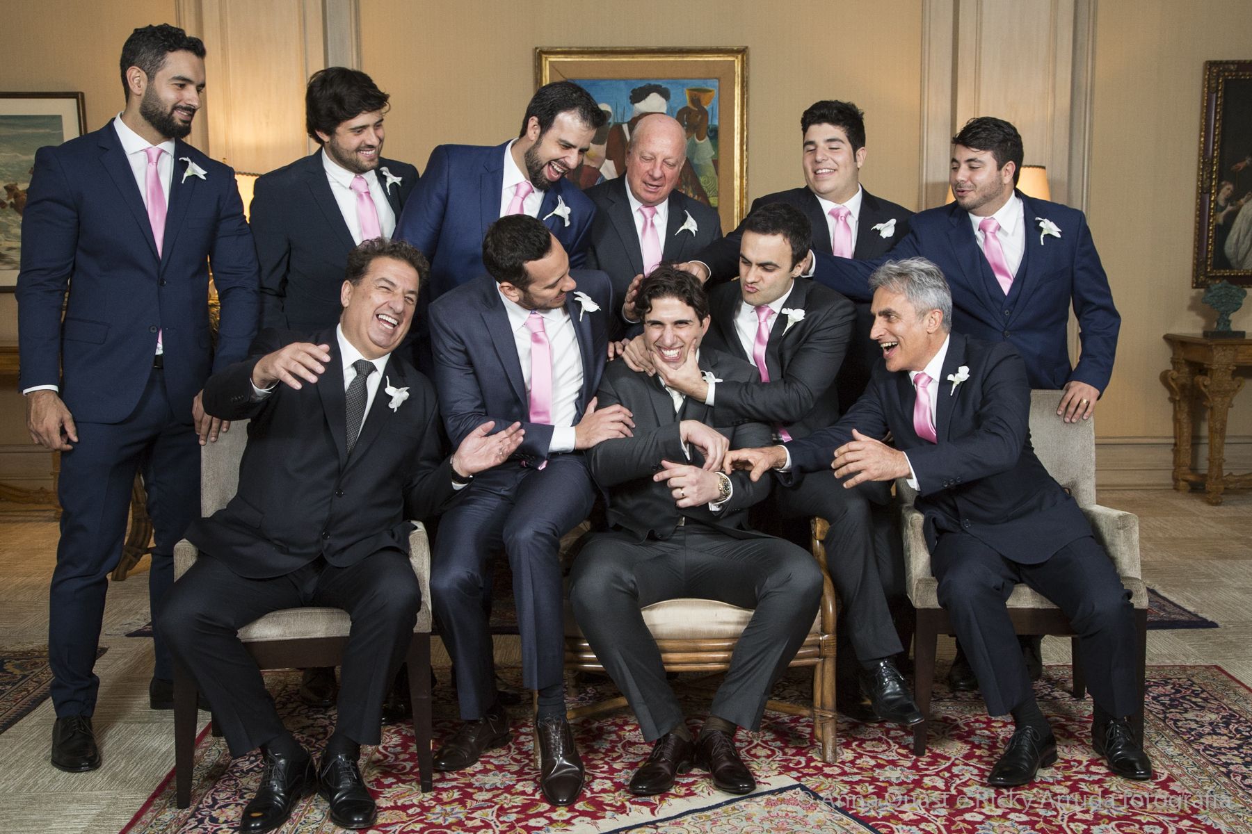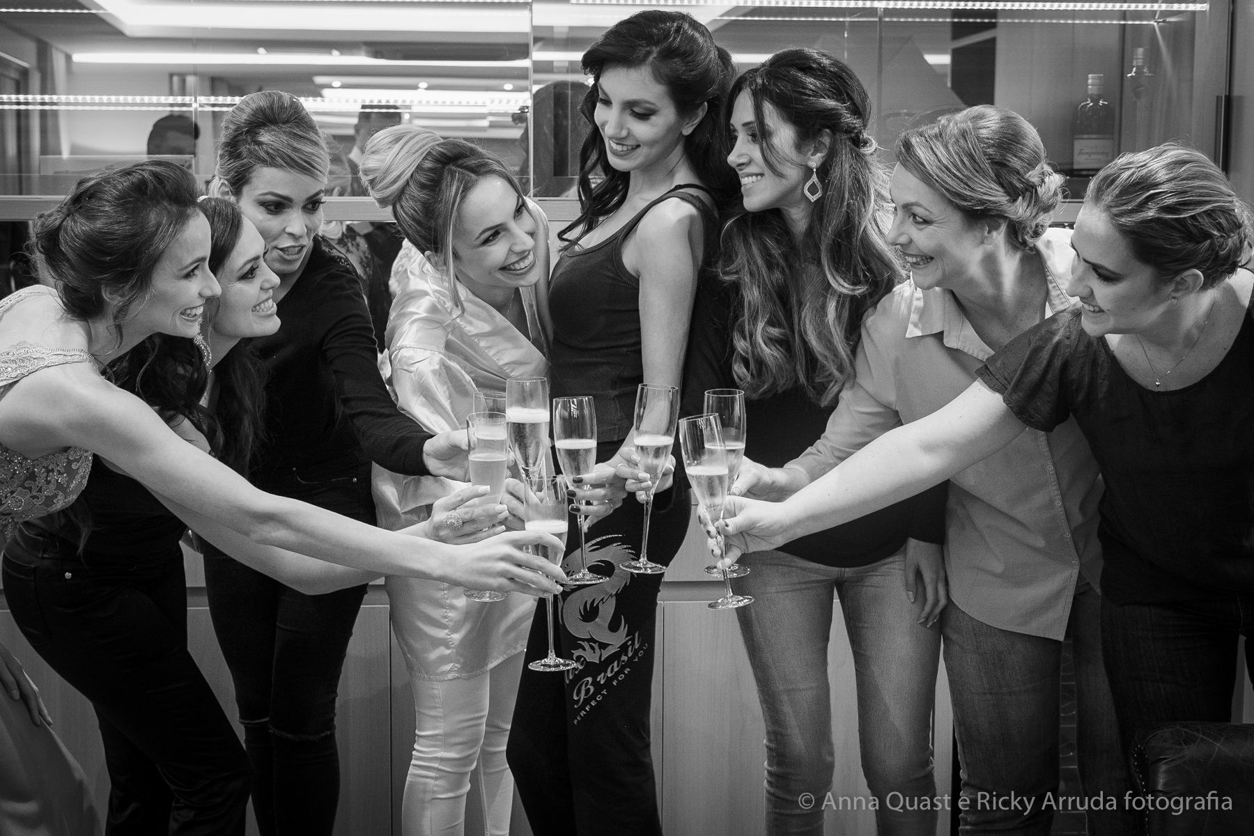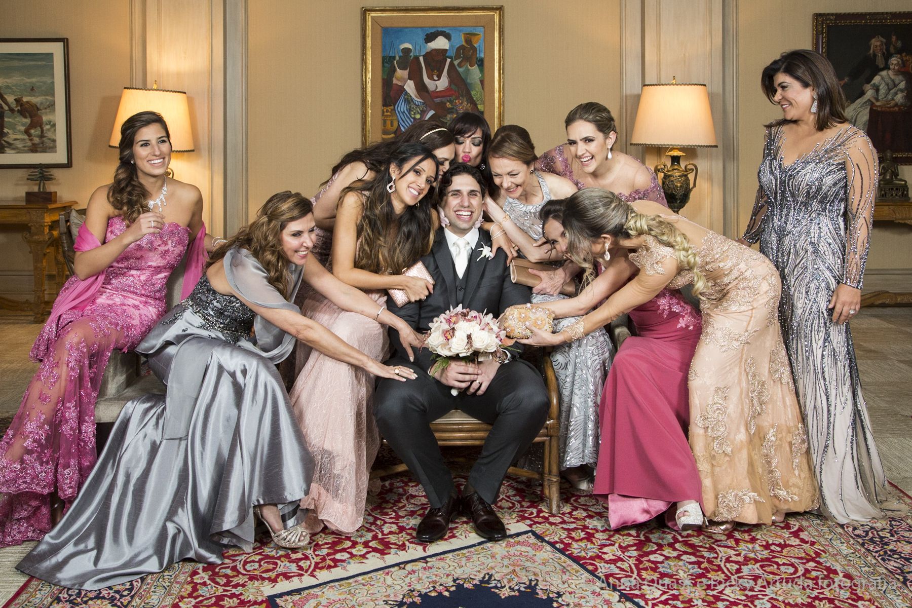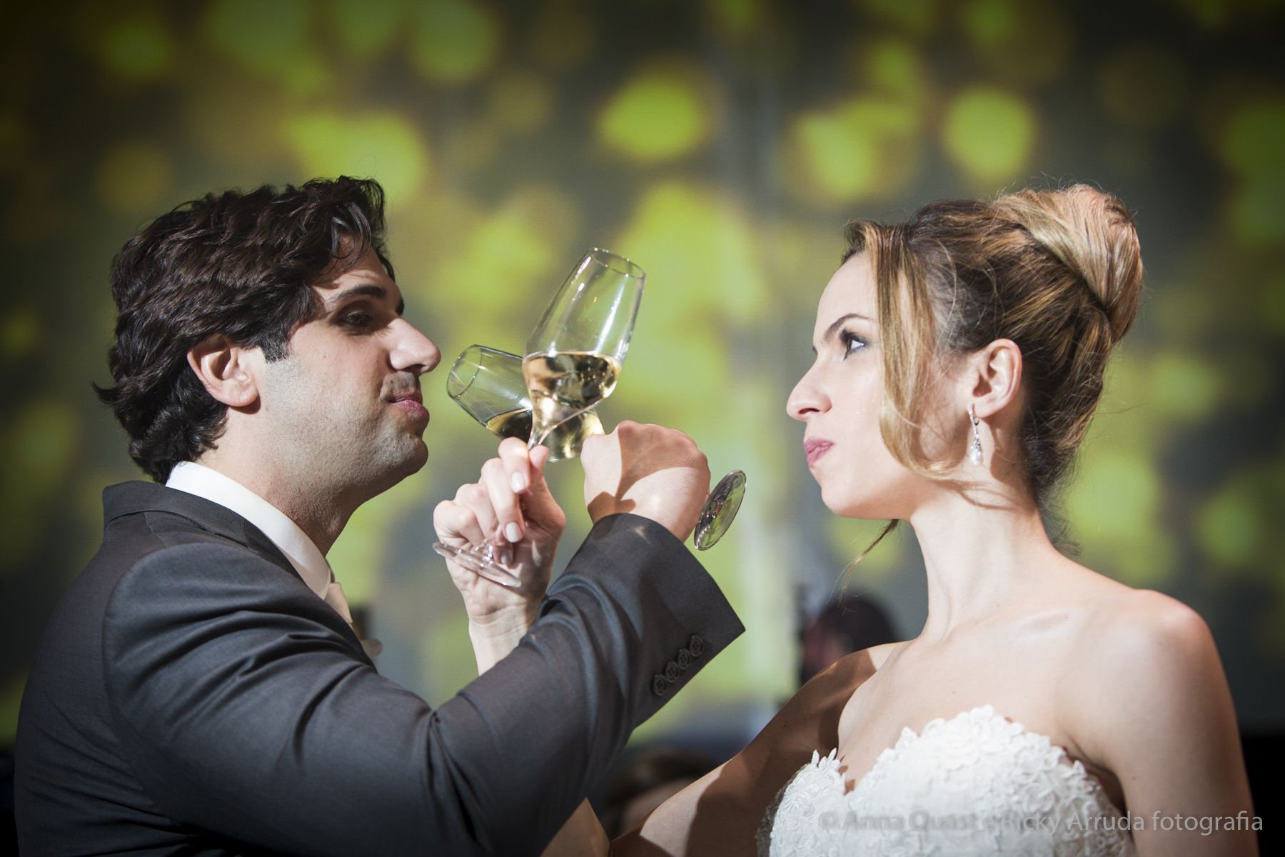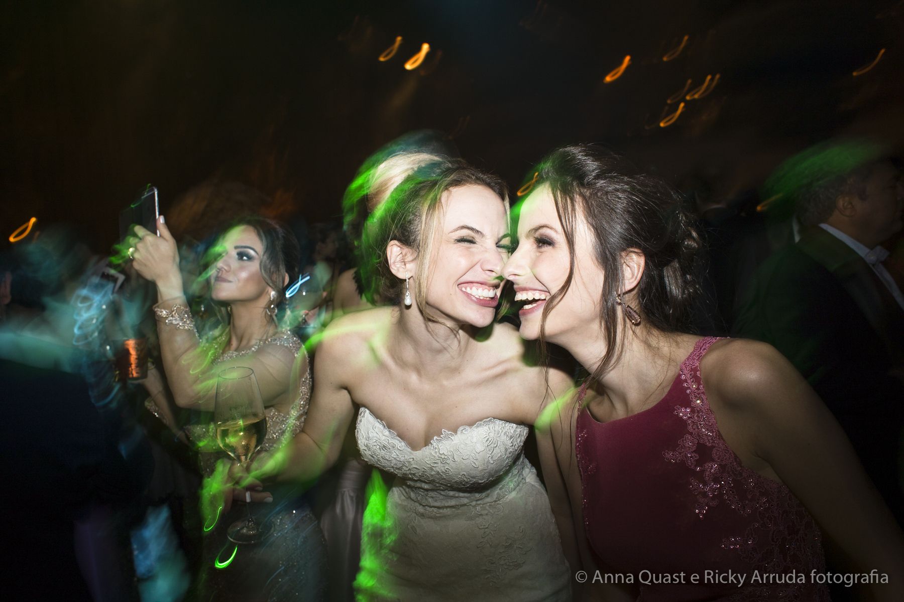 Aos poucos, a Ju foi se mostrando uma noiva mais delicada, princesa, que acabou até escolhendo trazer as flores da identidade da sua festa no seu vestido também, mas de maneira menos óbvia, bordadas a linha de seda e aplicadas uma a uma no vestido. Depois da cerimônia o saiote de tule foi removido e a cauda foi presa para a noiva ficar mais “leve” para a pista de dança. E a Ju dançou para valer, a noite inteira.
