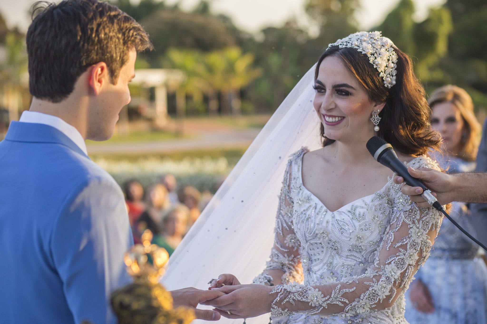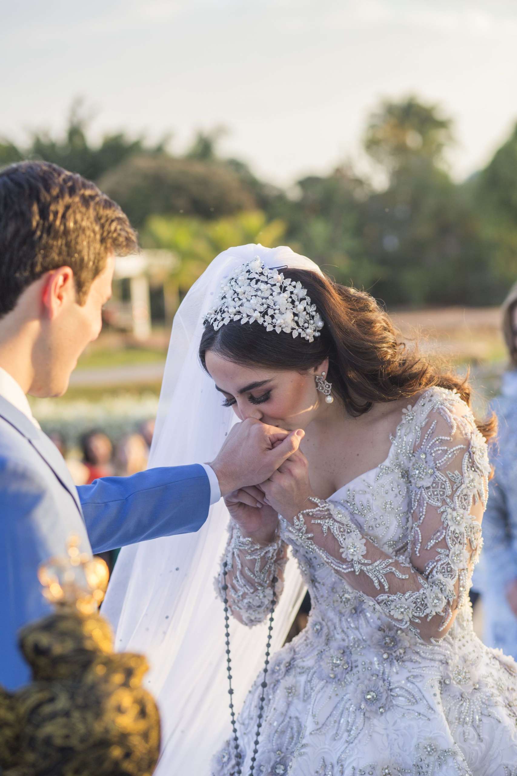 Todos os profissionais que contratei foram pessoas muito especiais. Cuidaram tanto de mim que me senti preenchida e amparada o tempo inteirinho. Quando coloquei o vestido 100% pronto pela primeira vez foi 15 minutos antes da cerimônia, e ele ficou perfeito. Eu queria algo bem diferente e especial, por isso meu vestido não teve renda e nem bordados: ele foi todo feito em organza, pintado à mão depois de pronto. Ficou uma obra de arte! Usei um véu simples, apenas tule sem nenhuma aplicação, o que combinou muito bem com o cenário da fazenda. Coloquei um par de brincos de pérola com brilhantes que pertenceu à minha bisavó, e nas mãos levei durante toda a cerimônia um terço que era da minha mãe. Para os que acreditam, eu acho que ela estava lá, presente o tempo todo, olhando por nós e desejando que fôssemos felizes.