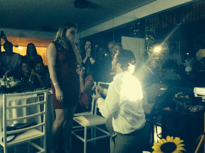Após 5 anos e meio de um namoro muito sério (e não um namoro de conto de fadas, pois tivemos momentos lindos claro, mas também tivemos momentos difíceis, que nos uniram ainda mais!) eu já achando que estava mais do que na hora de darmos um próximo passo no nosso relacionamento, afinal, desde o início sempre falamos muito sobre casar e ter filhos (nosso grande sonho!), eis que comecei a notar diversos indícios de que esse momento tão especial estava chegando. Ele não querer viajar no feriado que eu queria, me ouvir falar sobre o assunto “casamento” sem argumentar, reclamar de eu ter pintado a unha de verde para abertura da copa do mundo, meus primos de Manaus em SP sem programação para um sábado à noite.. eu tinha certeza que seria pedida em casamento naquele dia 14 de junho de 2014, só que por dentro eu fazia de tudo pra mostrar que não esperava, inclusive complicava um pouco as coisas! Rs. Sábado com meus primos em SP, como de costume, fizemos o roteiro turístico.. Batemos perna na 25 de Março e depois fomos comer comida japonesa na Liberdade. E o Guedes trabalhando, como também era de costume. Porém, este era o dia do aniversário da minha madrinha, e minha mãe resolveu fazer um bolinho em casa para ela. Só que ela chamou toda a minha família pra esse bolinho, não me pediu ajuda em nada (sendo que sou sempre a responsável por encomendar os comes e bebes), e ainda me forçou a ir ao salão arrumar o cabelo! Após toda a maratona turística e meu primo o tempo todo saindo de perto para falar no celular, cheguei ao salão e além da hidratação, a cabelereira começou a enrolar meu cabelo, testar maquiagens em mim, e detalhe, a manicure sacou um esmalte branco sem eu pedir! Pronto, tive certeza absoluta que seria o dia do “sim”. Estava voltando a pé para casa, já super nervosa e ensaiando minha “naturalidade”, quando vi todos os meus amigos andando em direção ao meu prédio com rosas na mão!!! Foi lindo, mas eu não queria estragar a surpresa, então virei de costas, voltei para trás para eles não me verem e fiquei conversando com os taxistas do ponto ao lado do meu prédio, rs! Ouvi um murmurinho, até que eles vieram cantando parabéns para disfarçar (pois uma semana depois seria o meu aniversário de 27 anos). Virei para eles agradecendo e chorando e subi correndo para casa, afinal, eu precisava me arrumar, tinha passado o dia todo andando no centro, rs!