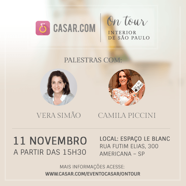 É um prazer anunciar que o primeiro Casar.com On Tour – Interior de SP. O evento será dia 11 de novembro a partir das 15:00 no Espaço Le Blanc. O buffet será da Claudia Porteiro e a decor do Fernando Reame Decorações!! Será uma tarde deliciosa recheada de surpresas. E, as 15:30 terá uma palestra incrível com a Vera Simão (fornecedores de plantão, vocês não podem perder!!) e as 18:00 com euzinha (ninguém pode perder também rsrs)!!