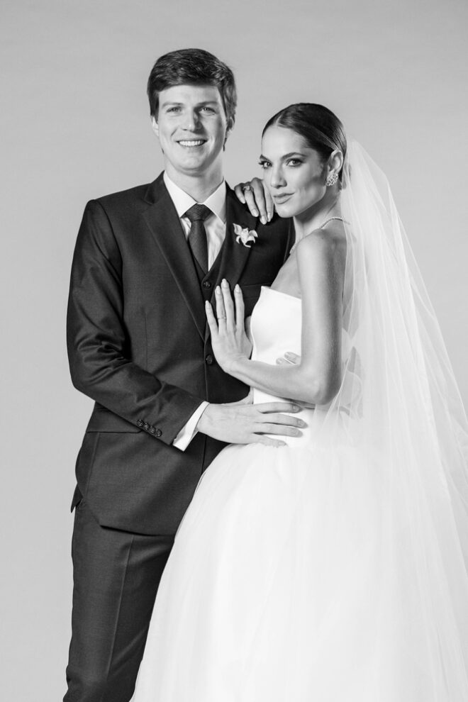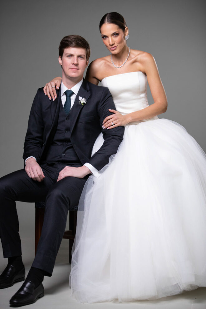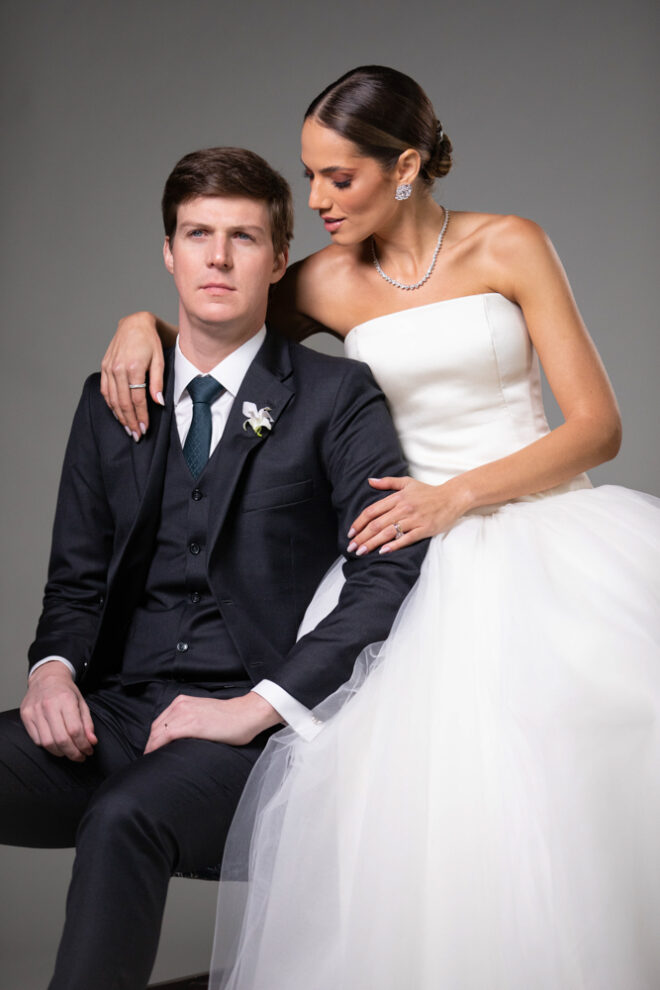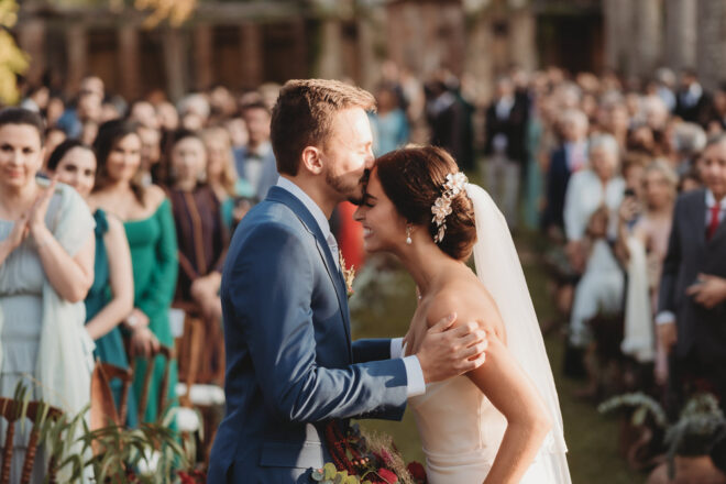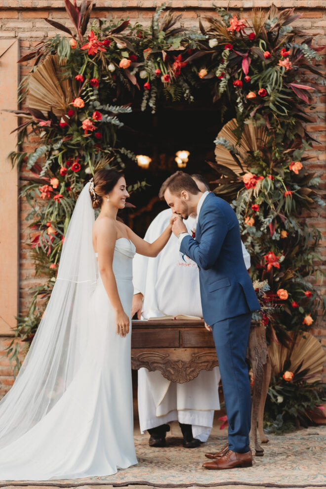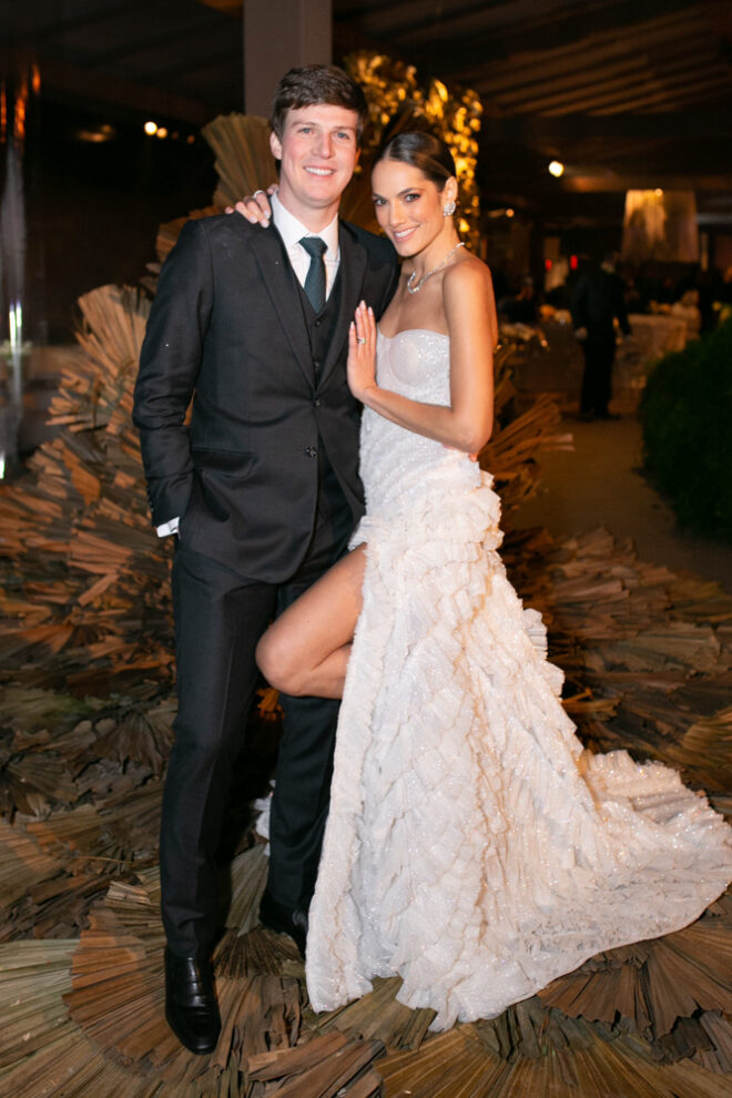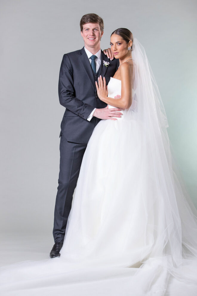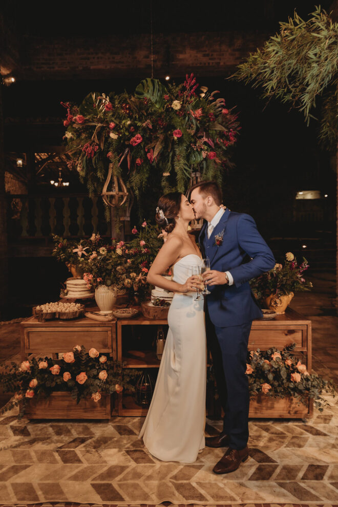 Nós nos conhecemos desde os 15 anos, o Kim foi meu primeiro namorado. Acabamos nos separando por 8 anos, mas o destino nos juntou de novo. Namoramos por 5 anos e o pedido de casamento foi feito em Zermatt em cima de uma montanha, no lugar que a gente mais ama, com neve, frio… e o casamento tão sonhado veio depois de tantas remarcações pela pandemia. Iamos casar no dia dos namorados ano passado, e este ano então decidimos manter a data e casar 11 junho, véspera do dia dos namorados, pois amamos frio e queríamos bem no inverno.