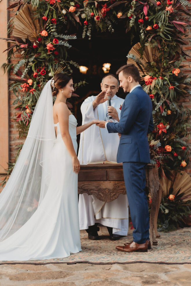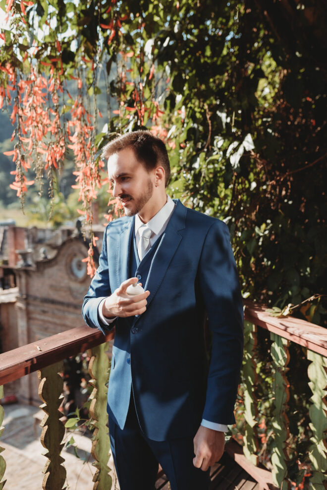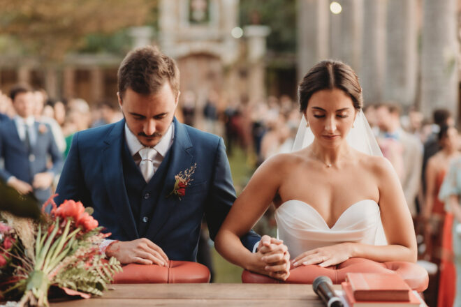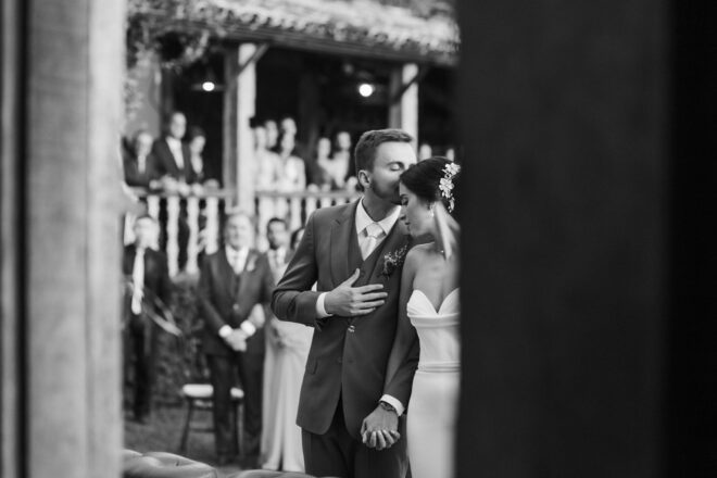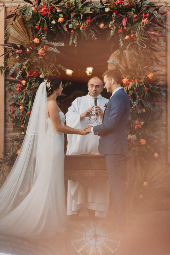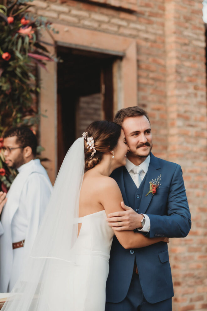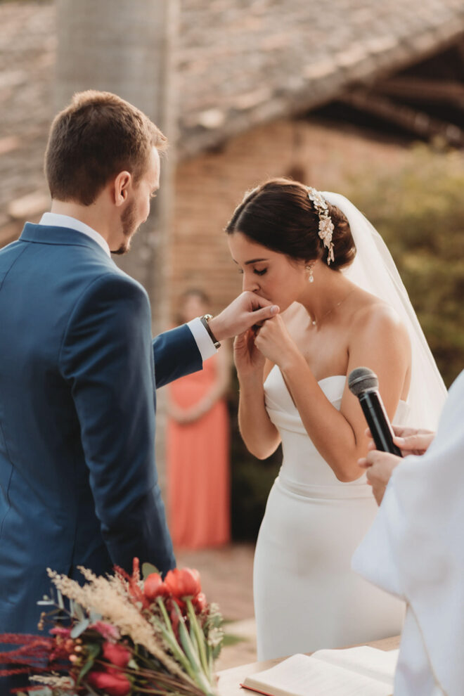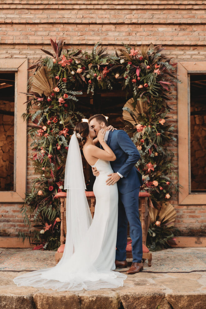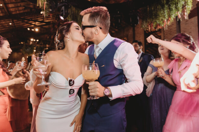 Nós nos conhecemos desde os 15 anos, o Kim foi meu primeiro namorado. Acabamos nos separando por 8 anos, mas o destino nos juntou de novo. Namoramos por 5 anos e o pedido de casamento foi feito em Zermatt em cima de uma montanha, no lugar que a gente mais ama, com neve, frio… e o casamento tão sonhado veio depois de tantas remarcações pela pandemia. Iamos casar no dia dos namorados ano passado, e este ano então decidimos manter a data e casar 11 junho, véspera do dia dos namorados, pois amamos frio e queríamos bem no inverno.