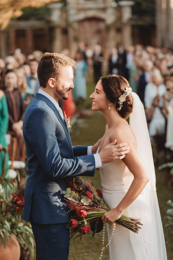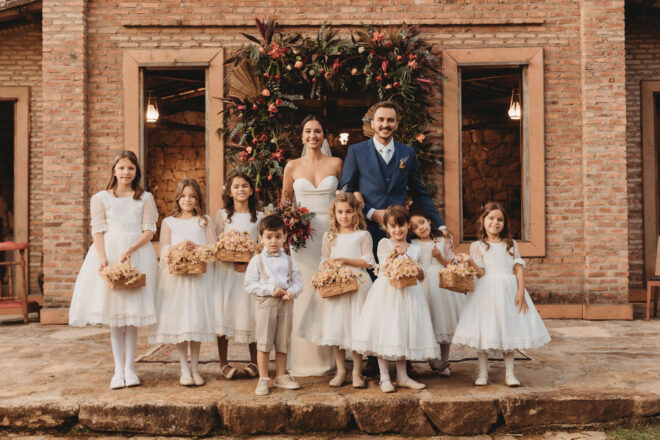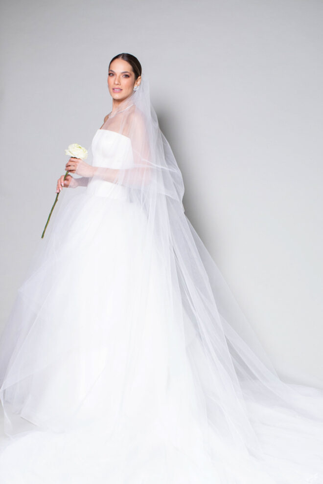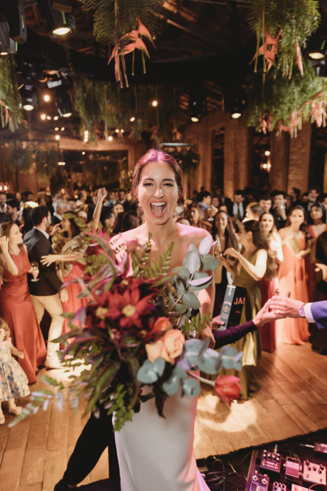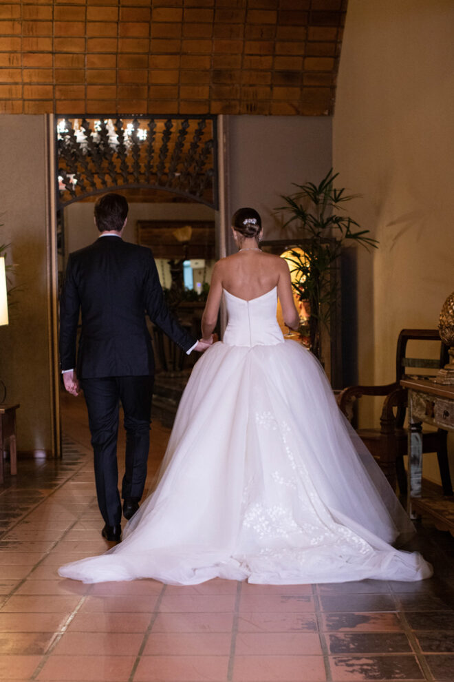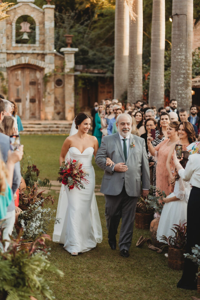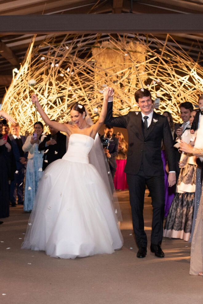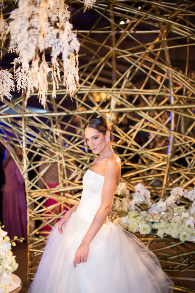 Vamos falar da beleza da noiva, que estava com um ar clean em uma extrema elegância. O penteado e a make ficaram belíssimos, e o vestido by Camila Fraga construído para realizar um sonho, em cetim de seda italiana, com tule francês e um lindo volume. AMEII!