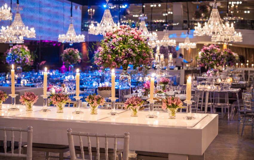 Após o coquetel os convidados foram recepcionados no Salão Terreo da Casa Petra. O conceito para este momento era uma festa design , clean e ao mesmo tempo sofisticada. Os materiais explorados foram, vidro, espelho, acrílico e cristal. Alias, muitos cristais, foram 20 lustres no total.
