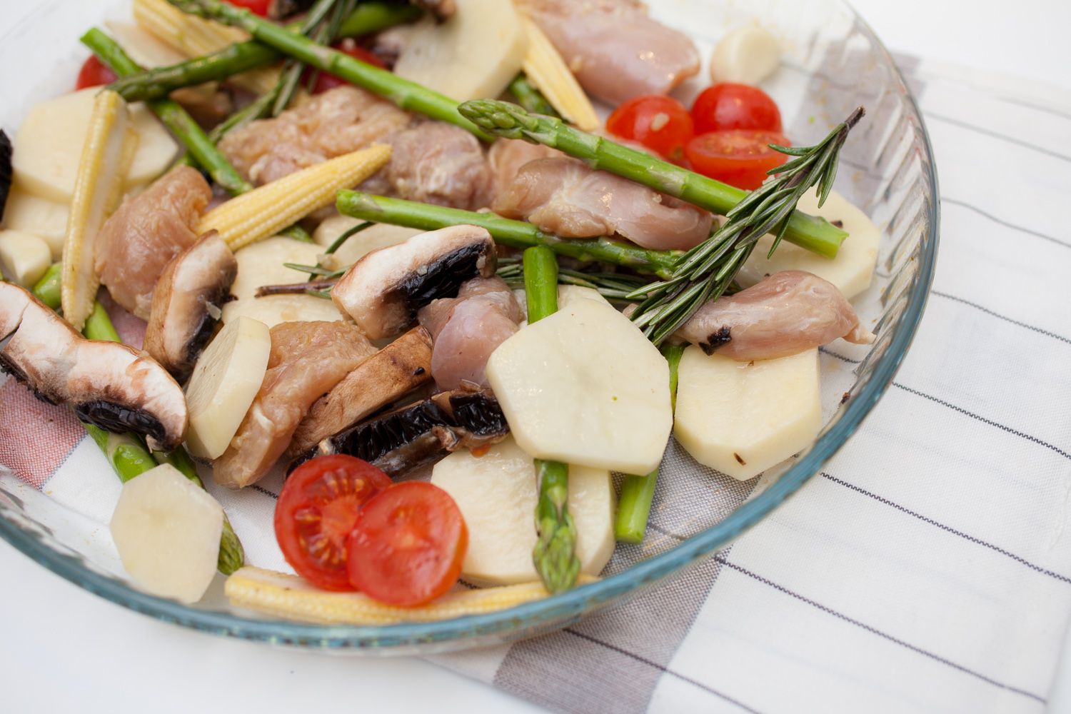 – Enquanto o frango está marinando, aproveite para lavar e cortar os legumes. Corte os milhos e os tomates ao meio; o cogumelo em pedaços menores na horizontal (lembrando que ele diminui muito de tamanho e por isso não é bom cortar muito pequeno), e corte cerca de 3 dedos do talo do aspargo (a parte que costuma ser mais dura). Descasque a batata e corte em rodelas o mais fino que conseguir (um pouco mais finas que as da foto seria ideal pois as minhas acabaram ficando um pouco grossas) para cozinhar mais rápido.