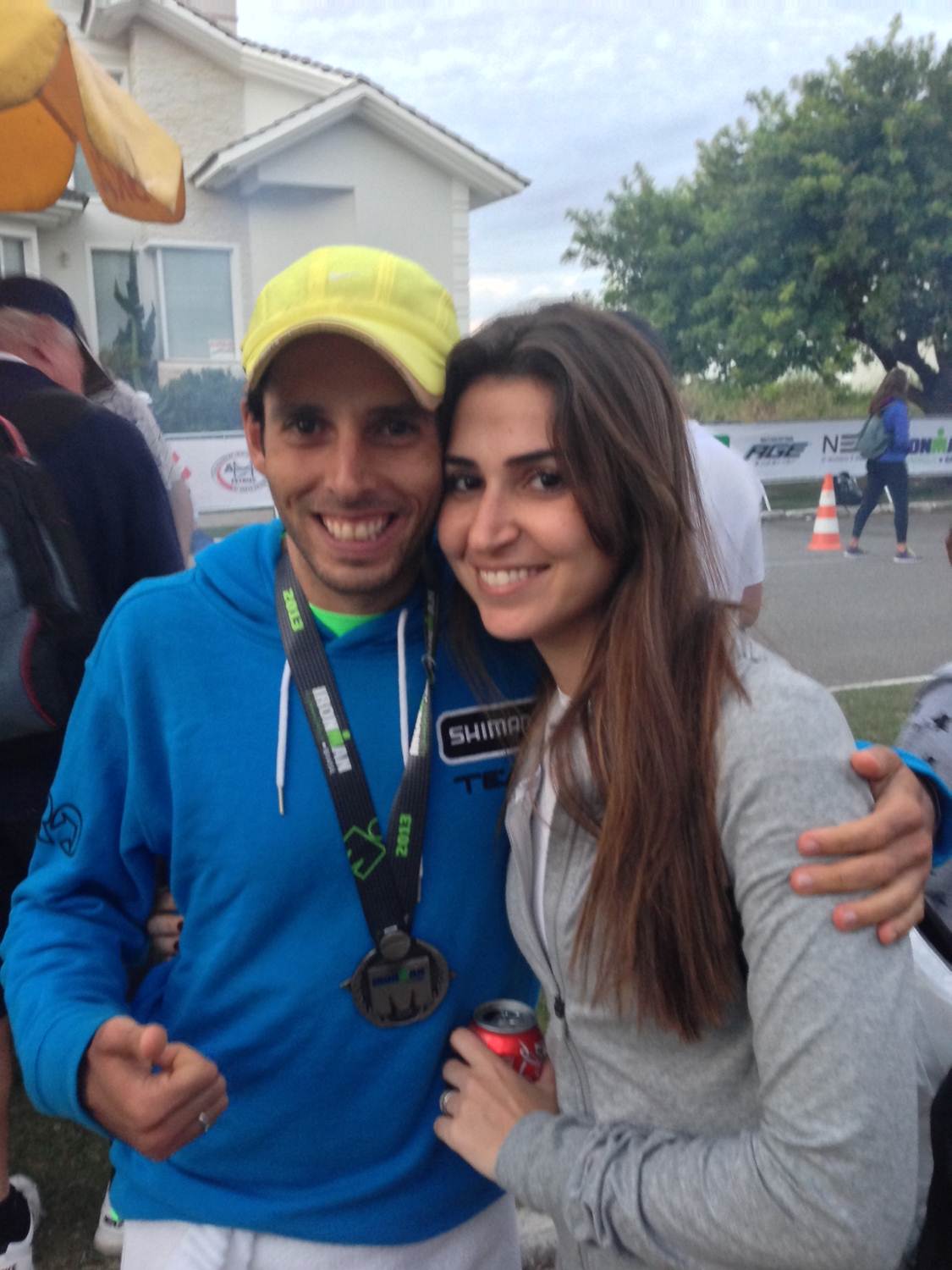 Enfim, a prova chegou. Fiquei uma pilha de nervos por ele… nem pensei em casamento. Fiquei preocupada com o rendimento dele, as expectativas que ele tinha, se cumpriria. Foram horas e mais horas em pé aguardando ele passar de bike, correndo, saindo da natação. Não comi, não bebi… não fiz nada só esperando ele passar a cada quilometro que eu poderia acompanhá-lo.
