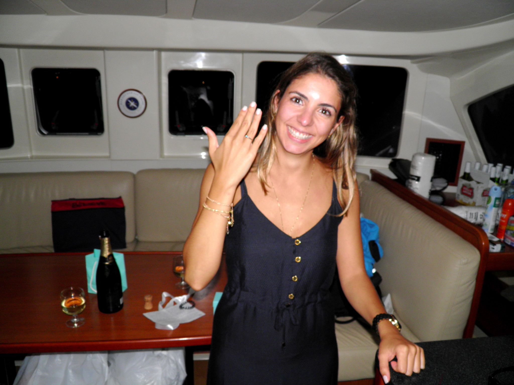 Cheguei no barco, desci e comecei a arrumar a mala. Ele ficou lá em cima, “descansando” e ouvindo música. Uma hora me chamou pedindo ajuda para mexer na máquina, eu fui até la, ajudei ele e quando virei vi que em cima da mesa tinha champagne, uma caixinha e uma carta. As borboletas voltaram a milhão, as pernas ficaram bambas e os olhos se encheram de lágrimas. Quando fui ler a carta vi que na verdade era uma que eu tinha escrito a ele no final do ano dizendo o quanto o amava e o quanto queria passar todos os próximos anos da minha vida ao lado dele. Quando terminei de reler a carta, ele perguntou se tudo o que estava escrito era verdade. Eu disse que sim (agora já não eram só as pernas que tremiam, mas as mão e a voz também) e então veio a pergunta mais esperada por todas (ou quase todas) as mulheres: “Você quer se casar comigo?”. As lágrimas escorreram, abrimos a caixinha, colocamos o anel e a tremedeira finalmente deu espaço a uma alegria indescritível e sem fim!! Brindamos, tiramos fotos, comemoramos e deitamos abraçados no Believe, olhando o céu estrelado de Hope Town e agradecendo MUITO ao universo por merecermos um ao outro.