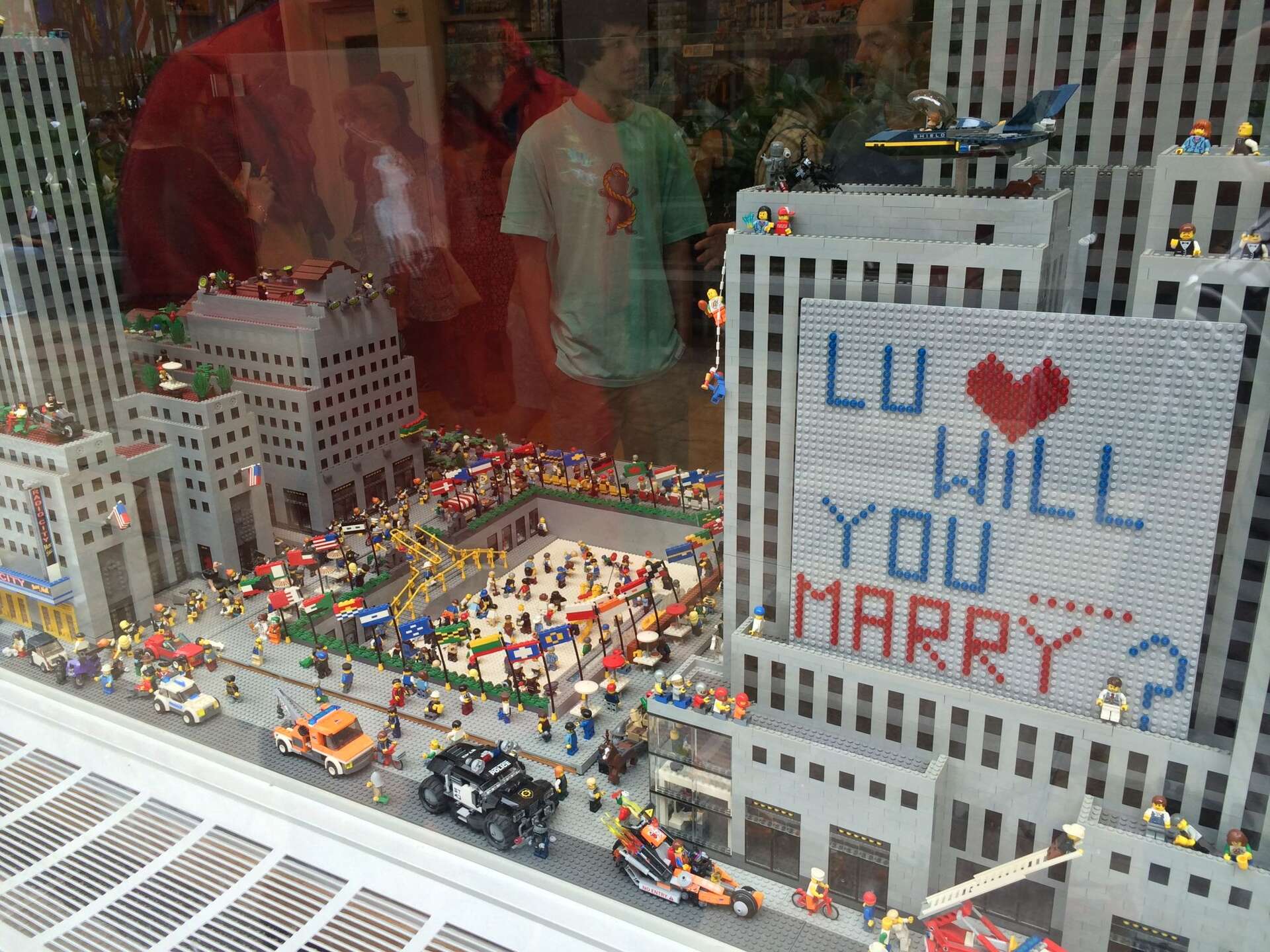 Aí, ele falou: “Não vamos embora ainda não, olha ali!”… E apontou! Aí eu olhei para o lado direito, e havia um “plate” de Lego, como se fosse um “outdoor” na reconstituição do Rockefeller escrito: LU… WILL YOU MARRY… (e um bonequinho parecido com ele, de terno e barbinha! Já que não coube a palavra ME) Eu comecei a tremer e a chorar. Ele tirou a caixinha do bolso, e me falou: Então… você quer?