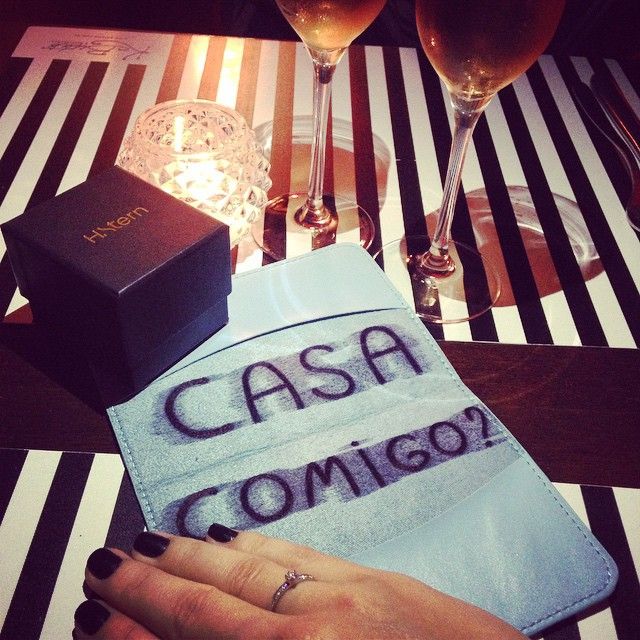 Na sexta feira o Pedro não parava de falar sobre um bistrô super bacana que queria me levar e que até tinha feito uma reserva, mas eu não desconfiei nada, tanto é que quando chegamos o lugar estava vazio (tb eram 20:00 horas) e sugeri irmos para outro lugar mas ele me convenceu.  Já sentados na mesa ele me perguntou se eu queria tomar um champanhe e lógico que na hora eu pensei “que estranho, ele é tão seguro, será que quer gastar?!” Eu disse que não precisava e que acompanharia ele na cerveja, conversa vai conversa vem, senti um clima estranho no ar, acho que é sexto sentido de mulher e logo perguntei: “Lindo, tá acontecendo alguma coisa? É hoje que você vai me fazer uma surpresa?” Na hora ele riu e disse: “Não linda, como vc é boba rsrsrs. Quer dizer na verdade eu comprei uma lembrancinha pra você”. Neste momento eu logo imaginei que seria o anel, mas quando vi ele chegando com uma sacola da Imaginarium logo desanimei… Mas tudo bem. Ao pegar o presente reparei que estava embrulhado de um jeito diferente, daí de novo a expectativa, mas… Era um Porta Passaporte com uma Tag de mala que estava escrito: “A melhor história começa agora”  achei bonitinho tal  e a surpresa maior foi quando abri estava escrito: CASA COMIGO? (YES! O ANEL). Fiquei super contente, achei fofo demais, só que cade o tal do anel? Cheguei a procurar algo a mais na caixa mas não achei nada!