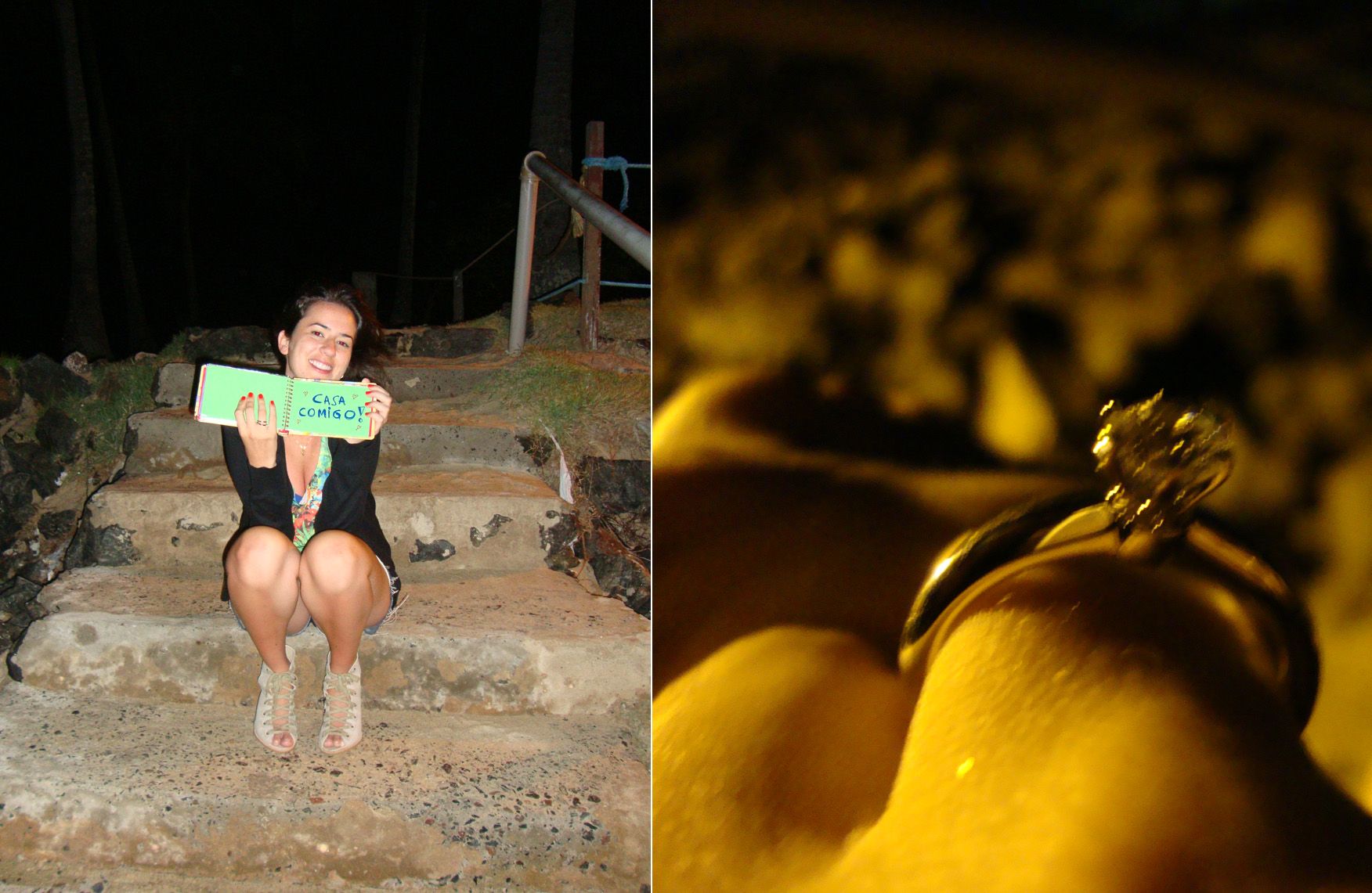Eu não estava desconfiando de nada, na verdade estava bem desanimada com essa história de MBA até que em um dos dias que estávamos lá fomos jantar e depois fomos andar na praia fechada do hotel. Conversa vai, conversa vem ele me deu um caderninho com vááárias coisas escritas em cada página e na ultima estava escrito: “CASA COMIGO” hahaha eu quase não acreditei… Foi tão lindo, pois eu não imaginava mesmo, nem desconfiei de nada, e depois ele me deu o anel mais maravilhoso de todos!!! Foi realmente incrível.