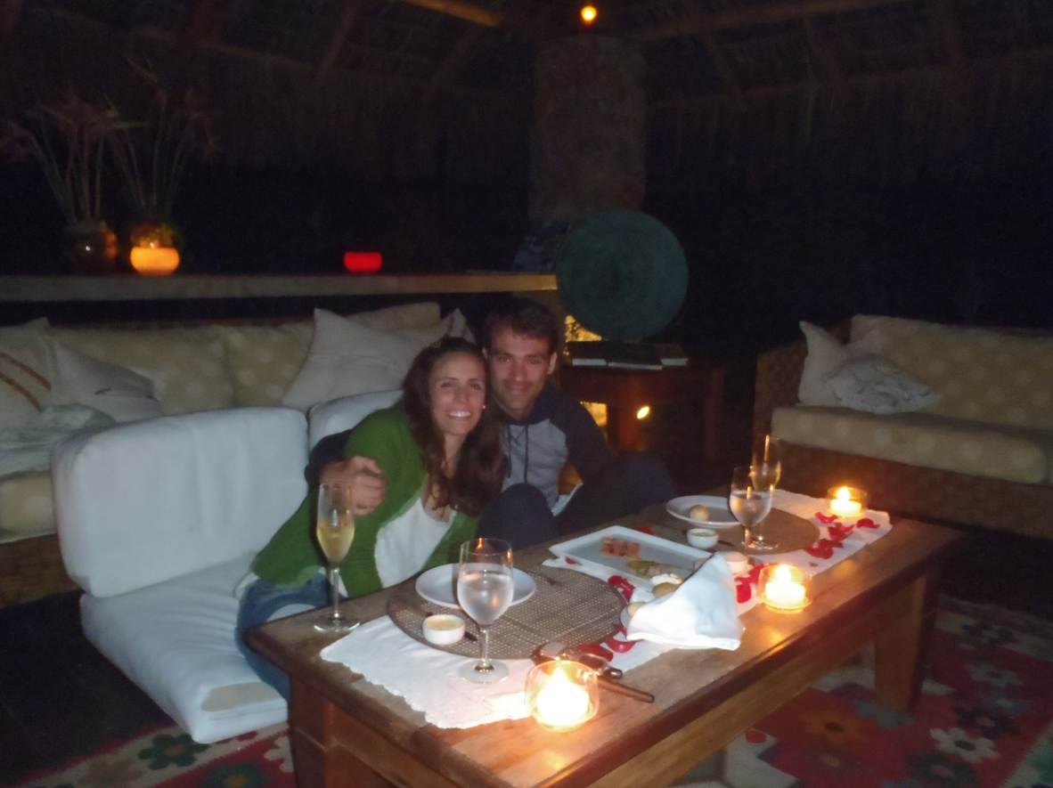 Surpresa maior foi quando, no domingo, ao ligarem da recepção, descobri que tinha um jantar sendo armado para nós dois. Ele não falou muita coisa, só que o chef estava mudando alguma coisa do cardápio. Também não questionei muito, afinal, surpresa é surpresa. Às 21h30 me arrumei e fomos para nosso jantar. Tem uma ilhota na frente do hotel onde estava tudo armado para nós – o que supostamente seria nossa comemoração (1 dia atrasada) de 2 anos – com direito à pétalas de rosas, luz de velas e chuva de granizo tivemos um jantar delicioso! Eu não podia esperar mais nada, quando, na hora da sobremesa chegou A “surpresinha”!!!