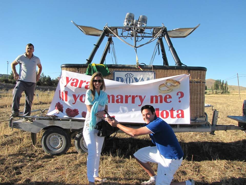 No meio do passeio, ele estava filmando e de repente ele diz: “Acho que esta acabando o passeio, pois parece que a equipe do balão está lá embaixo nos esperando”, e pediu para eu olhar… Estávamos a mais ou menos 200 metros de altura e o baloeiro começou a se aproximar da equipe que estava segurando uma faixa imensa que a princípio não dava leitura e quando nos aproximamos mais vi que estava escrito: “Nayara, will you marry me? Jota.”