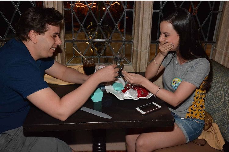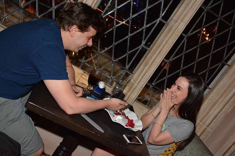 Eu berrei! Mas foi um grito de susto muito alto, que fez o restaurante inteiro parar e ficar em silêncio por poucos segundos, até perceberem o que tinha acontecido e todos começaram a bater palmas e eu chorando com a maior felicidade do mundo! Ele já havia programado tudo com a equipe do Castelo e eu nem desconfiava
